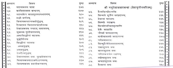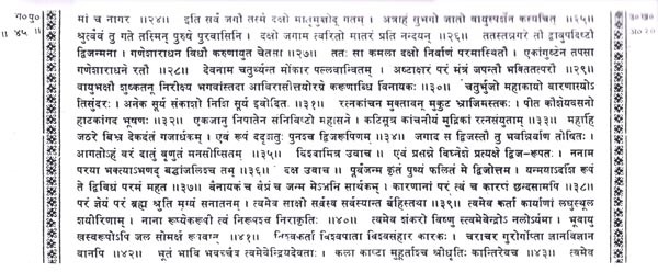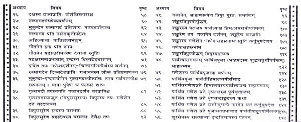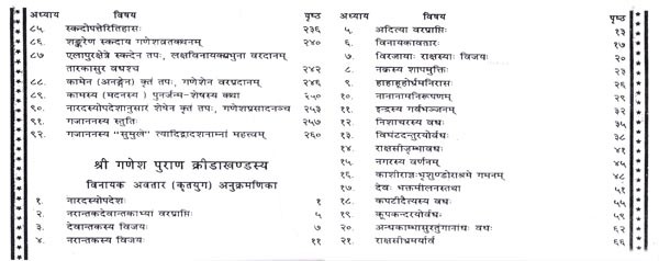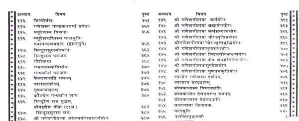 The Ganesa Purana is divided into two Khandas, viz. Upasanakhanda and Kridakhanda. The former consists of 92 chapters (4093 verses) while the latter, of 155 chapters (6986 verses). Taken all together, there are 11079 verses in this Purana.