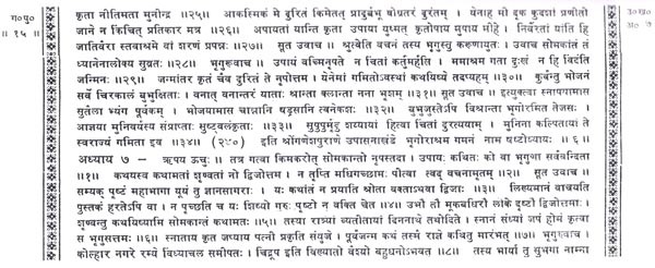 Thus Bhrgu tells Somakanta all about his previous birth and continuity of the fruits of his misdeeds. Somakanta does not however, believe in the story. At this, several birds start attacking him and eating his flesh. The sage, propitiated, however, saves the situation just through his Humkara and the birds fly away. Somakanta is now fully convinced for the futility of his skepticism and falls at the feet of the sage and as advised by the latter has a dip in the pond. The sage also recites the name of Ganesa one hundred and eight times and sprinkles the “mantrita” water on the king. Soon thereafter a monsterous Papapurusa comes out of the body of the king. The sage commands the Papapurusa to take shelter in a nearby tree. As soon as he enters the tree, it is burnt to ashes. The king is now free from ailments. The sage then advised him to listen to Ganesapurana and predicts that if he faithfully listens to him, slowly and gradually the fallen tree will start growing and as soon as it is grown up into a fullfledged tree, he will be absolutely free from all ailments. The sage further says that Vyasa and originally obtained this story from Brahma and that he was able to get it from Vyasa himself. So at this stage Bhrgu retales the story in the form of a dialogue between Brahma and Vyasa.