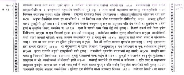 Eventually Somakanta suffers from leprosy. Despite the appeals to the contrary from his ministers, subjects, family members, he desperately prefers to relinquish his throne. The unwilling son-Hemakantha is compelled to succeed him. Somakanta, together with his wife Sudharma and the two ministers - Subala and Jnanagamya quits his kingdom and ultimately reaches a beautiful forest. The king sleeps. The two ministers go somewhere in search for fruits etc. at that moment Sudharma comes across a brilliant child on the bank of a pond and she relates the entire story of her husband’s ailments to him.