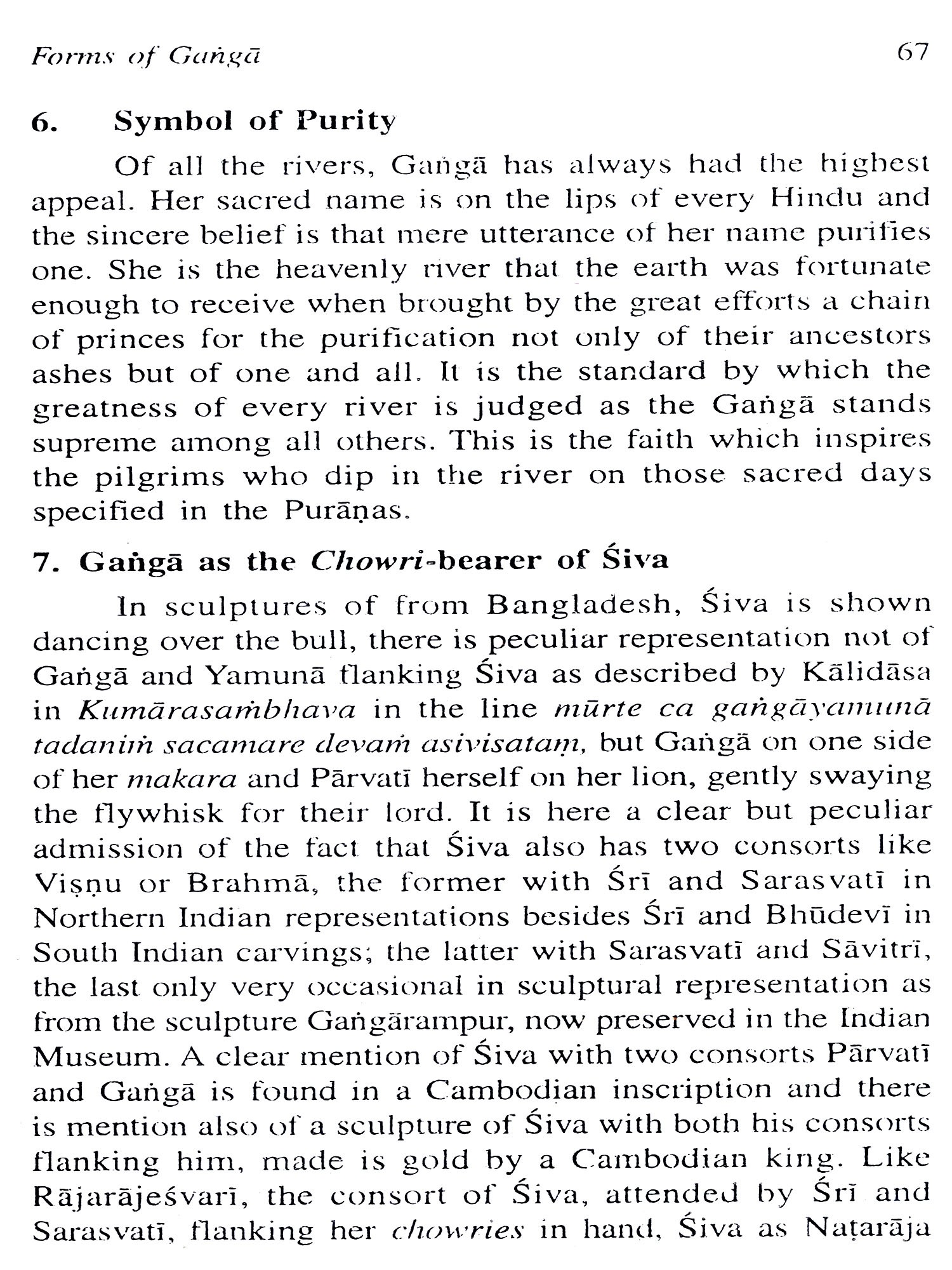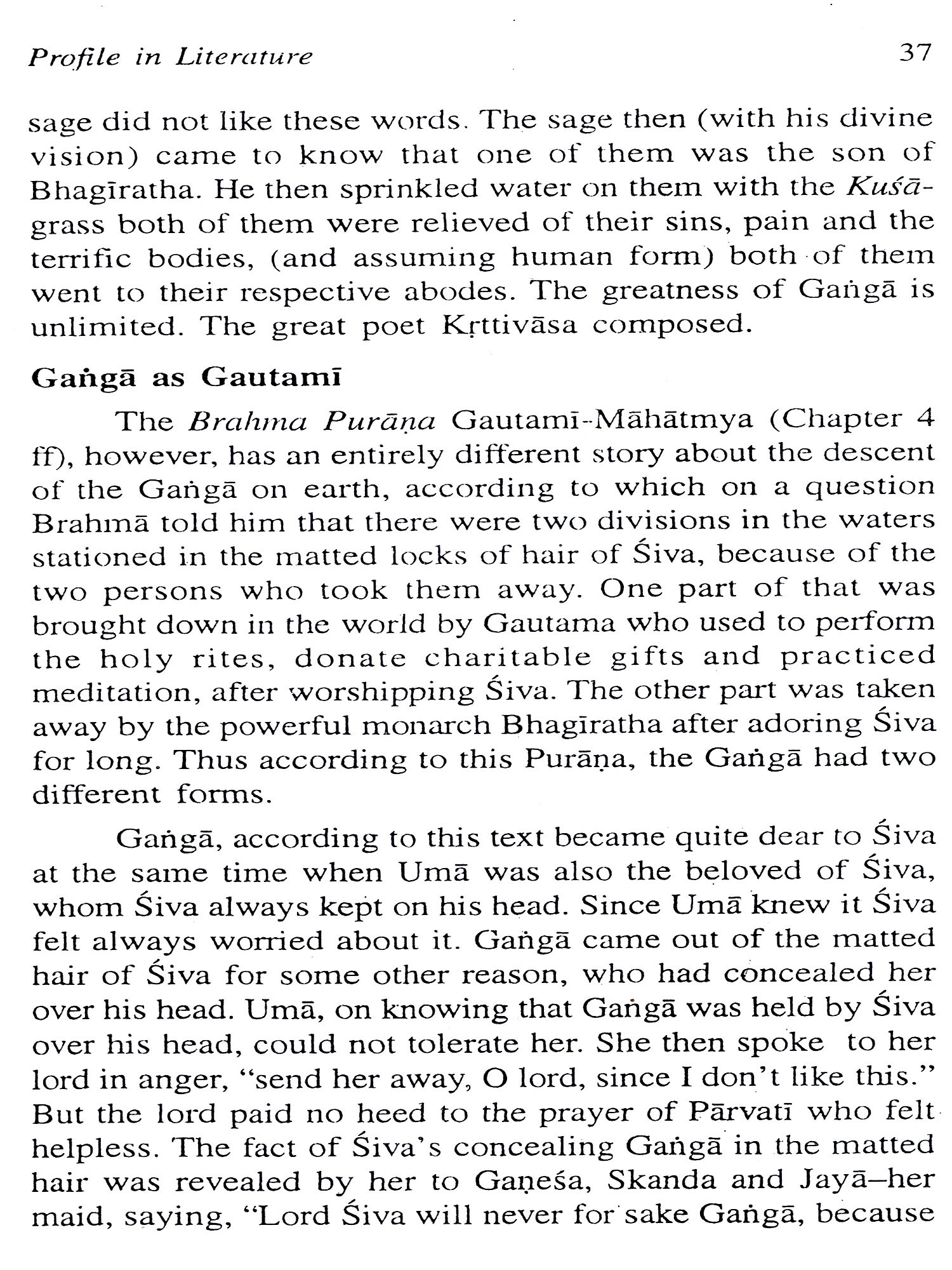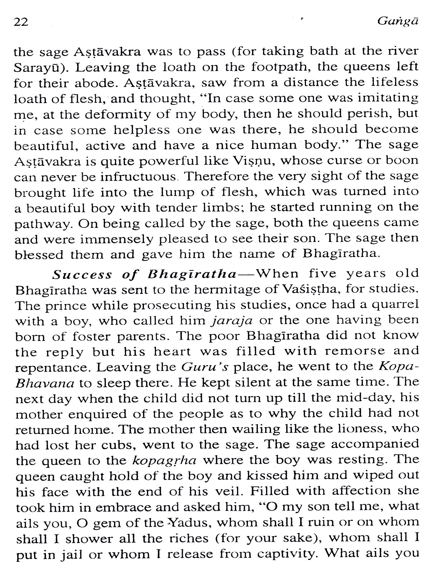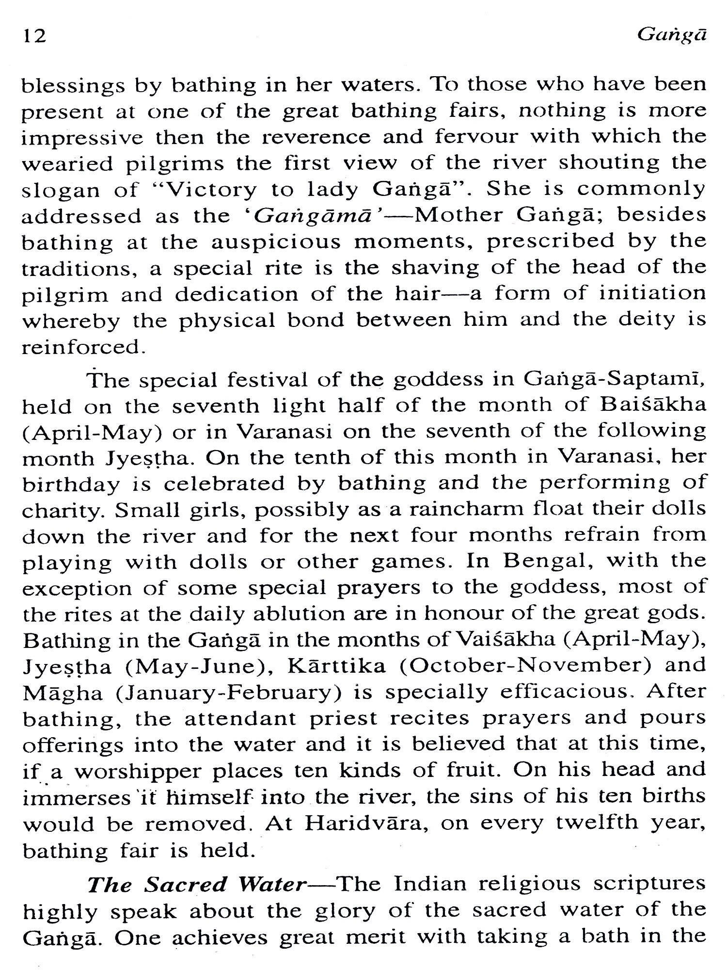Ganga is one of the most sacred rivers of the country, which is said to have been brought on earth by Bhagiratha, of the solar race, in order to redeem his ancestors who had been reduced to ashes by the sage Kapila. Since then she is purifying the people on earth.