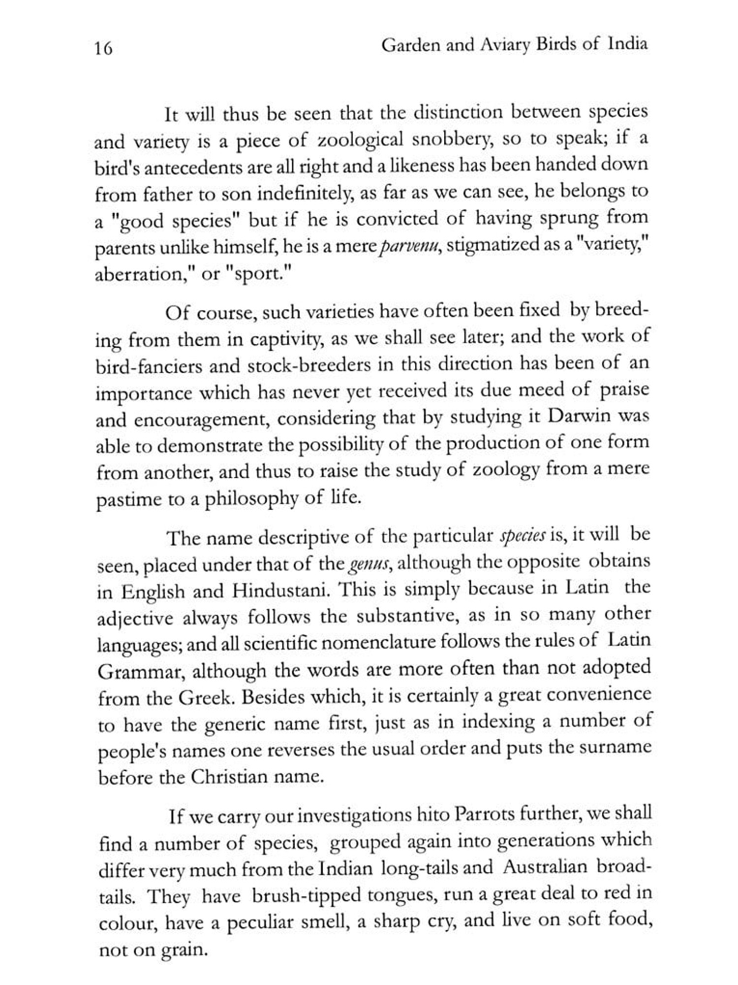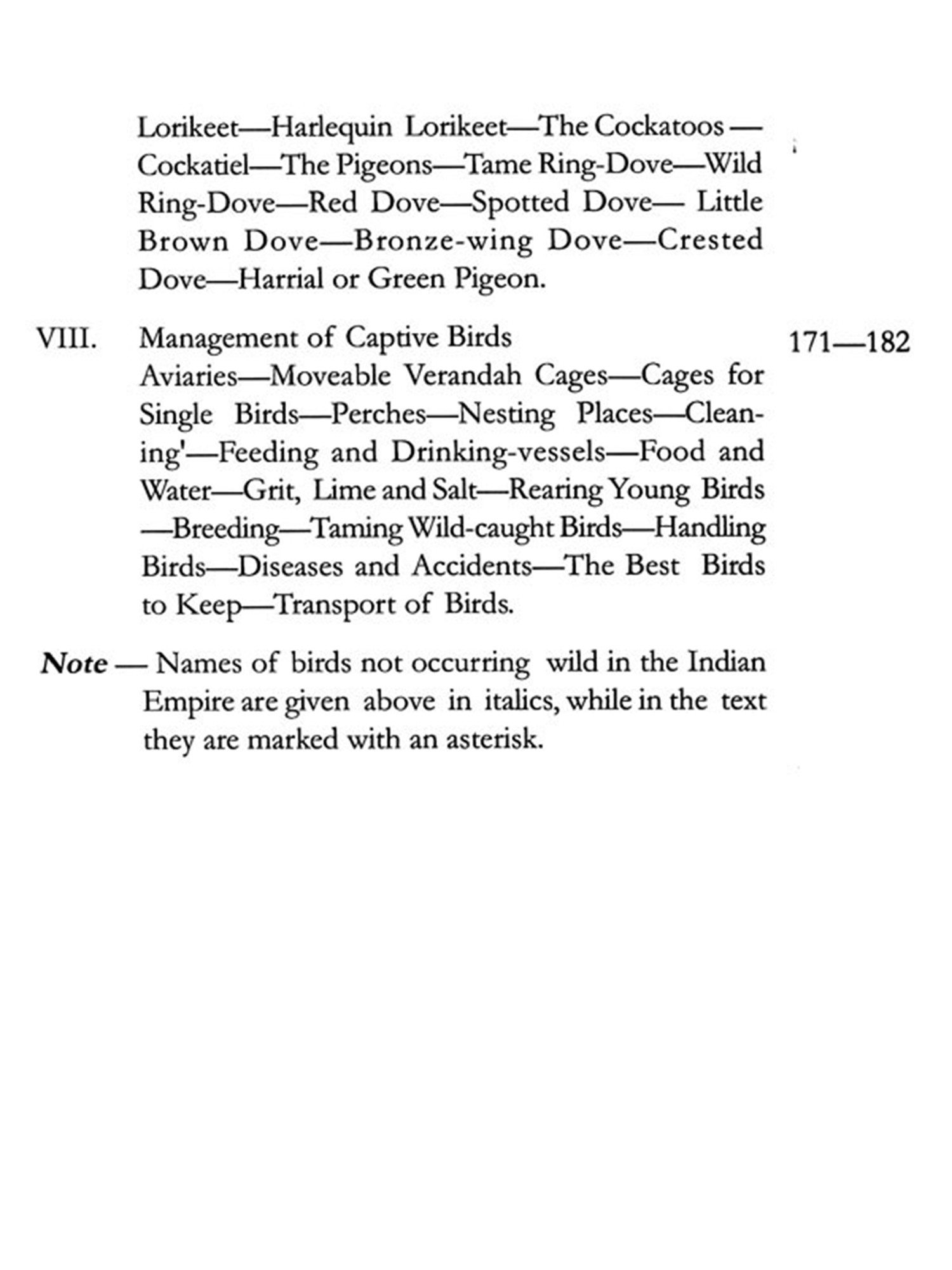 The same considerations have guided me in the avicultural part of the work, wherein I have endeavoured to meet the requirements of the beginner in bird-keeping by indicating those species which are most easily obtained and kept. The names of imported cage-birds are distinguished by an asterisk in the letter press and by Italics in the List of Contents.