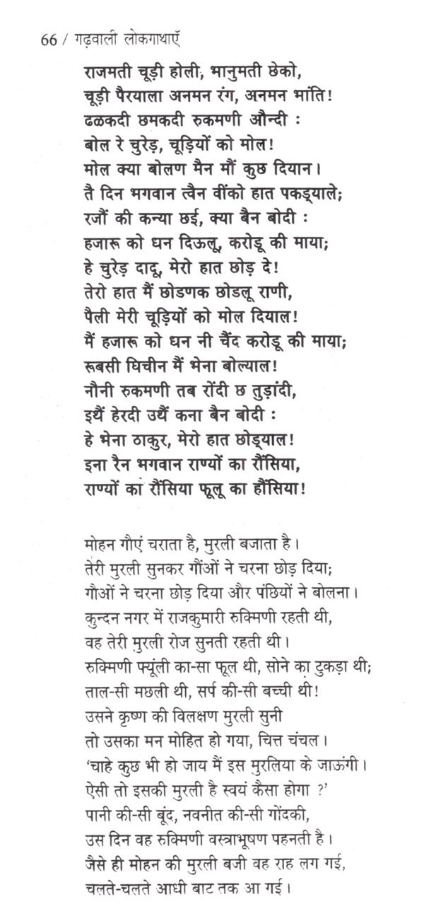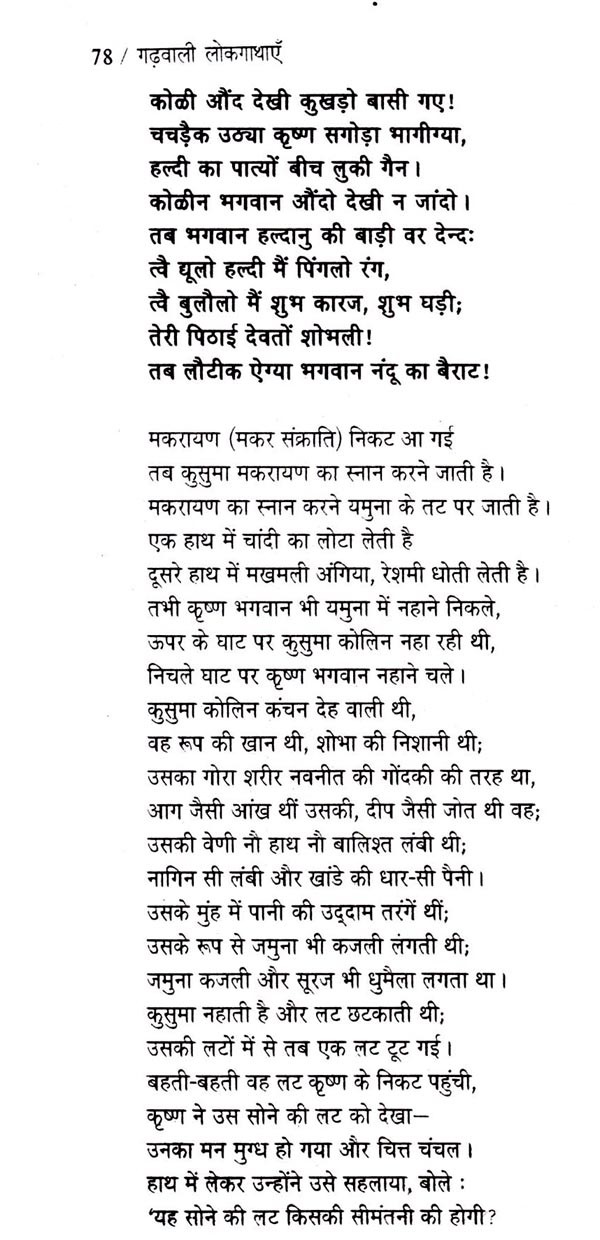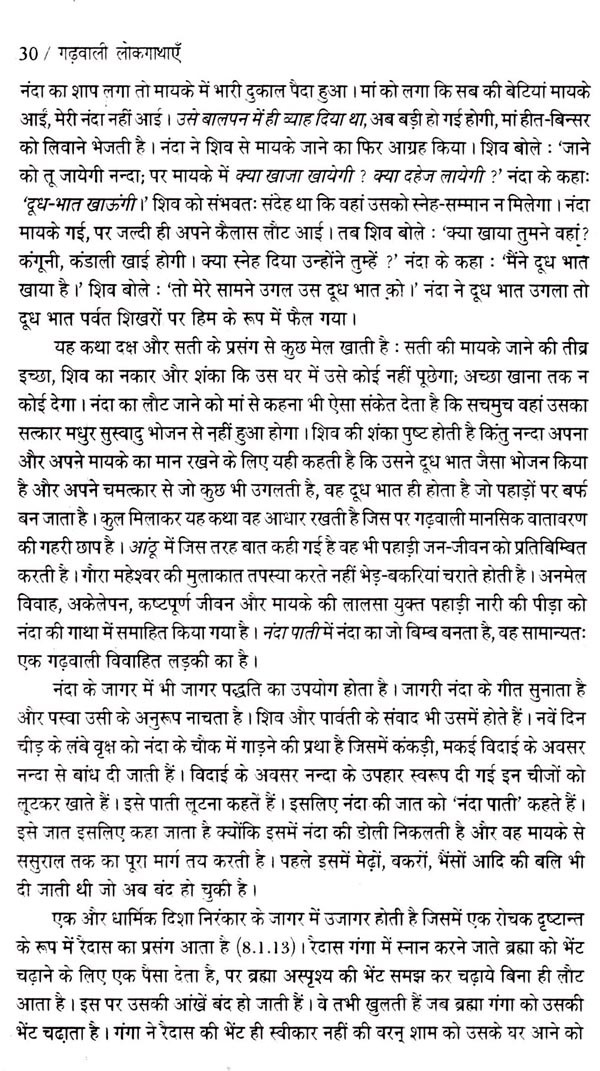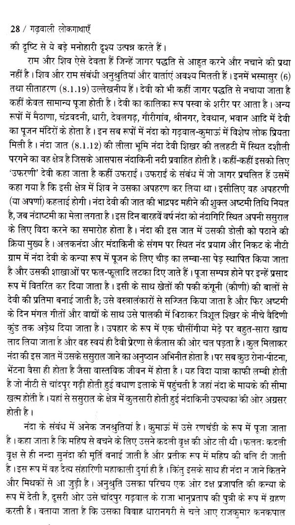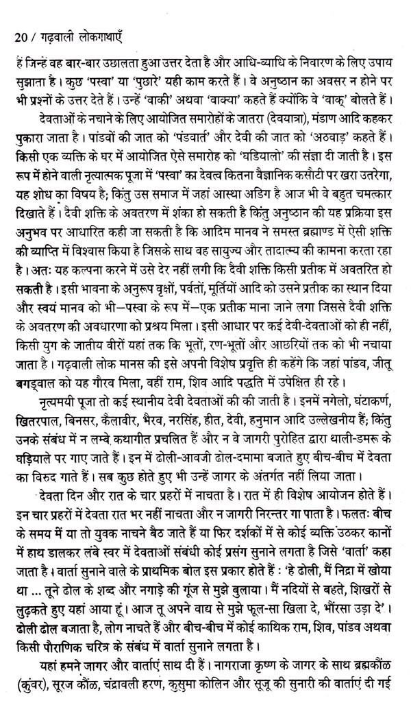 हिमालय प्राचीन काल से ही भारतीय धर्मभावना में पुनीत क्षेत्र रहा है। नदियों और उनके तट पर बरो तीथों की पावनता भी अनादिकाल से चली आ रही है। देवी-देवताओं की पवित्र रखाली के रूप में भी यह क्षेत्र पौराणिक आख्यानों से युगों तक छाया रहा। साध्यकाल में लोकधर्म की अपेक्षा युद्ध जीवन का सत्य बना। वस्तुत गडकल को अपनी सत्ता और सुरक्षा के लिए पूरा फयकाल समस्त उत्तराखंड में सत्ता के संघर्ष का काल रहा जिसमे युद्ध शूर वीरता, भढ़वाली और रोमान का बोलबाला रहा। मध्यकाल शीर्य और सामती जीवन मूल्यों का ही नहीं, धार्मिक आन्दोलन का भी समय रहा। फलत इस काल में रची गई अधिकाश गाधाओं में शैव, शाक्त, कबीरपंथी तथा नाथपंथी प्रभाव के भी दर्शन होते हैं। इस प्रकार धर्म और यथार्थ जैसे कई आख्यानों में गडमड हो गए है। गढ़वाली लोक गाथाओं को मुख्यतः 4 वर्षों में विभक्त किया जा सकता है-जागर, पवाडे, चैती तथा प्रणय गाथाएँ। वीरता और प्रणय का भाव में वीरता का भाव भी है। इसलिए उनका शुद्ध विभाजन कठिन कार्य है। इसी प्रकार चैती गाथाओं में प्रणय का सामती तत्त्व भी निहित है। इसलिए उन्हें भी प्रणय गाथाओं से अलग करना कठिन है। फिर भी वे शुद्ध प्रणय गाथा नहीं है। लोकगाथाओं में कई चीजे जोडी और घटाई जाती रहती हैं केवल कुछ अंश ही स्थिर रहते हैं। एक प्रकार की वर्णनात्मक और नाटकीय शैली और लय की समानता होने के कारण सभी लोक गाथाओं में भाषा का प्रवाह होता है तथा भावों, अभिप्रायों, टेक तथा वाक्यों या वाक्यांशों की पुनरावृत्ति से एक प्रकार की सुसंबद्धता बनाई रखी जाती है। लोक-गाथाओं का मंचीय पक्ष यह है कि जागर में बाकायदा 'घडियाला' या मंडाणा लगता है, देवता नृत्य करता है प्रस्तुत पुस्तक गढ़वाल की लोक संस्कृति और लोक गाथाओं को भावी पीढ़ी के लिए संरक्षित रखने के संदर्भ में एक मौलिक एवं गंभीर कार्य है।