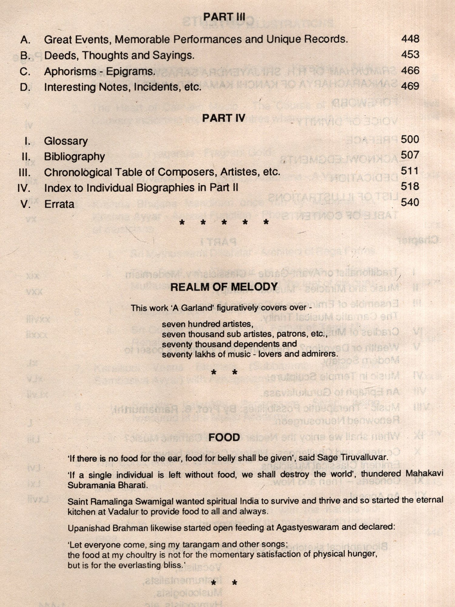 There are books on the theory of music. There are biographies of some individual composers and musicians. There are a few collections of more than one or two biographies. Revered Subbarama Dikshitar did bring out brief facts of seventy-seven lives in 1904. Abraham Pandithar in 1917 and later Prof. P. Sambamurthi recorded some facts likewise. The venerable Dr.U.Ve. Swaminatha Ayyar thought of bringing out a collection on the lives of eminent musicians but his noble life was a fight against the clock and the calendar. His weighty contribution attracted the notice of the Lord and he was withdrawn to be by His side before he could take up the work. The 'Who's Who' of musicians has but a limited coverage, scope and content. Thus, there is no compilation of biographies in English giving details of past and present composers, musicians and musicologists for universal reference and circulation. Hymnodists were hitherto a neglected tribe. Hence, I took up the arduous task of collecting and collating the biographies of all from libraries, newspapers, magazines and books and by contacting many artistes in person and by post. I visited places like Tiruvarur, Anandatandavapuram, Marudanallur, Govindapuram, Varanasi, Kanchipuram and Tirupathi but could not extend my visits further owing to constraints of finance. My work, analogous to that of a pearl-diver who gathers the oysters and not make them, has gone on like that of a dedicated ant prior to the onset of the monsoon. Mine has not been the role of a critic. I have also not the ear to listen to or the inclination to gather demeaning details. ('Human stories are always welcome to the prurient palate.') Focus thus is on the man, the God's creation and not on the creations of man though they figure conspicuously.