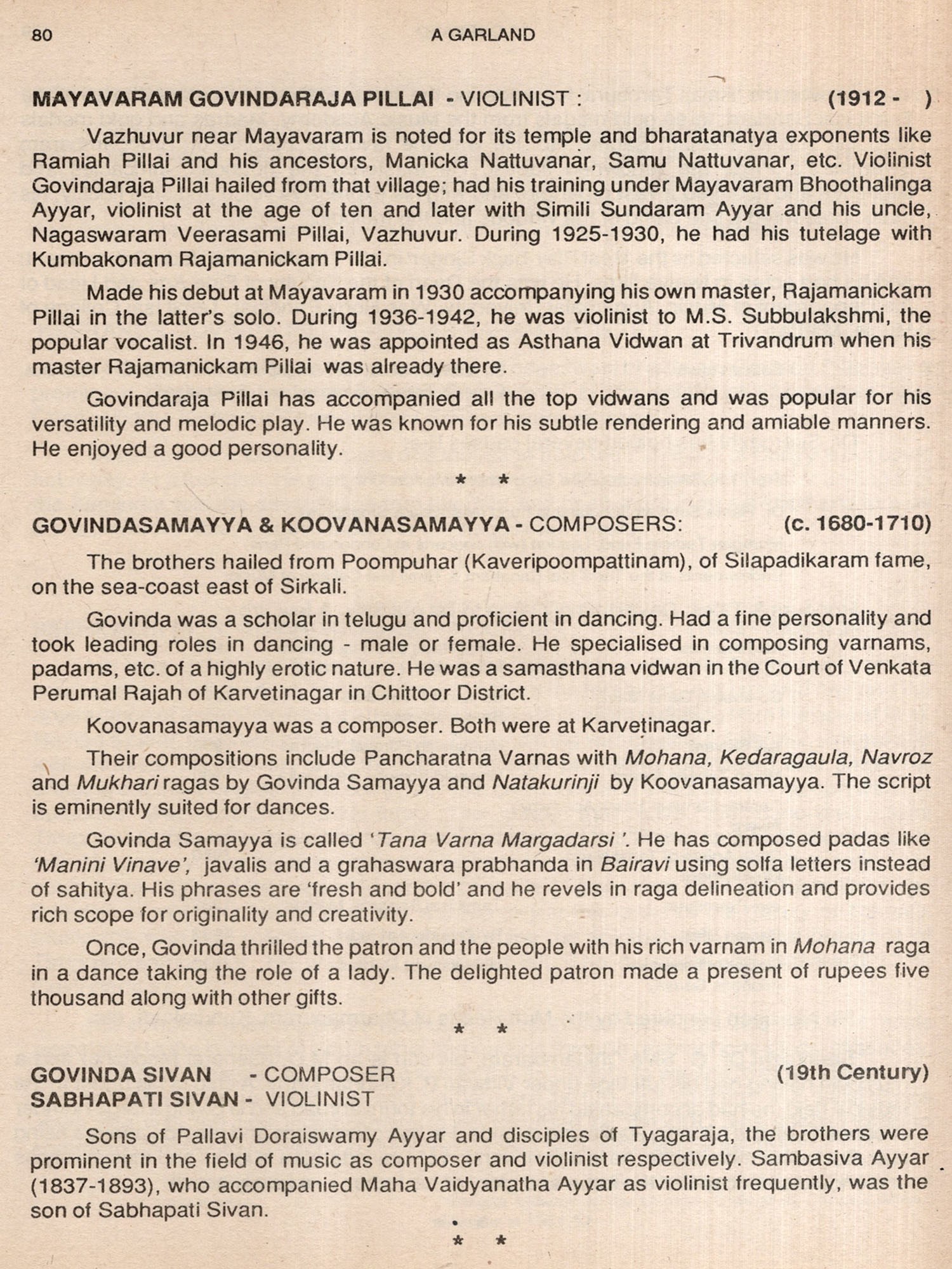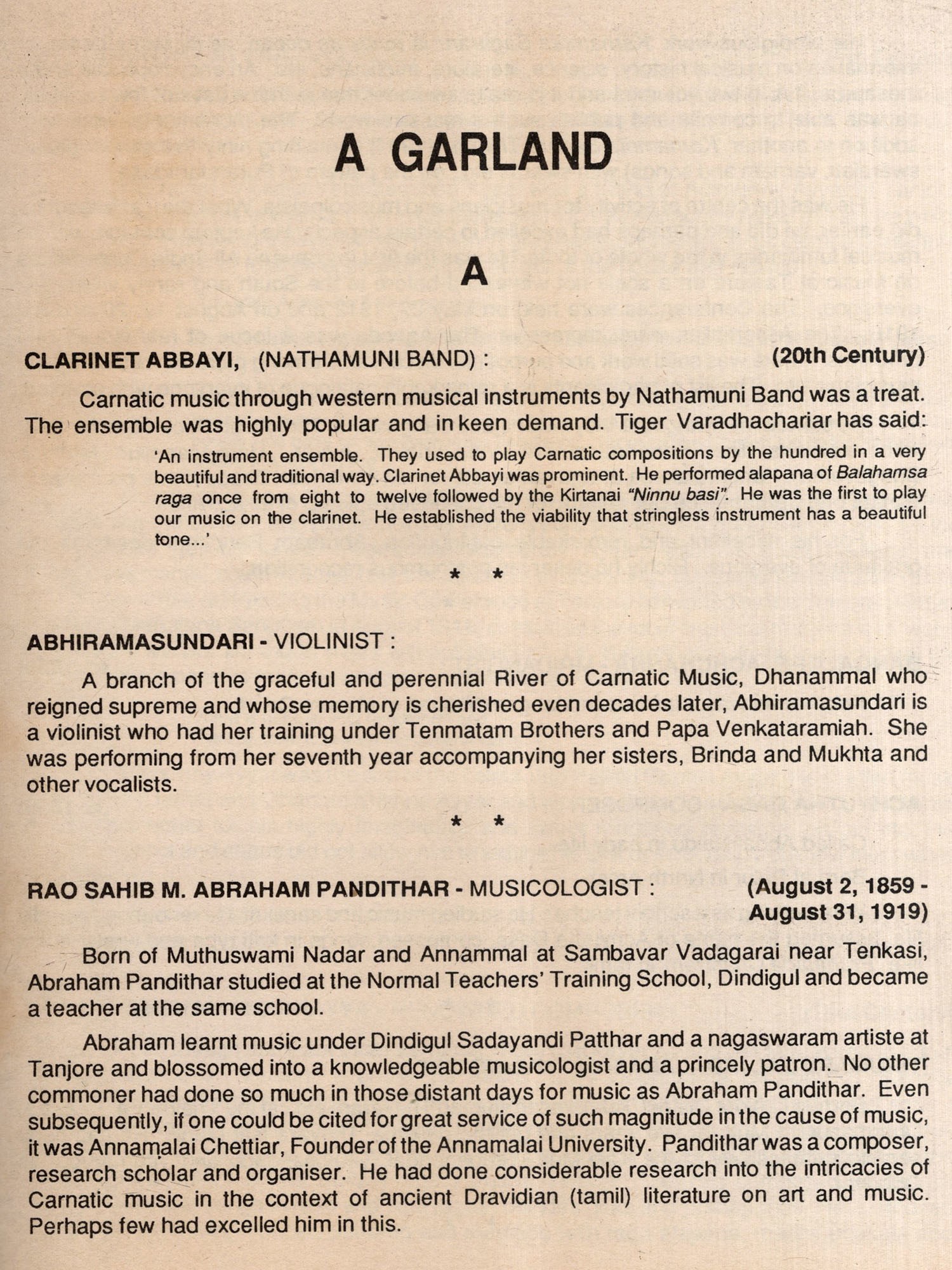 Appropriately titled 'A GARLAND', these meticulously braided sketches on Carnatic composers, musicologists, vocalists, instrumentalists and hymnodists will serve as an authoritative guide on the lives and work of these specialists. It will also provide an inspiring starting point for researchers, music lovers and students, discerning and otherwise.