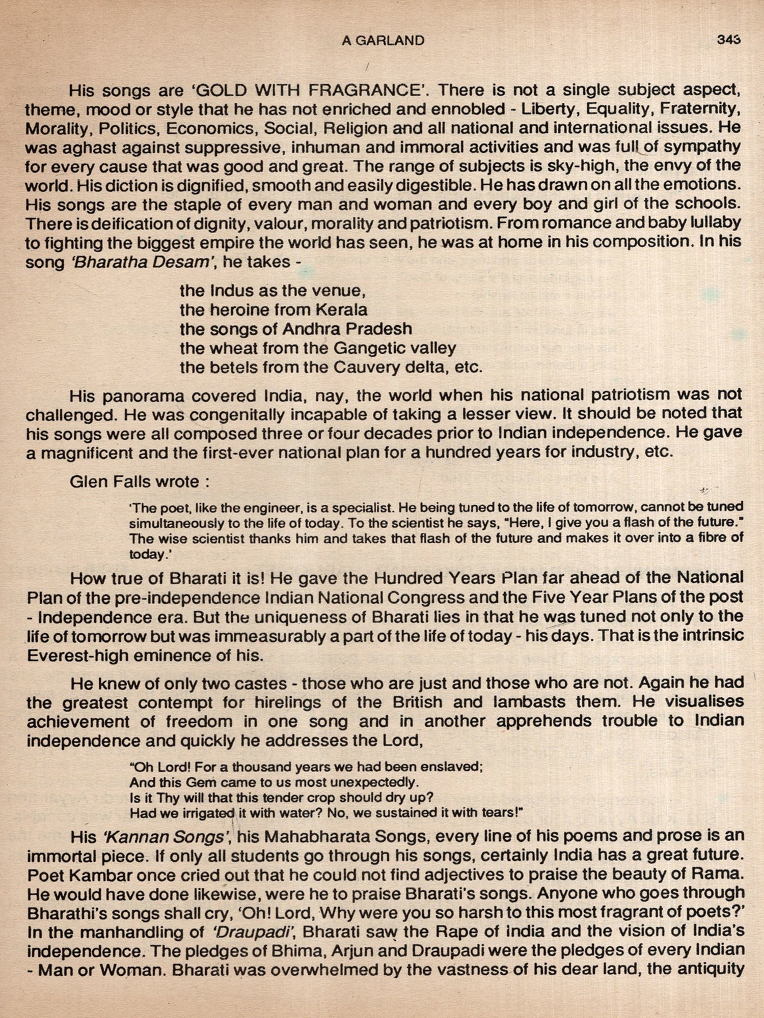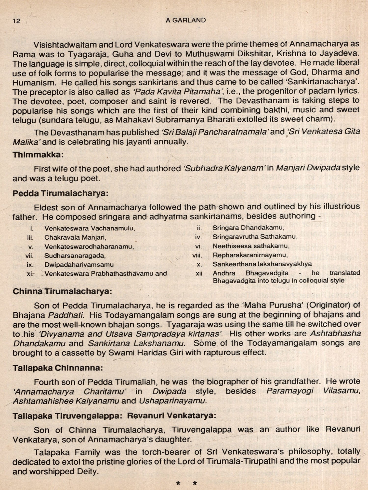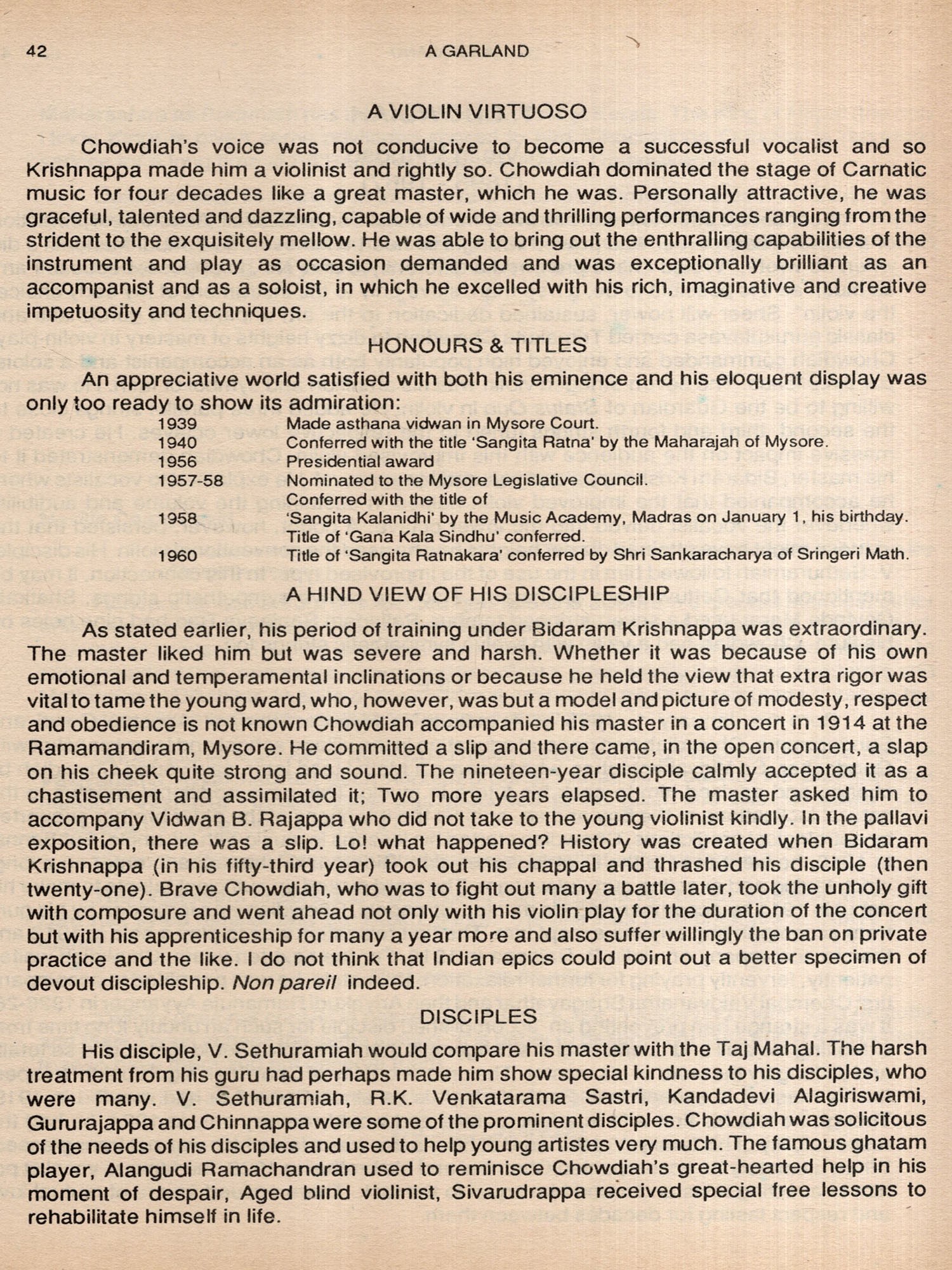 Shri Rajagopalan's 'Garland' is a fitting tribute to the Ocean of Carnataka Sangeetham, teeming with such great artistes as Kshetragna, Purandaradasa, the Trinity. Sarabha Sastri, the Bharatis, Semmangudi, M.S. Subbulakshmi, Chittibabu, Yesudas.