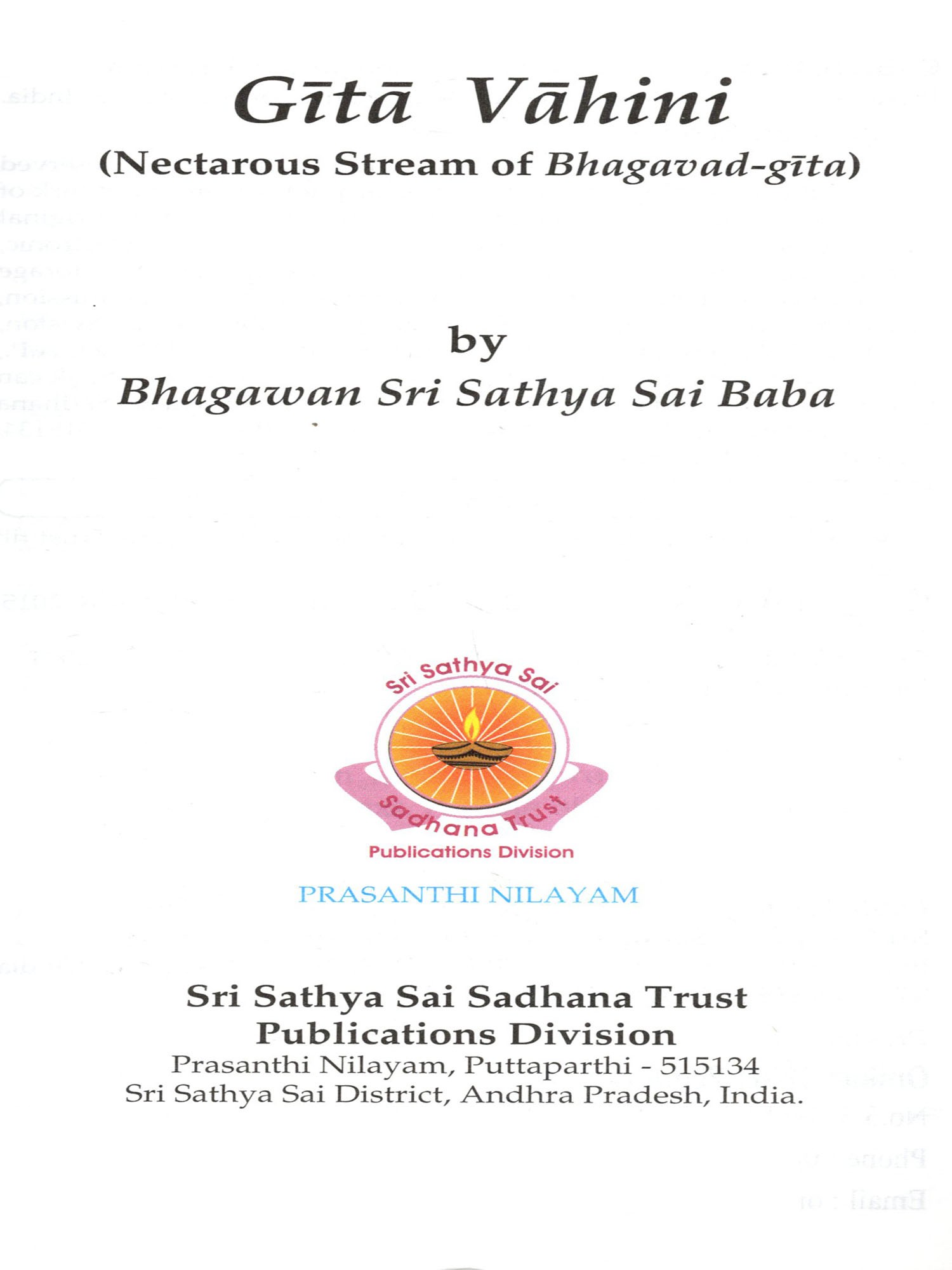 Bhagawan Sri Sathya Sai Baba wrote a series of articles under the Vahini series for Sanathana Sarathi, a monthly being published by Sri Sathya Sai Sadhana Trust, Publications Division, Prasanthi Nilayam. These precious articles are brought out now under the title "Geeta Vahini" in this book for the benefit of readers.