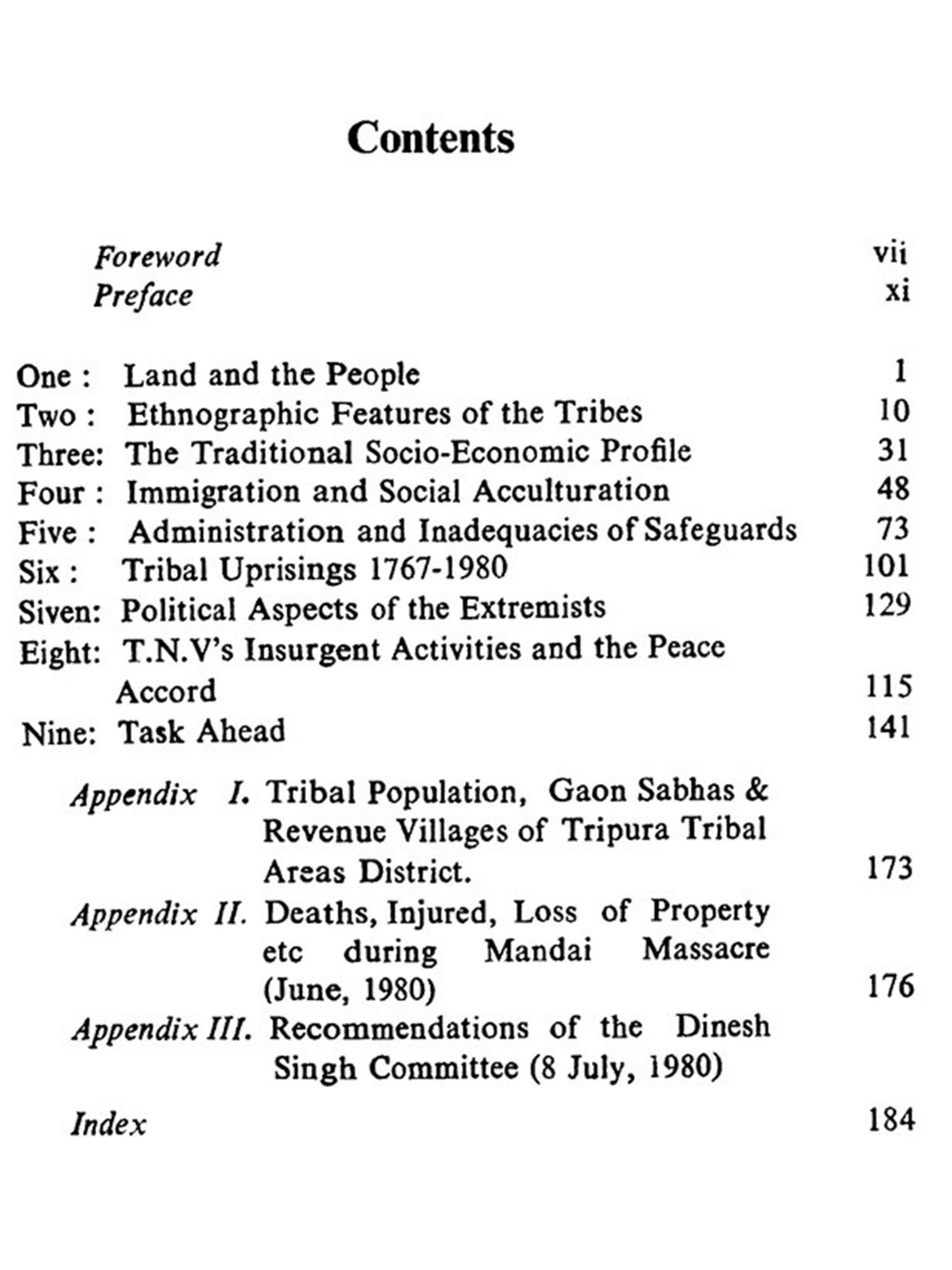 I am fully conscious of the fact that the subject is controversial and sensitive. Yet, I have made an earnest effort to focus the pertinent facts and also to highlight the truth in the greater interest of the nation. Both the Central and the State Governments have now seriously undertaken various developmental projects and welfare measures for upbringing the tribal peoples. But for an effective planning for the implementation of the tribal welfare measures, a scientific study is indeed a desideratum. The present study shall serve as a background for the preparation of any plan for developmental and welfare projects. To begin with attempt has been made to introduce the State of Tripura with particular reference to its land and people including an account of its landscape, geological and geographical features. This is necessary for presenting a picture of the physical and cultural environments in which the tribes of Tripura have been living from remote antiquity. The ethno-graphic features including cultural characteristics of the tribes of Tripura have been presented in Chapter II. It is on this background that the traditional socio-economic profile of the tribal peoples with particular reference to their food gathering, food producing activities, handicrafts, textile-weaving, exchanges etc. has been portrayed in Chapter III. It is on these perspectives an account of the immigration of non-tribal population has been dealt with in chapter IV. While dealing with the immigration of the people, particular emphasis has been laid on social acculturation and impact or modernization in the behavioral pattern of tribal life. It has been attempted to explain as to how and why the rulers of the State of Tripura encouraged the Bengali Hindus to settle in Tripura. In this context while dealing with the transition in the tribal life from primitive agricultural life to modernity, the administrative aspects and also the inadequacies of safeguarding measures for the tribals have been reviewed. The analysis shows that the picture in respect of the safeguards is highly disappointing. It has been observed, that because of cultural advancements, the tribal peoples have become more conscious of their rights and privileges. Gradually, a new tribal national feeling of con-sciousness has grown in them and this has been kindled by some foreign agencies. This is followed by an account of tribal extremism since 1767 to the recent Mandai Massacre of June, 1980. This extremism has been presented in two distinct phases. The first phase lasted from 1767 to 1946 while the period from 1947 to 1980 formed the second phase. Reference has also been made on the formation of the Dinesh Singh Committee along with its recommendations to resolve the basic problems of the State. The great tribal uprisings of 1980 being accompanied by large-scale devastation and killing of hundreds of men and women by the TNV extremists and their political aspects have been treated in chapter-VII and chapter-VIII. It has been also shown as to how the Government of India during the tenure of Shri Rajiv Gandhi's Government brought about settlement of the tribal problems by the historic 'Peace accord' signed by Shri Bijoy Hrangkhawl and five other TNV leaders on behalf of the Tribal National Volunteers (TNV) and Shri P. Srivastav, Additional Secretary to the Government of India, Ministry of Home Affairs in presence of General K.V. Krishna Rao (Retd.), Governor of Tripura and Shri Sudhir Ranjan Majumder, Chief Minister of Tripura in New Delhi on 12th August, 1988. At present, the tribal extremists have no doubt cooled down but the anti-non-tribal feelings still persist among the tribal communities of Tripura. This has been considerably hampering the progress of the developmental works in the State. So, the immediate need of the time is to remove all tribal discontent, anger and hatred against the non-tribals and for this some positive suggestions have been made in the last chapter entitled 'Tasks Ahead' with special emphasis on the point that the basic policy should be to integrate the tribal people and to bring them on a par with all other sections of the great Indian nation.