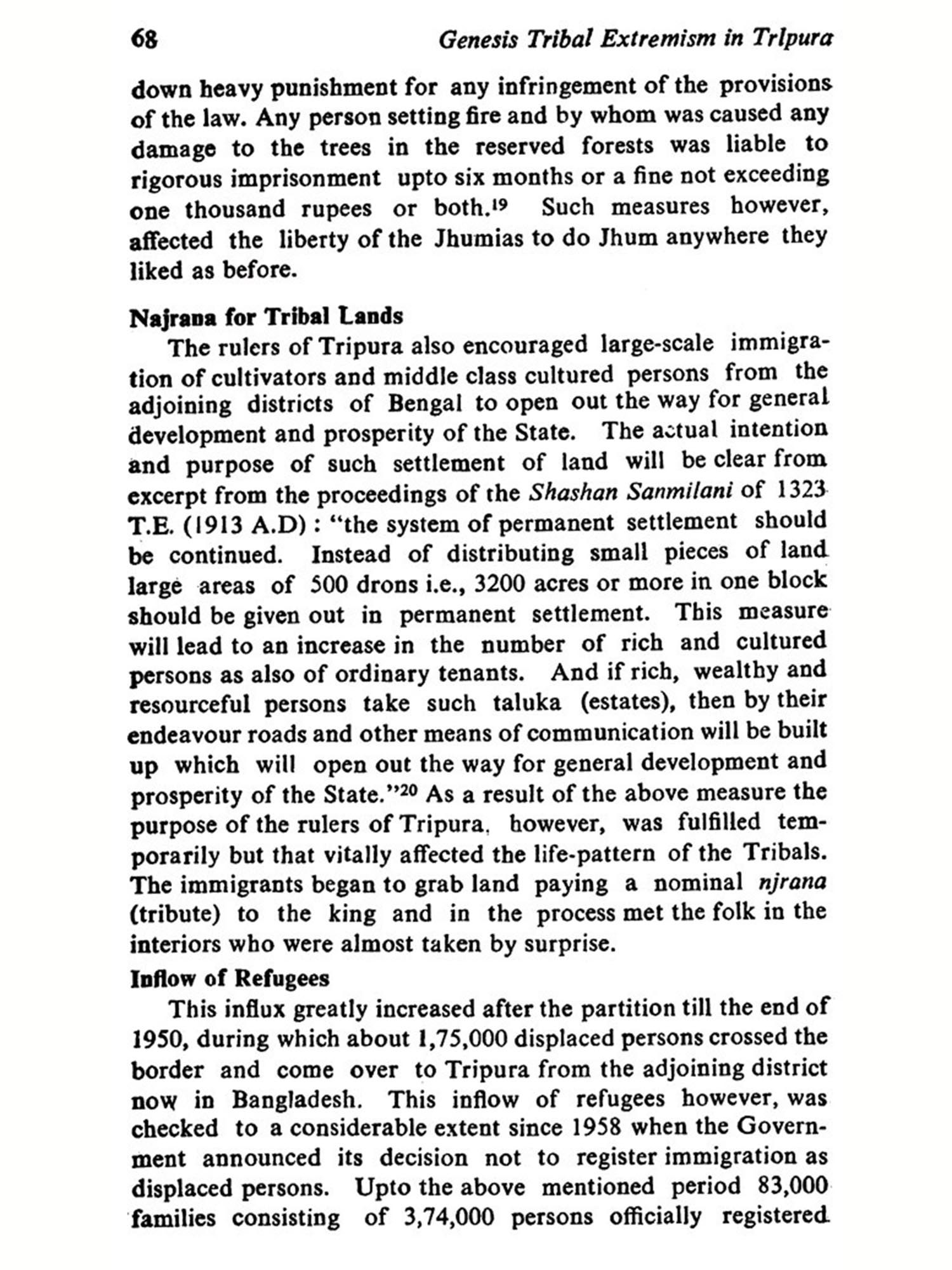 The next section deals with the problems of tribal shifting cultivators and their "untold sufferings and miseries caused by large scale exploitation carried out by non-tribal infiltrators". There is an account of resettlement programmers for the Jhum cultivators. There is also a reference to the grim facts of immigrants grabbing the lands of the Jhum cultivators by paying them a nominal nazrana and of their life in perpetual debt and poverty. He points out how the loopholes in the Land Reforms Act of 1960 were exploited by the immigrants to rob the tribals of their lands.