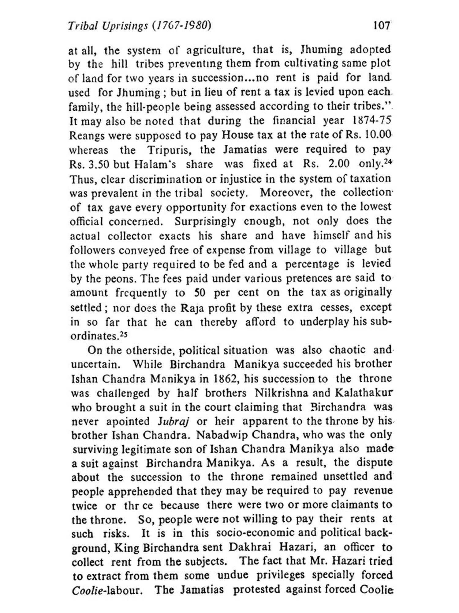 While the sixth chapter deals with several tribal uprisings in different regions of the country, the seventh chapter focuses attention on the burning issue of the TNV insurgency and its aftermath. The author covers the tug of war between TUJS (Tripura Upajati Juba Samiti) representing the tribals on the one side, and the Amra Bangali representing the Bengali Hindus on the other.