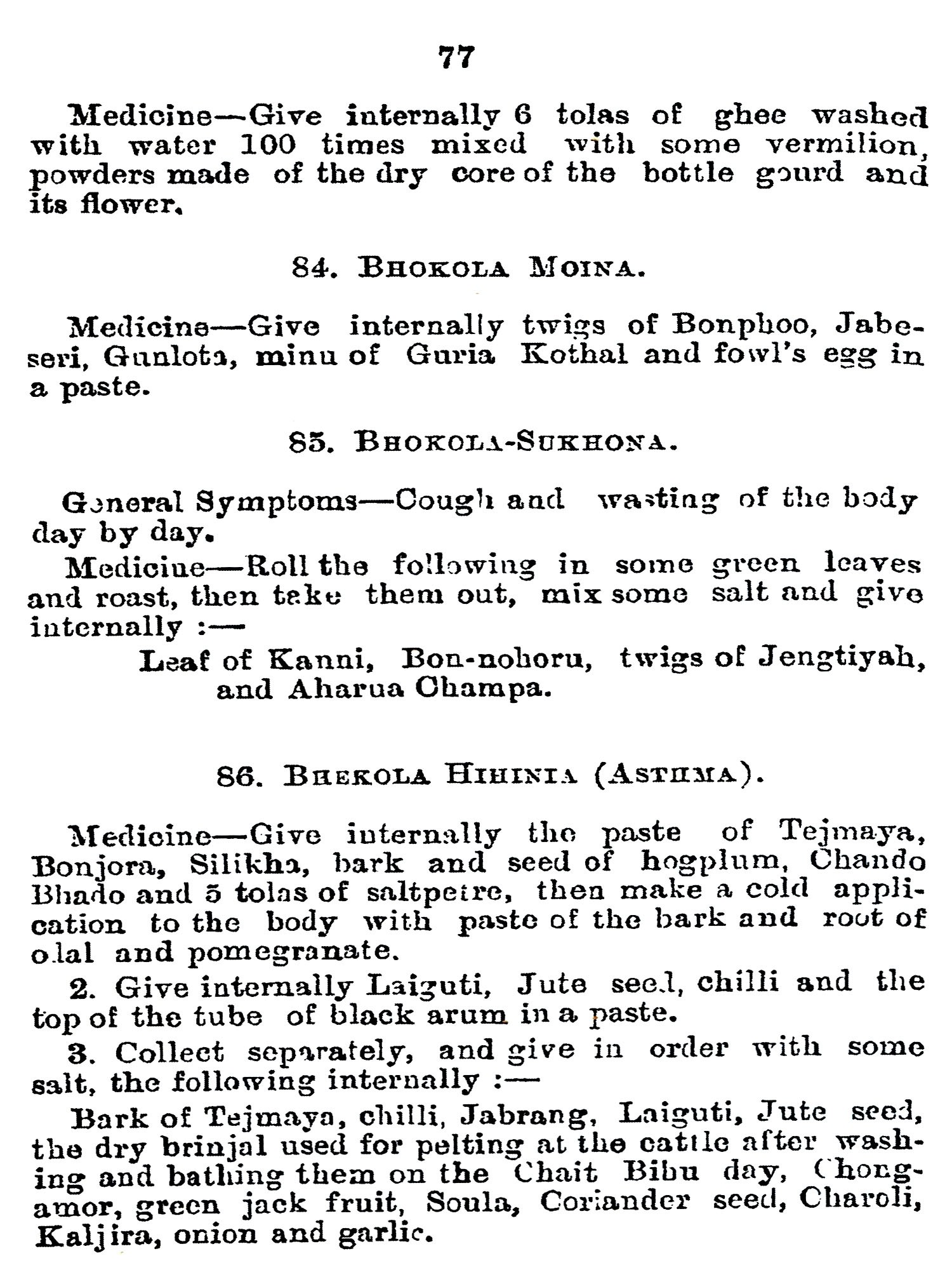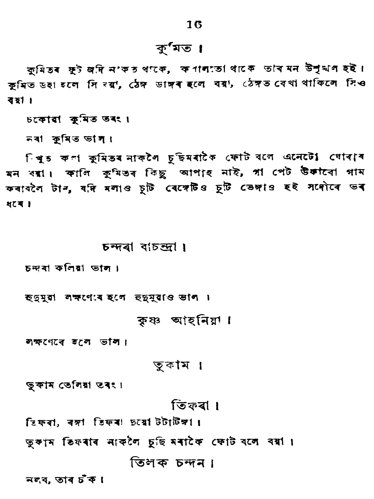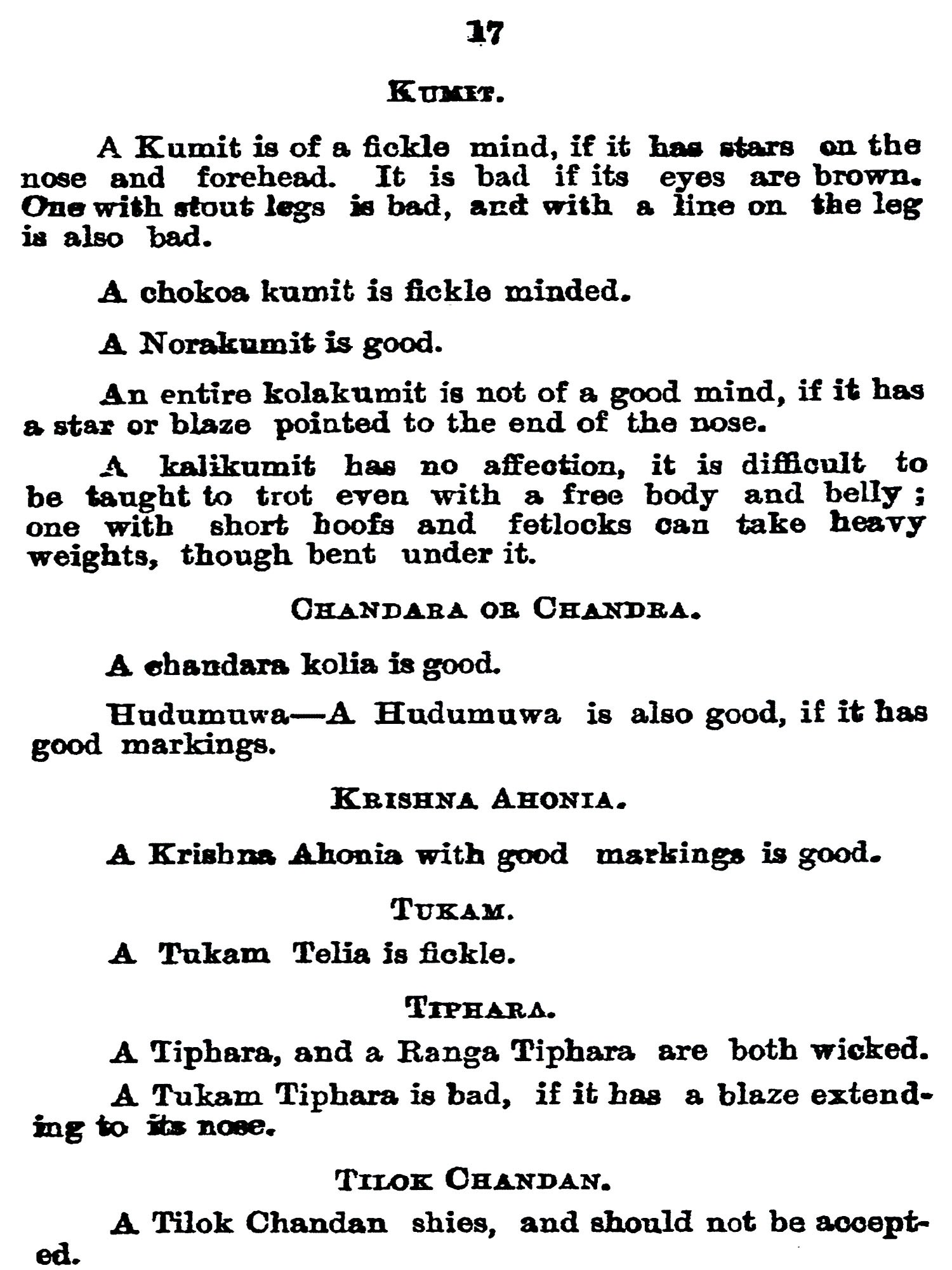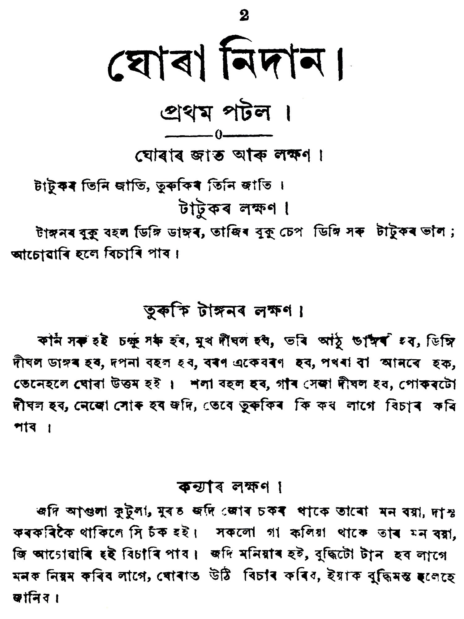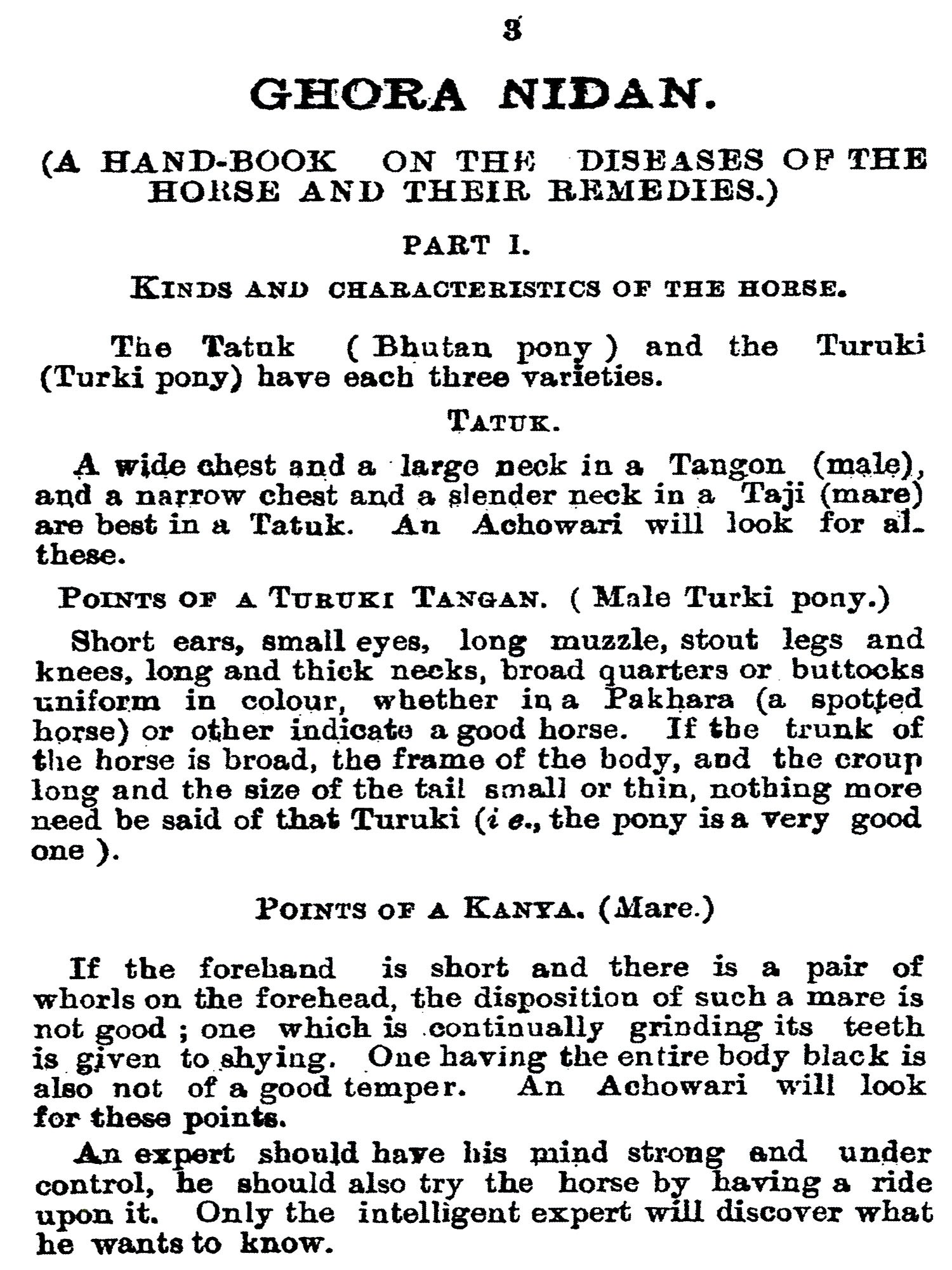 Srijut Tarini Charan Bhattacharyya, the editor and translator of Ghora-nidan, died at Gauhati on December 15th, 1927, while he was enjoying his well-earned pension after having served the Government as Sub-Deputy Collector. The book kept him busy for more than a year. He had to plod on with the text bristling with obsolete technical terms, identify the species of horses and antidotes mentioned and find out their English equivalents. Besides, the manuscripts were in many places undecipherable; and the first-hand experts whom he app roached for elucidation of a difficult text had no special acquaintance with the equestrian science preserved in the treatise Ghora-nidan. Under these circumstances the preparation of a correct text and its rendering in English constituted in themselves a work of tremendous labour; and what the author has achieved in this unpioneered field during such a short time reflects credit on his energy and tenacity: Perfection in such a venture is not a matter of one but of several generations. Ghora-nidan and the more artistic, erudite and laborious sister treatise on elephants Hasti-vidyarnava are valuable contributions to the veterinary science of the Assamese people, and both the books were, in all likelihood, compiled under the commission of the state for us as staff manuals by officers and men employed by the Ahom Government under the Ghora-chowa Barua and Hati-Barus, heads of the departments of horses and elephants respectively; and as far as Hasti-vidyarnava is concerned we know positively that it was compiled in 1734 by one Sukumar Kaith under the orders of Queen Madamvika, consort regnant of King Siva Singha, 1714-1744, while the illustrations were supplied by two court painters Dilbar and Dasoi. Their use was naturally extended to private owners and professional dealers. These two representative treatises reveal the richness and variety of the Assamese pliarmacopeia, and their literary value consists in the preservation of a very large number of expressions now thrown into disuse.