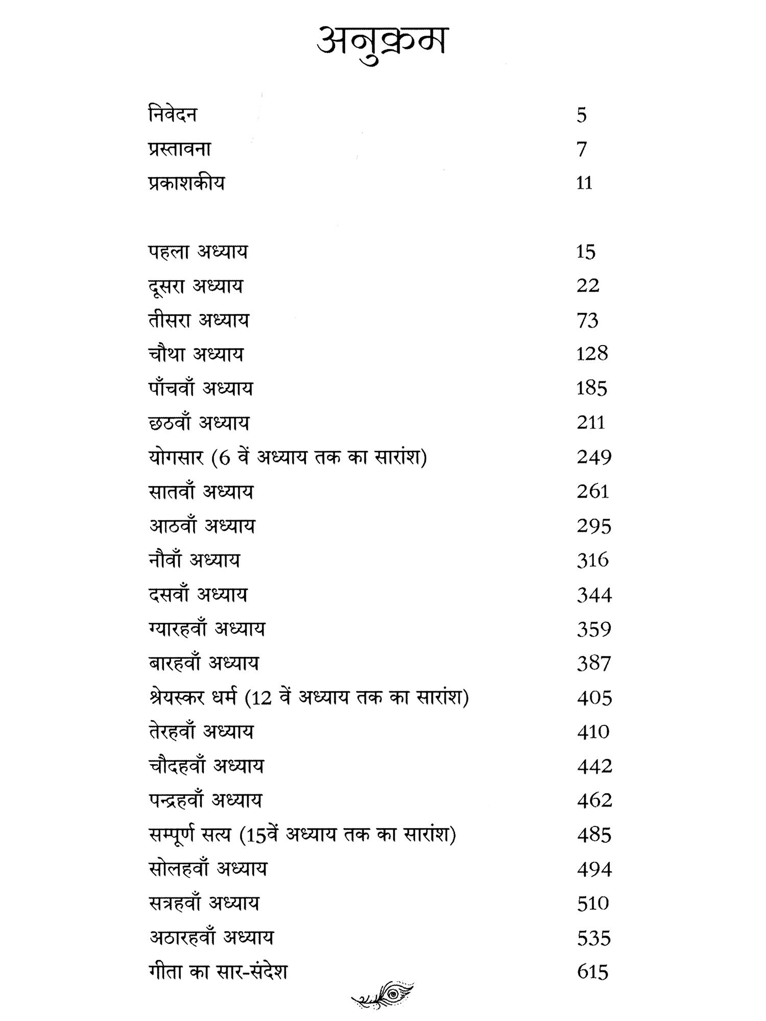 गीता का अध्ययन करते समय बीच-बीच में रुक कर अध्ययन कर चुके अंश के सारांश को चित्त में सुव्यवस्थित कर लेने से, उसकी शिक्षा ठीक से आत्मसात् हो पाती है। गीता में 18 अध्याय हैं, जिसे प्रत्येक 6 अध्याय के तीन खण्डों में समझा जा सकता है। इसके 15वें अध्याय में यथार्थ अद्वैत रूपी सर्वोच्च ज्ञान उद्घाटित हुआ है। अतः पाठकों की सुगमता के उद्देश्य से, "गीता-सन्देश" में 6वें, 12वें, 15वें और अन्तिम 18वें अध्याय के पश्चात् उन अध्यायों तक गीता की शिक्षा का सारांश भी दे दिया गया है। आशा है कि इससे गीता की शिक्षा को आत्मसात् करने में, पाठकों को सुविधा होगी।