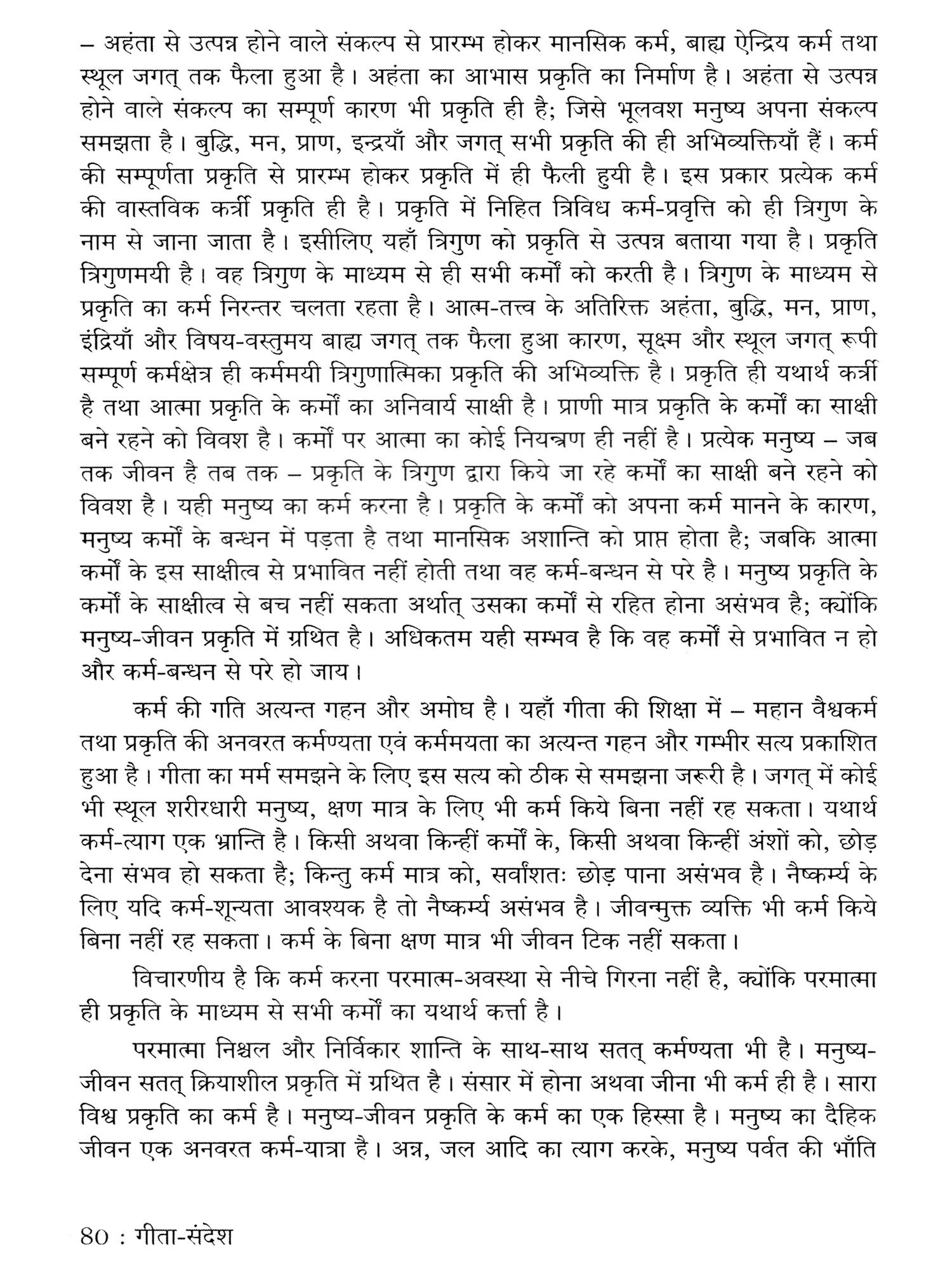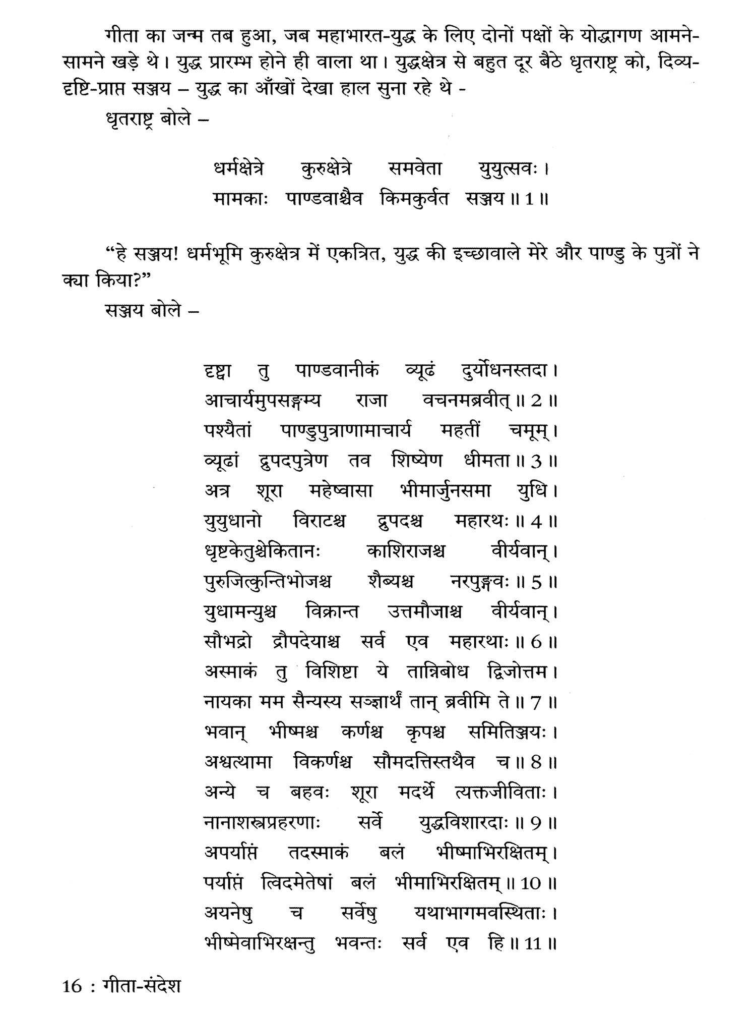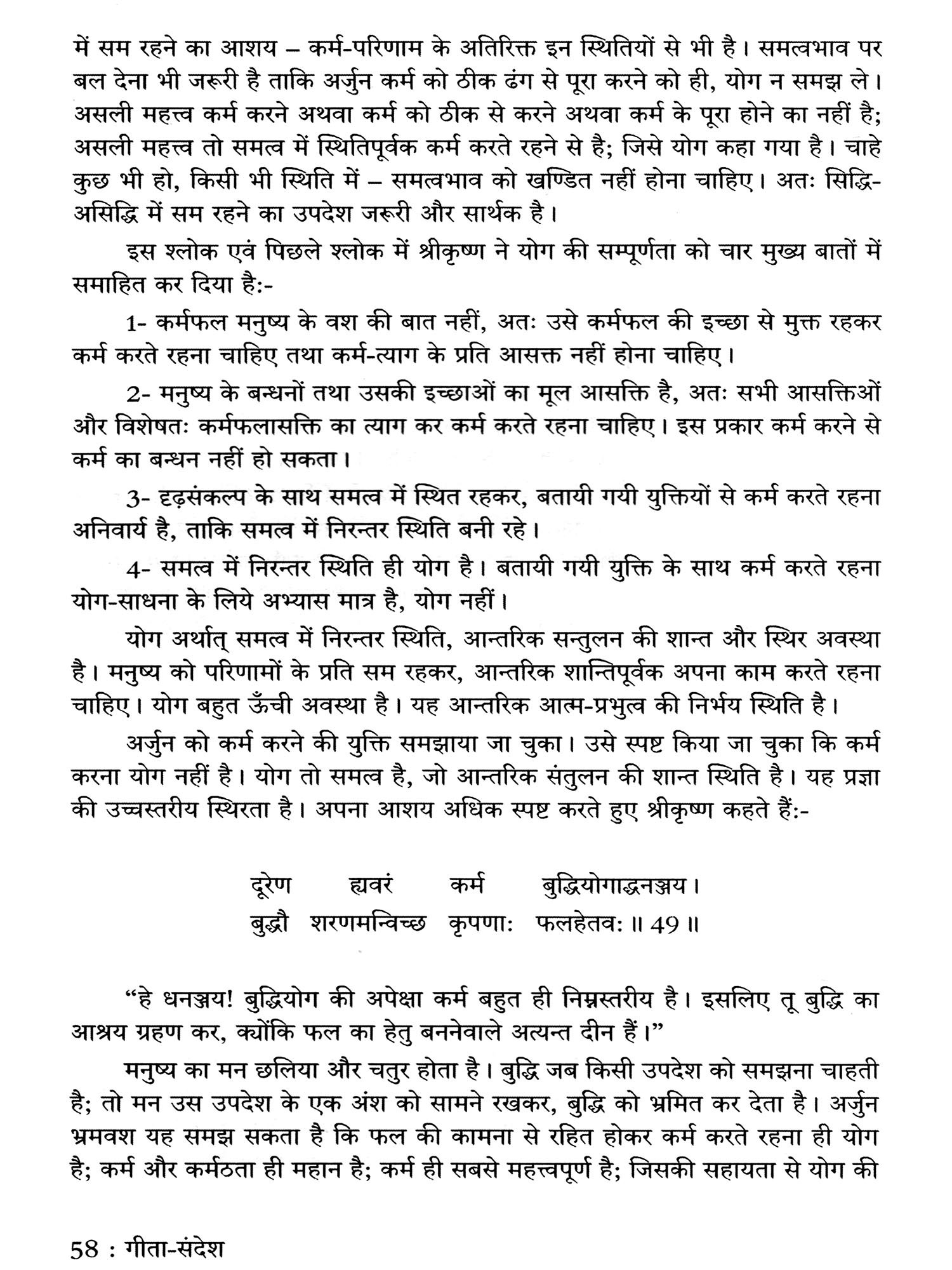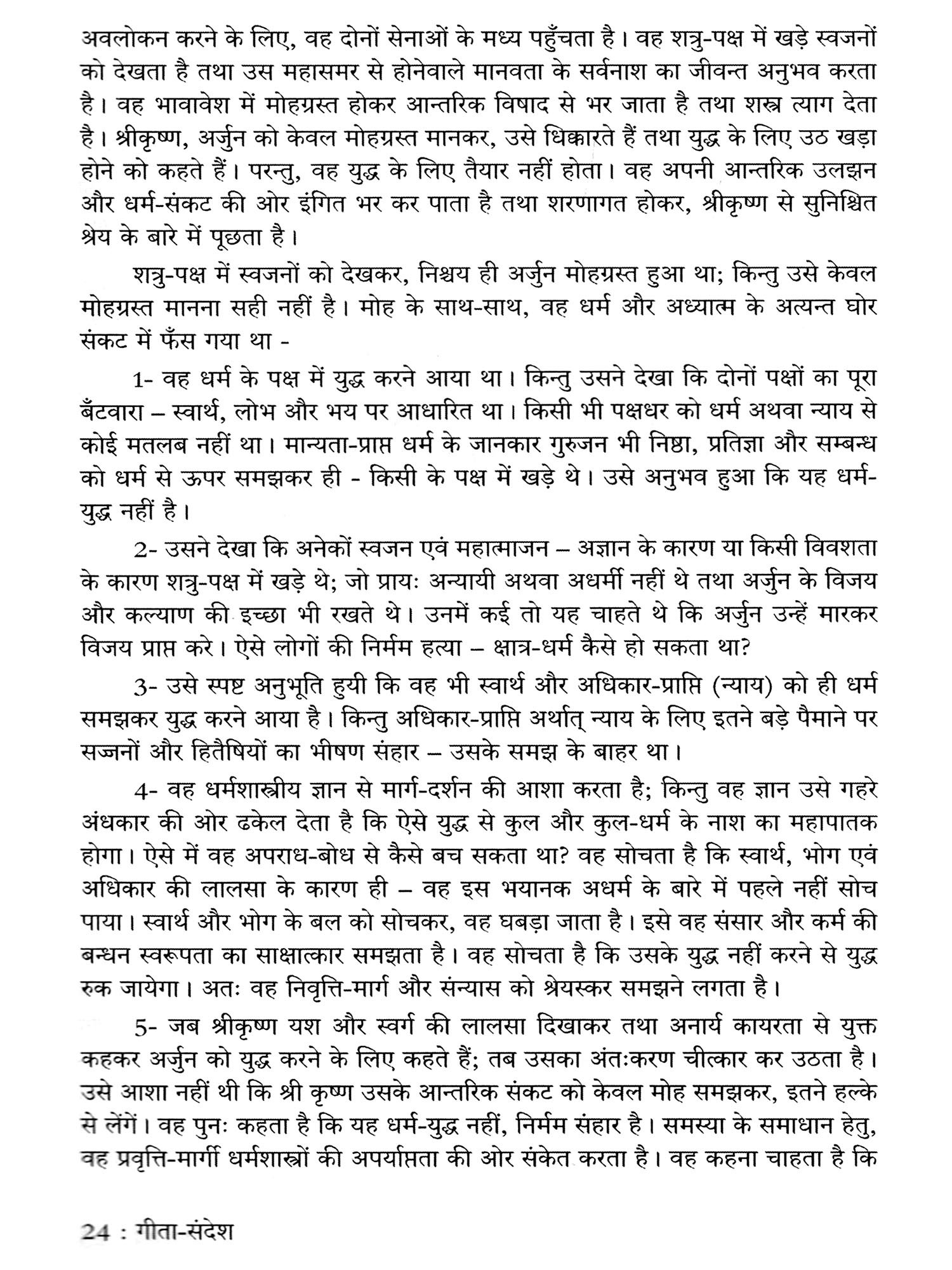ऐसा सघ जाने पर यह पर्याप्त भी है। फिर भी, गीता को समझाने के लिए अथवा उसमें गर्भित ज्ञान के अनावश्यक समर्थन में, प्रायः अन्य ग्रंथों से उद्धृत अंशों का सहारा लिया जाता है; जो मेरे मत में उचित नहीं है। ऐसे प्रयासों से, गीता का यथार्थ ओझल हो सकता है। अपने मत को गीता से समर्थित सिद्ध करने के उद्देश्य से भी अन्य ग्रंथों के उद्धरणों का भरपूर उपयोग होता आया है; जिनके के कारण आज गीता के सही आशय को समझ पाना ही दुःसाध्य हो गया है। इसीलिए "गीता-सन्देश" में अन्य ग्रंथों से कहीं भी कुछ भी उद्धृत नहीं किया गया है। आशा है कि उद्धृतांशों से रहित "गीता-सन्देश" गीता के यथार्थ को समझने और खोजने में सहायक होगा।