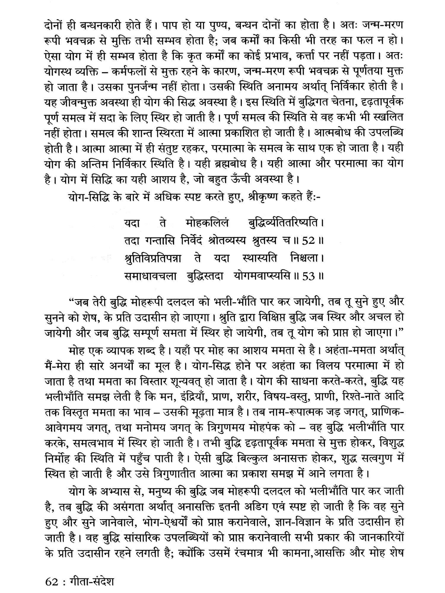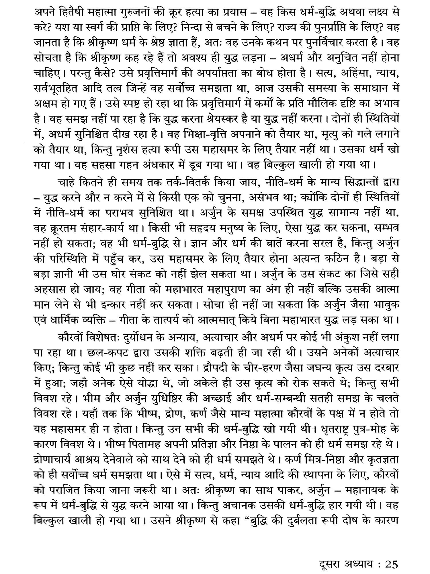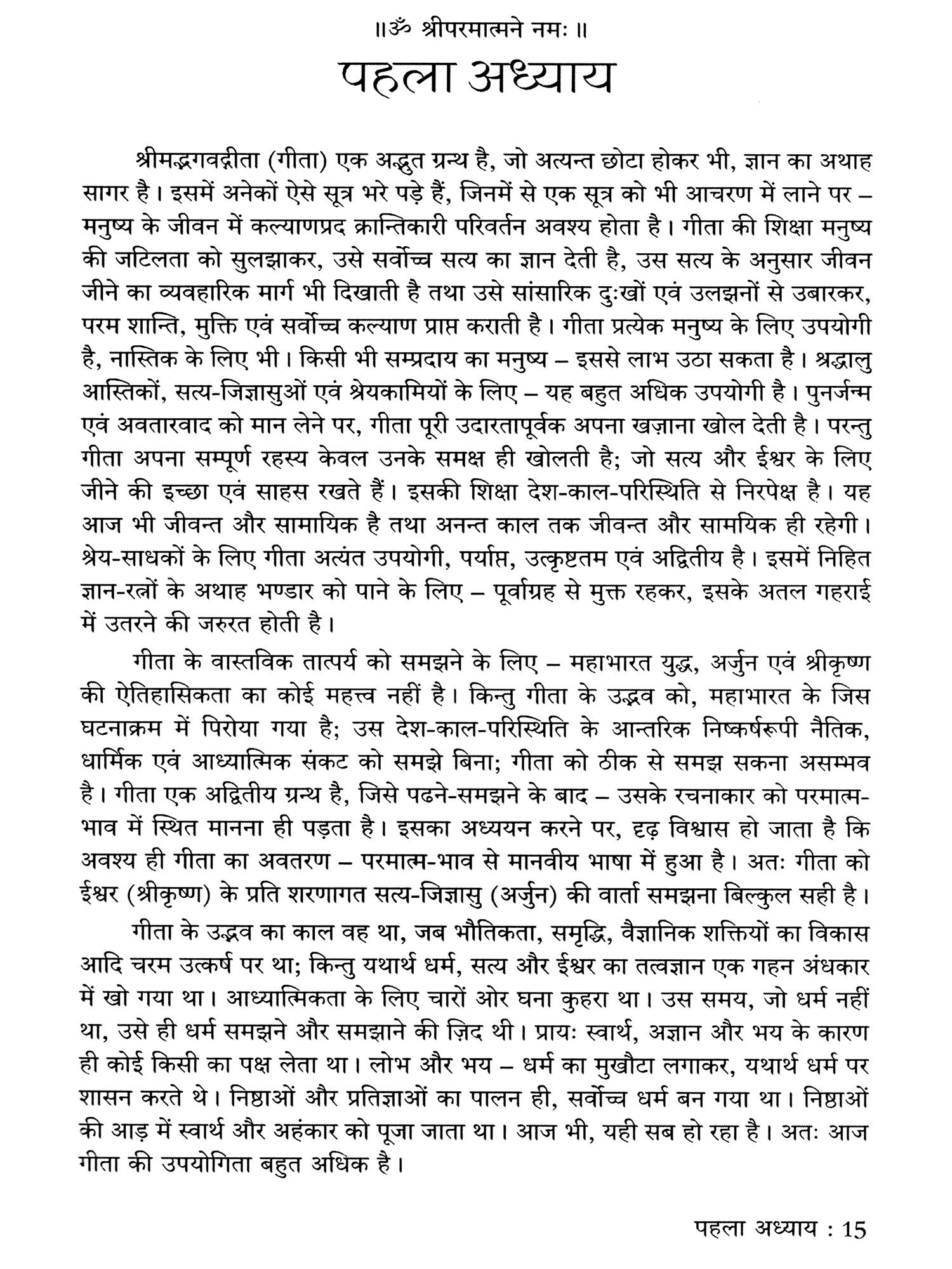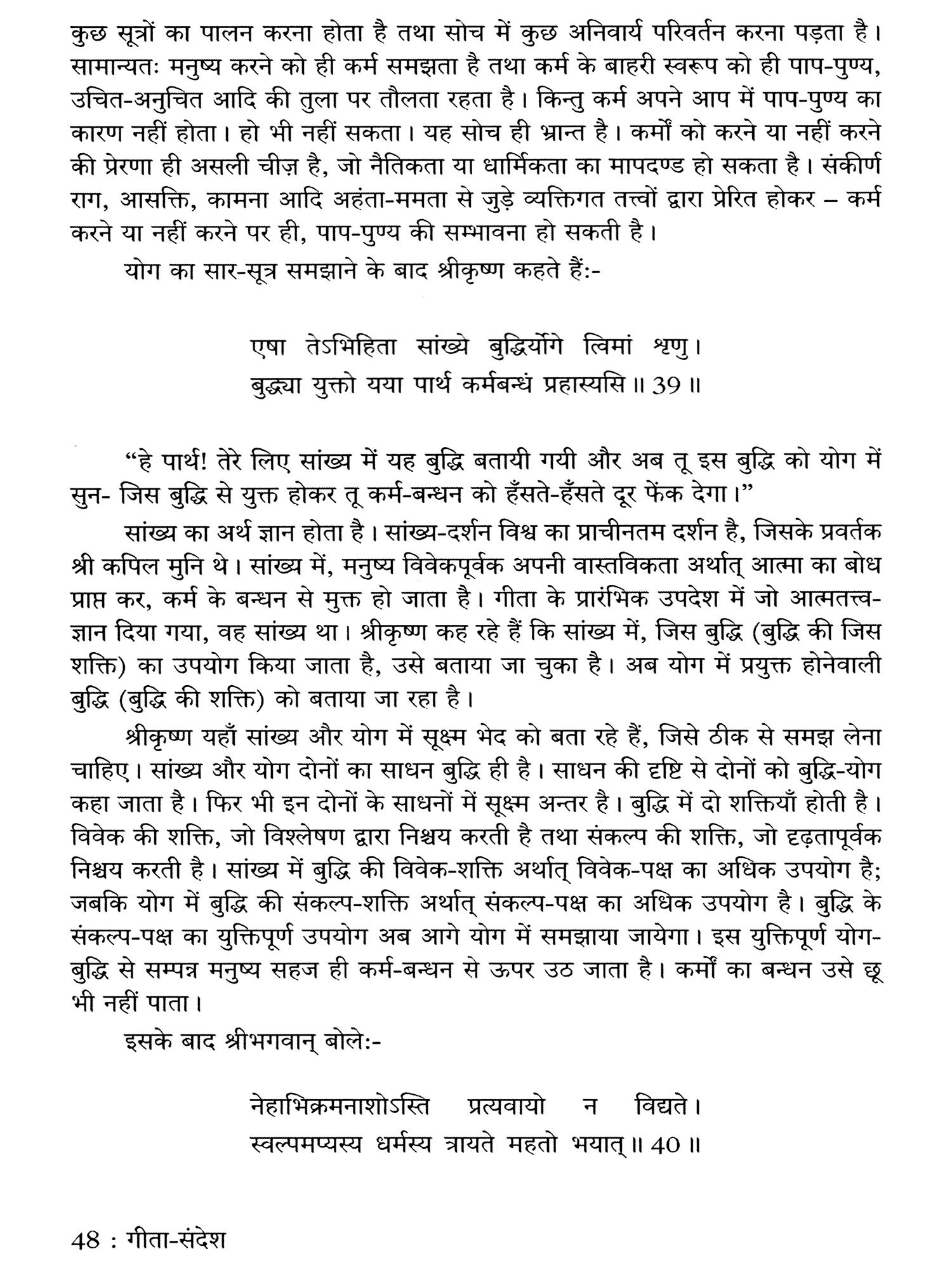 ऐसा सघ जाने पर यह पर्याप्त भी है। फिर भी, गीता को समझाने के लिए अथवा उसमें गर्भित ज्ञान के अनावश्यक समर्थन में, प्रायः अन्य ग्रंथों से उद्धृत अंशों का सहारा लिया जाता है; जो मेरे मत में उचित नहीं है। ऐसे प्रयासों से, गीता का यथार्थ ओझल हो सकता है। अपने मत को गीता से समर्थित सिद्ध करने के उद्देश्य से भी अन्य ग्रंथों के उद्धरणों का भरपूर उपयोग होता आया है; जिनके के कारण आज गीता के सही आशय को समझ पाना ही दुःसाध्य हो गया है। इसीलिए "गीता-सन्देश" में अन्य ग्रंथों से कहीं भी कुछ भी उद्धृत नहीं किया गया है। आशा है कि उद्धृतांशों से रहित "गीता-सन्देश" गीता के यथार्थ को समझने और खोजने में सहायक होगा।