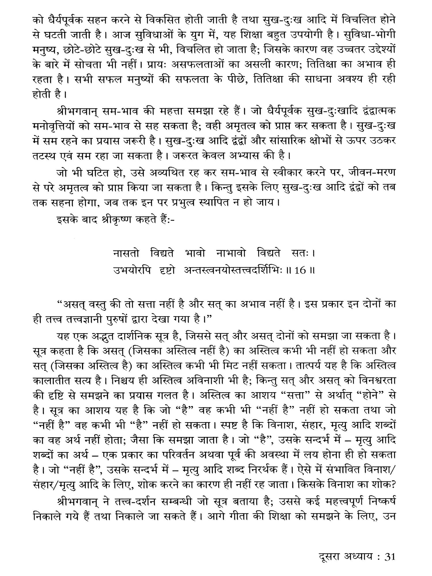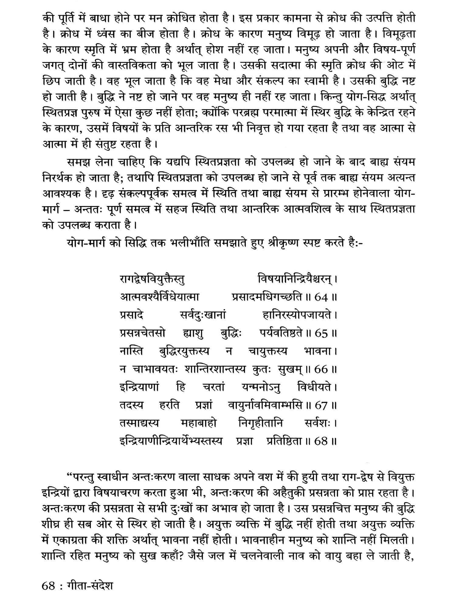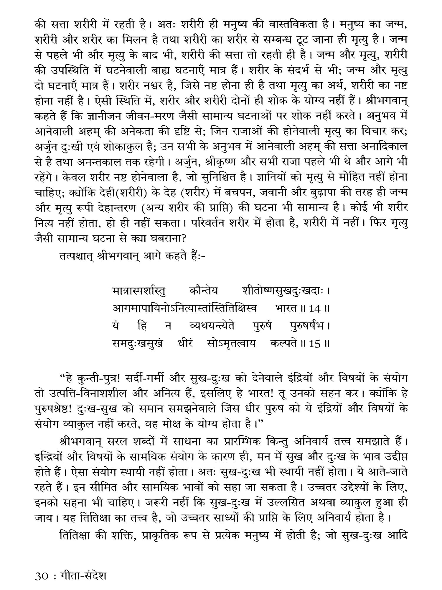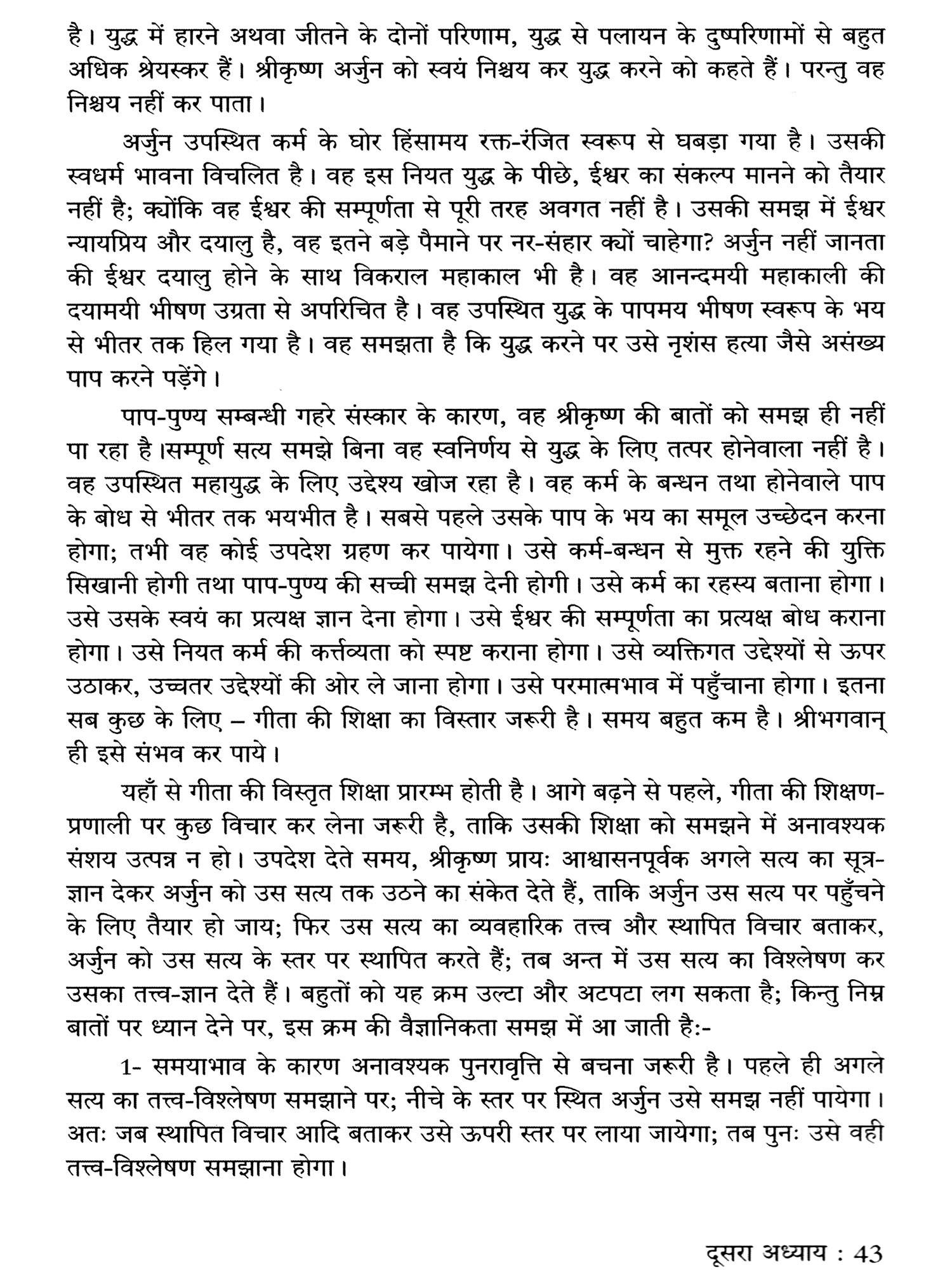 ऐसा सघ जाने पर यह पर्याप्त भी है। फिर भी, गीता को समझाने के लिए अथवा उसमें गर्भित ज्ञान के अनावश्यक समर्थन में, प्रायः अन्य ग्रंथों से उद्धृत अंशों का सहारा लिया जाता है; जो मेरे मत में उचित नहीं है। ऐसे प्रयासों से, गीता का यथार्थ ओझल हो सकता है। अपने मत को गीता से समर्थित सिद्ध करने के उद्देश्य से भी अन्य ग्रंथों के उद्धरणों का भरपूर उपयोग होता आया है; जिनके के कारण आज गीता के सही आशय को समझ पाना ही दुःसाध्य हो गया है। इसीलिए "गीता-सन्देश" में अन्य ग्रंथों से कहीं भी कुछ भी उद्धृत नहीं किया गया है। आशा है कि उद्धृतांशों से रहित "गीता-सन्देश" गीता के यथार्थ को समझने और खोजने में सहायक होगा।