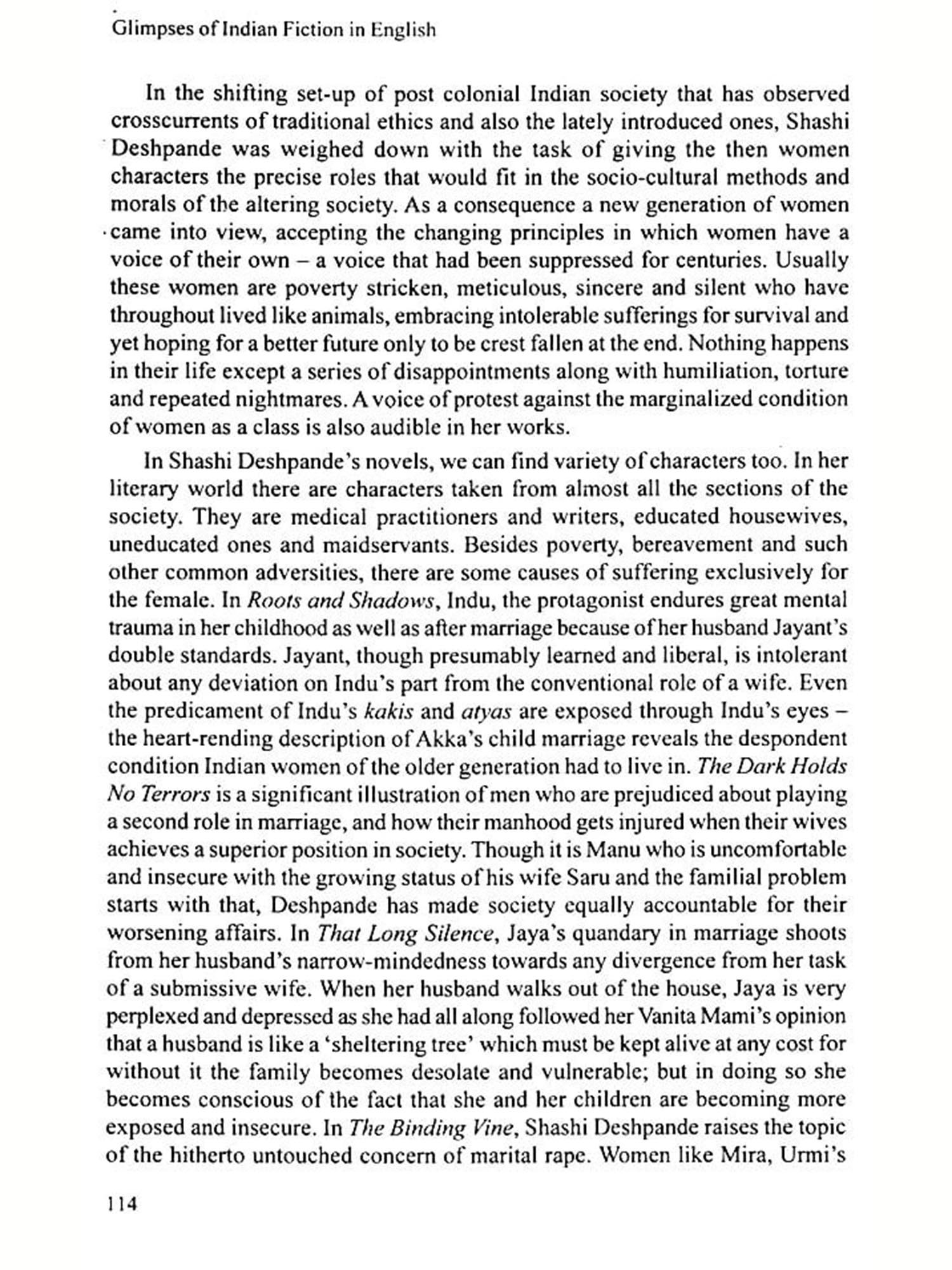 The emphasis is on the broad theme of a story and its style of expression. Anand's tragic life-view, Narayan's ironical approach and Rao's philosophical inter-pretation of human experiences have been deftly analyzed before moving on to search for roots in a Diaspora of writings and probing into the complexities of modern human relationships.