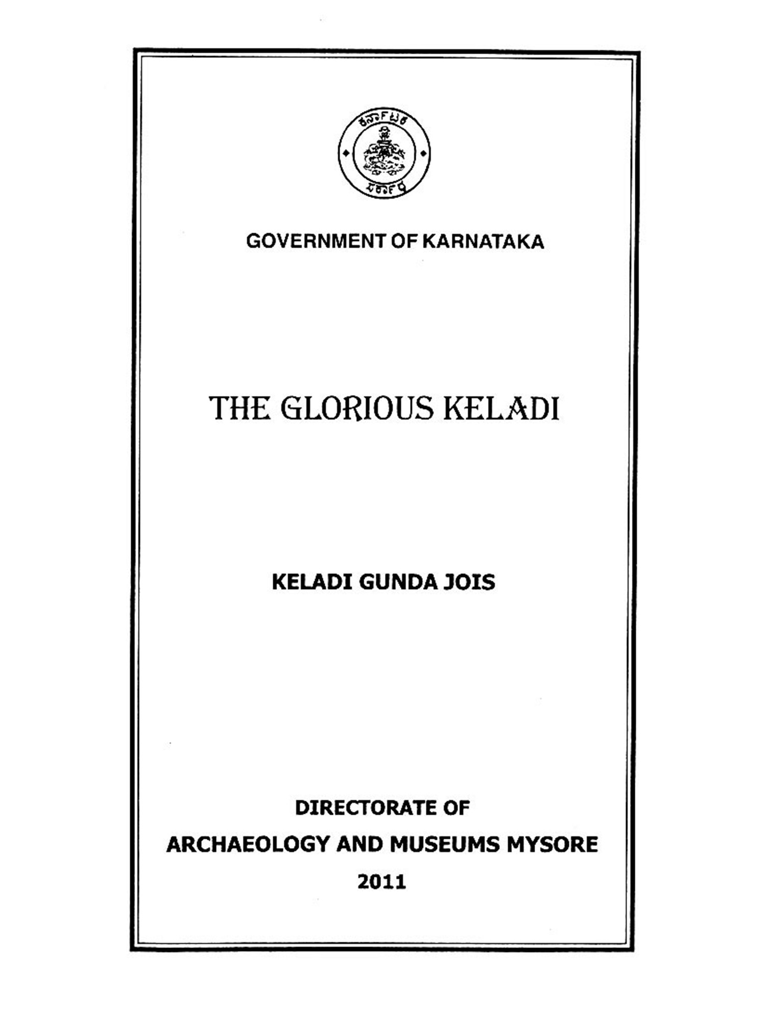 This fascinating story of the past has been narrated graphically by Keladi Gunda Jois, a veteran in the field of Keladi history and culture. He has been mainly responsible for the establishment of the Keladi Museum and Research Institute. For the past three decades he has been writing on various aspects of Keladi. The present monograph written to acquaint general readers of the glory of Keladi is sure to be warmly welcomed for its simplicity. This will be useful in popularizing the cultural heritage of Karnataka to which this Directorate is committed. Hence I am happy to publish this interesting monograph from this Directorate. I hope the Kannadigas and others interested in our heritage will welcome monographs like the present one.