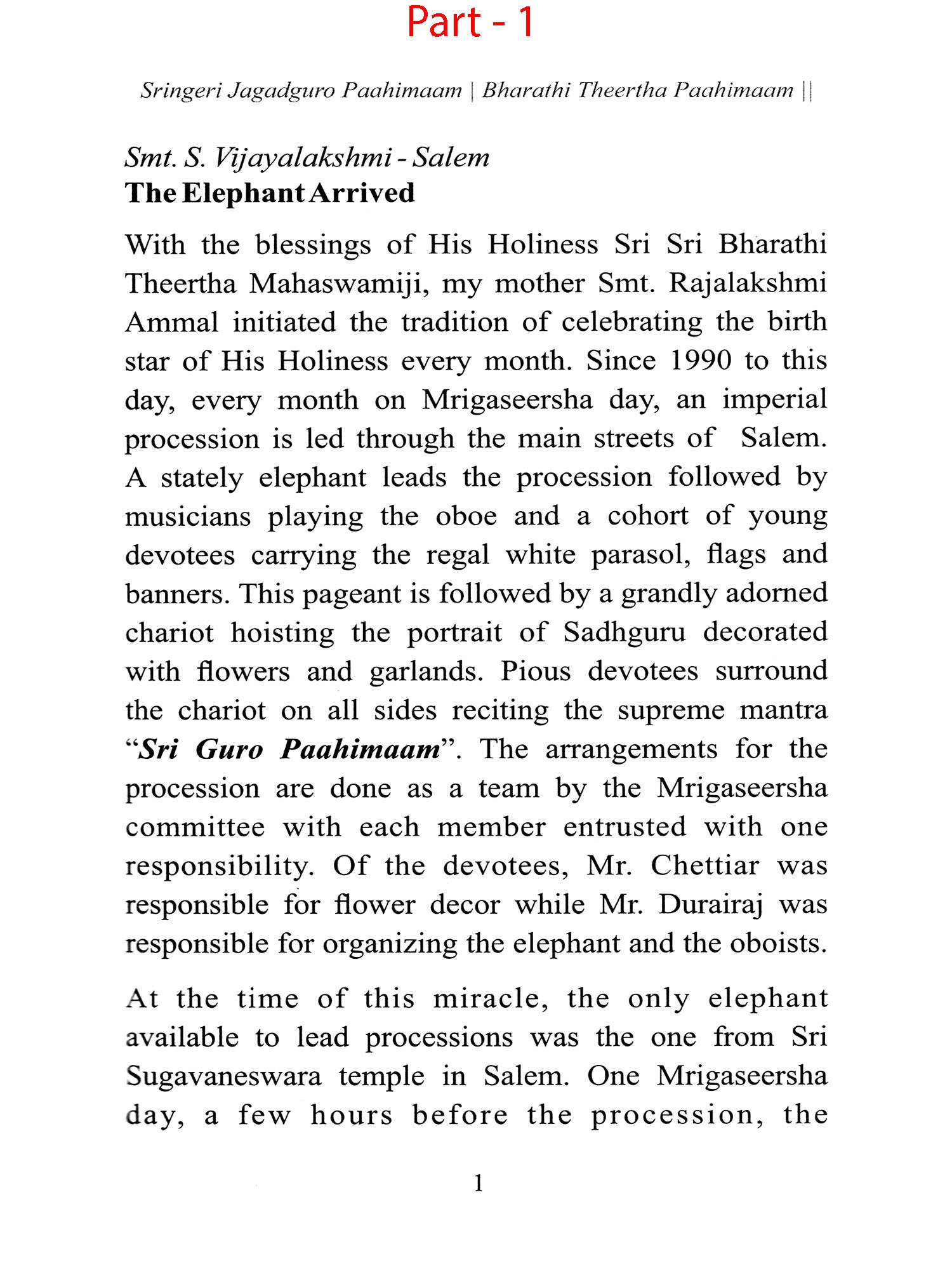 The President of Salem Sri Mrigaseersha Committee, Smt. S. Vijayalakshmi, is an ardent devotee of His Holiness Sri Sri Bharathi Theertha Mahaswamiji. Out of her profound devotion, she has resolved to publish a compilation to elucidate the transcendental glory of His Holiness to commemorate His 60th birthday. Each of us has much to benefit by reading this book. She requested several devotees who had sustained the grace of His Holiness to share their personal life experiences. These singular experiences have been compiled into this book with the sole, superior purpose of proclaiming the greatness of His Holiness, who bears the absolute blessings of Mother Sri Sharada and who is also the incarnation of Goddess Saraswathi.