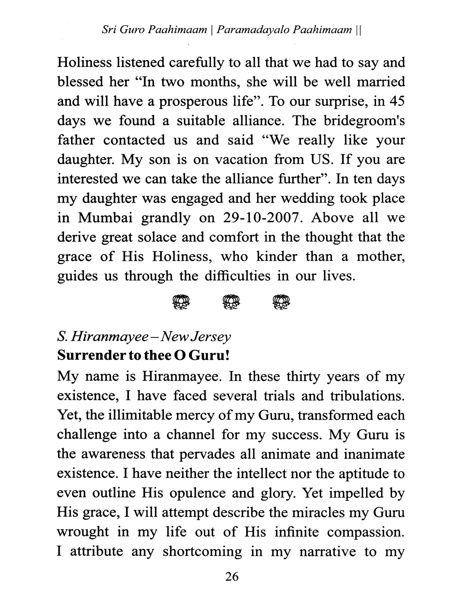 Smt. S. Vijayalakshmi, who has undertaken arduous efforts to publish this book, is often consulted by devotees for relief from various trials and impediments. Based on Prasnam, a branch of astrology, she prescribes expiatory worship to those who consult her. Prior to practicing Prasnam, she invokes the inimitable blessings of His Holiness. As a result, all her clients reap complete solace and succor. Also with the sovereign grace of His Holiness, she has presented us this exceptional book titled "Guru Mahimai". I extend my heartfelt compliments and best wishes to her.