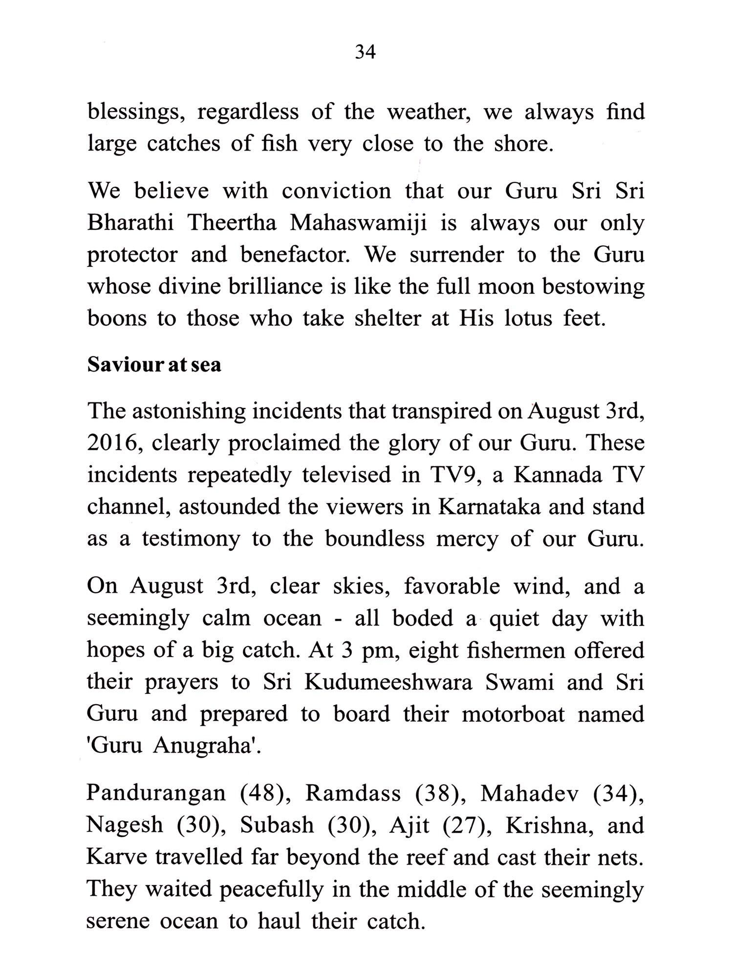 "For those people who take refuge in me and contemplate of none but me, I take the responsibility of granting everything they need and preserving everything granted" - thus proclaimed Lord Krishna in the Bhagavad Gita. The same omnipotent personality of Godhead, who made His pledge in Gita as the Guru and guiding light to Arjuna, has reincarnated in our midst as the Shankaracharya of Sringeri, His Holiness Sri Sri Bharathi Theertha Mahaswamiji. One does not need unique qualifications to receive the boundless grace of that effulgent Sun other than the willingness to surrender whole-heartedly. The generosity of His Holiness and His illimitable mercy transcend caste, creed and religion differences to fulfill the needs of those who seek Him. Our Guru, the resplendent star of the unbroken chain of Sringeri Shankaracharyas, has showered countless blessings on us. Words are insufficient to describe His glory, which is why the scriptures proclaim Guru as the embodiment of The Trinity, Brahma, Vishnu and Shiva.