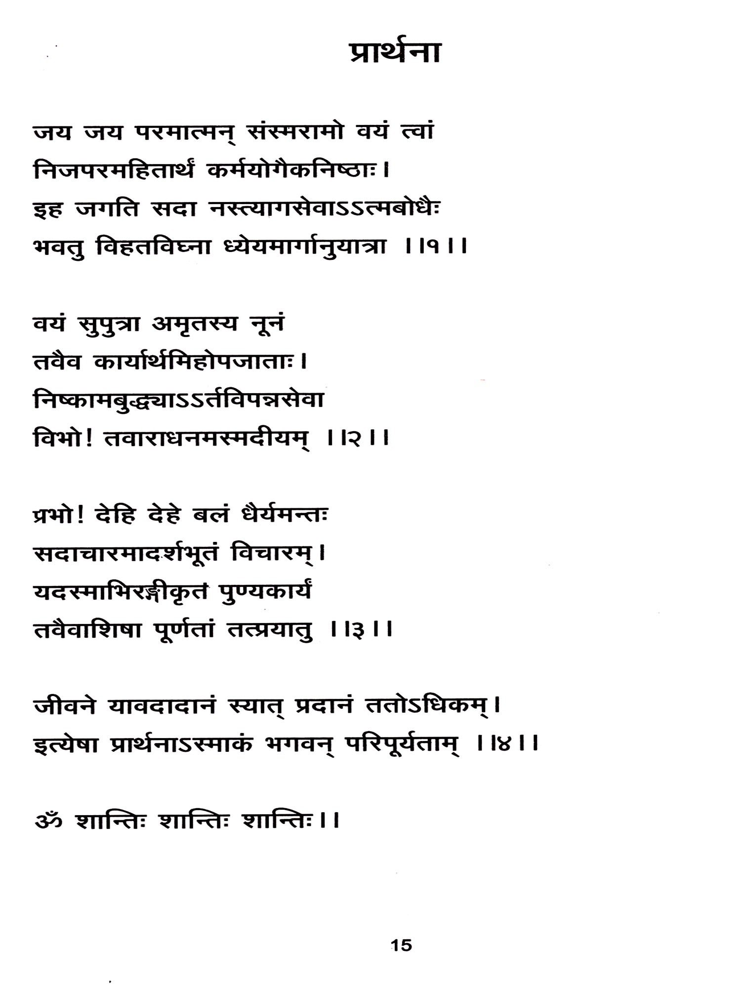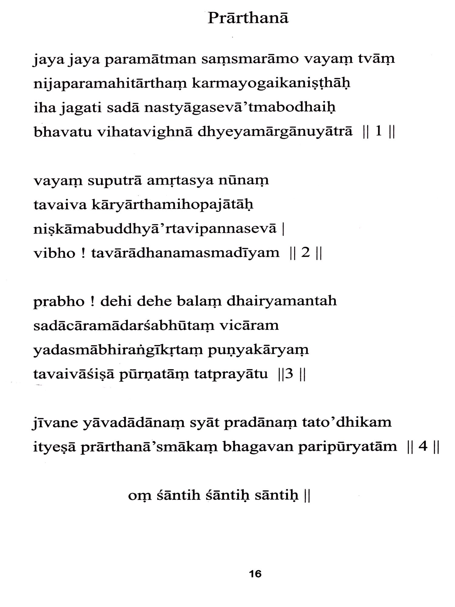 When people come together to form organisations for a great purpose, it is found that appropriate forms of prayer are evolved in the natural course. It fulfils a great psychological necessity. It binds the members together by a common aspiration. They become fellow-pilgrims to a common destination. It steels their determination to face hurdles of the way and walk hand in hand until they reach the abode of the "Divine" - the cherished Goal of the organisation. The subtle Sentiments vibrating through the words of the prayer have the effect of a "Mantra".