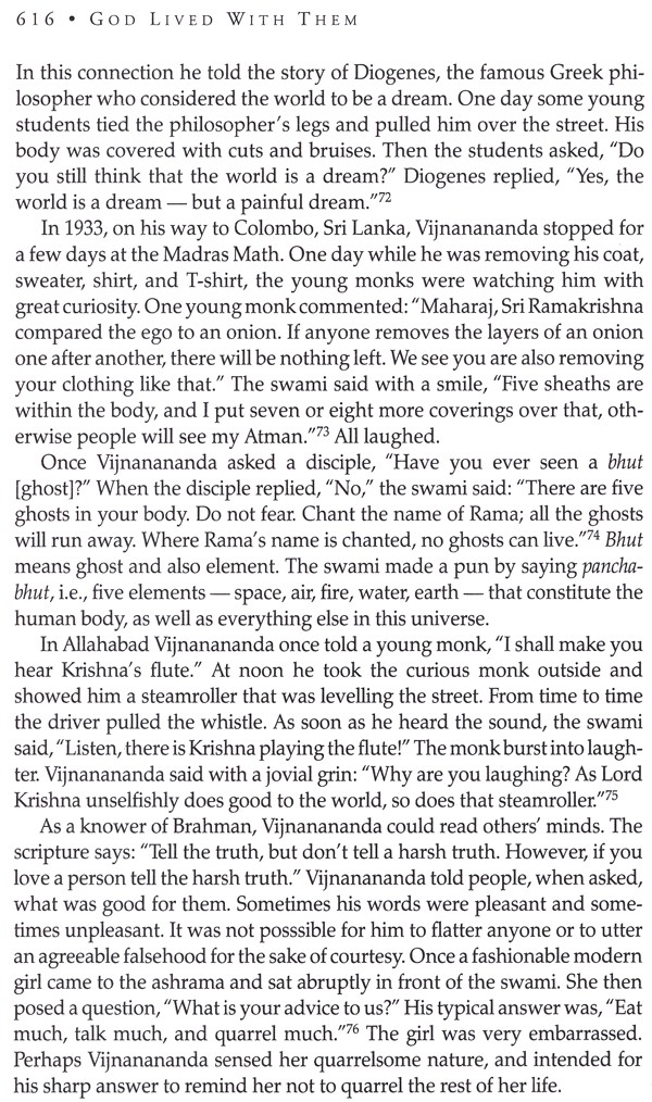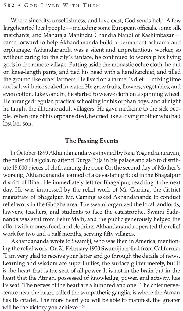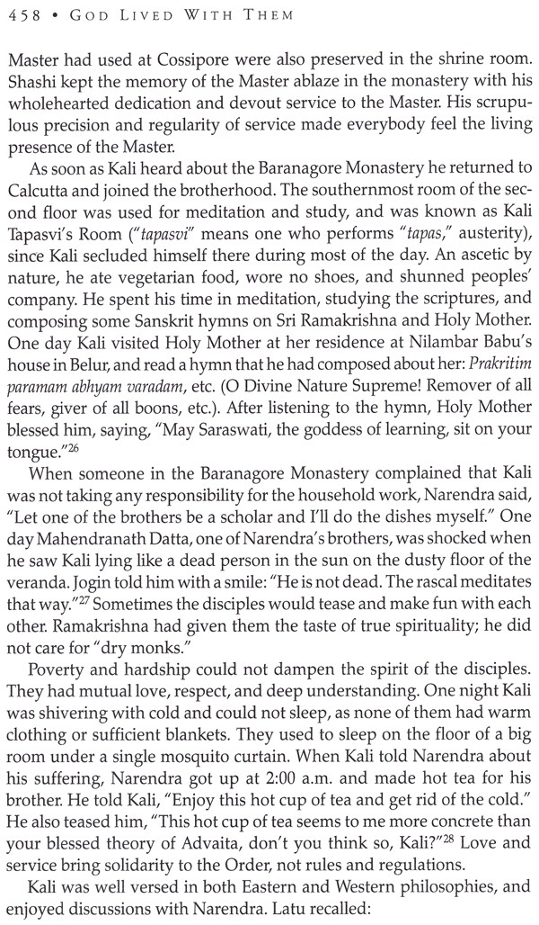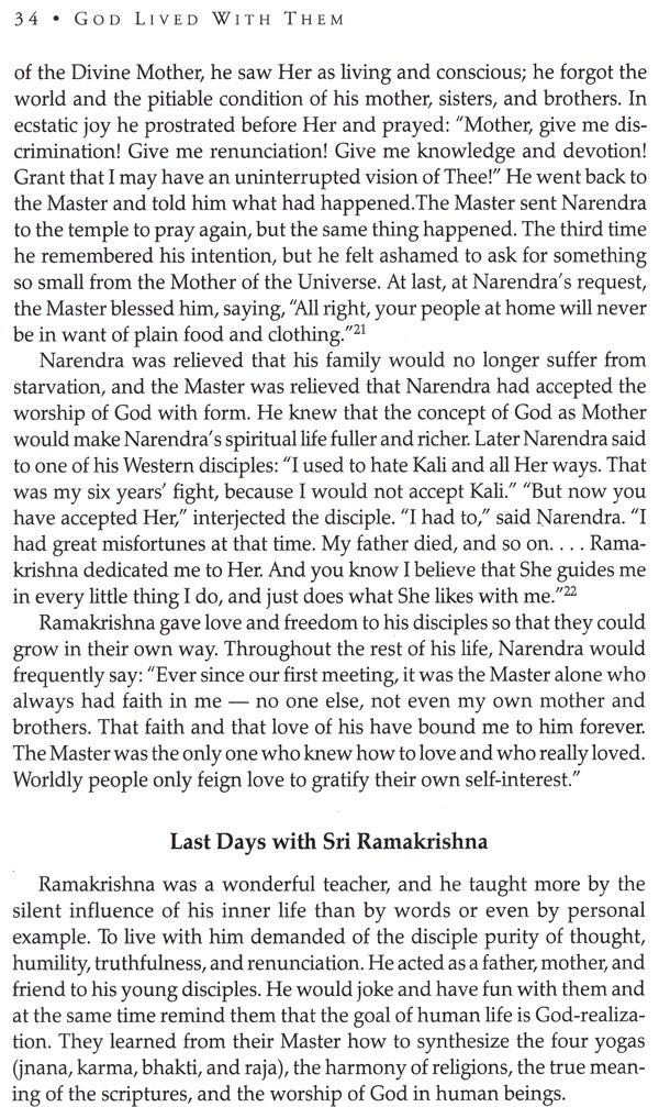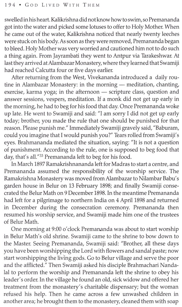 The present book God Lived with Them contains the life stories of sixteen monastic disciples of Sri Ramakrishna, whereas They Lived with God (published by Shepherd and Walwyn of London and the Vedanta Society of St. Louis in 1989 and Advaita Ashrama of Calcutta in 1991) contains the life stories of thirty-one prominent householder devotees. Taken together, these forty-seven biographies depict how Sri Ramakrishna's teachings manifested and came to fruition in his disciples' lives. To me, Sri Rama Krishna is like a chandelier and his disciples and devotees are like bulbs of different wattages radiating the light, or wisdom, of their Master. I feel blessed that for the last five years I have been able to travel, mentally of course, with these sixteen disciples from each one's birth to his death. I observed their unique love and faith in their guru, their purity and renunciation, their training and austerity, their struggle and longing for God, their spiritual unfoldment and unselfish service to humanity.