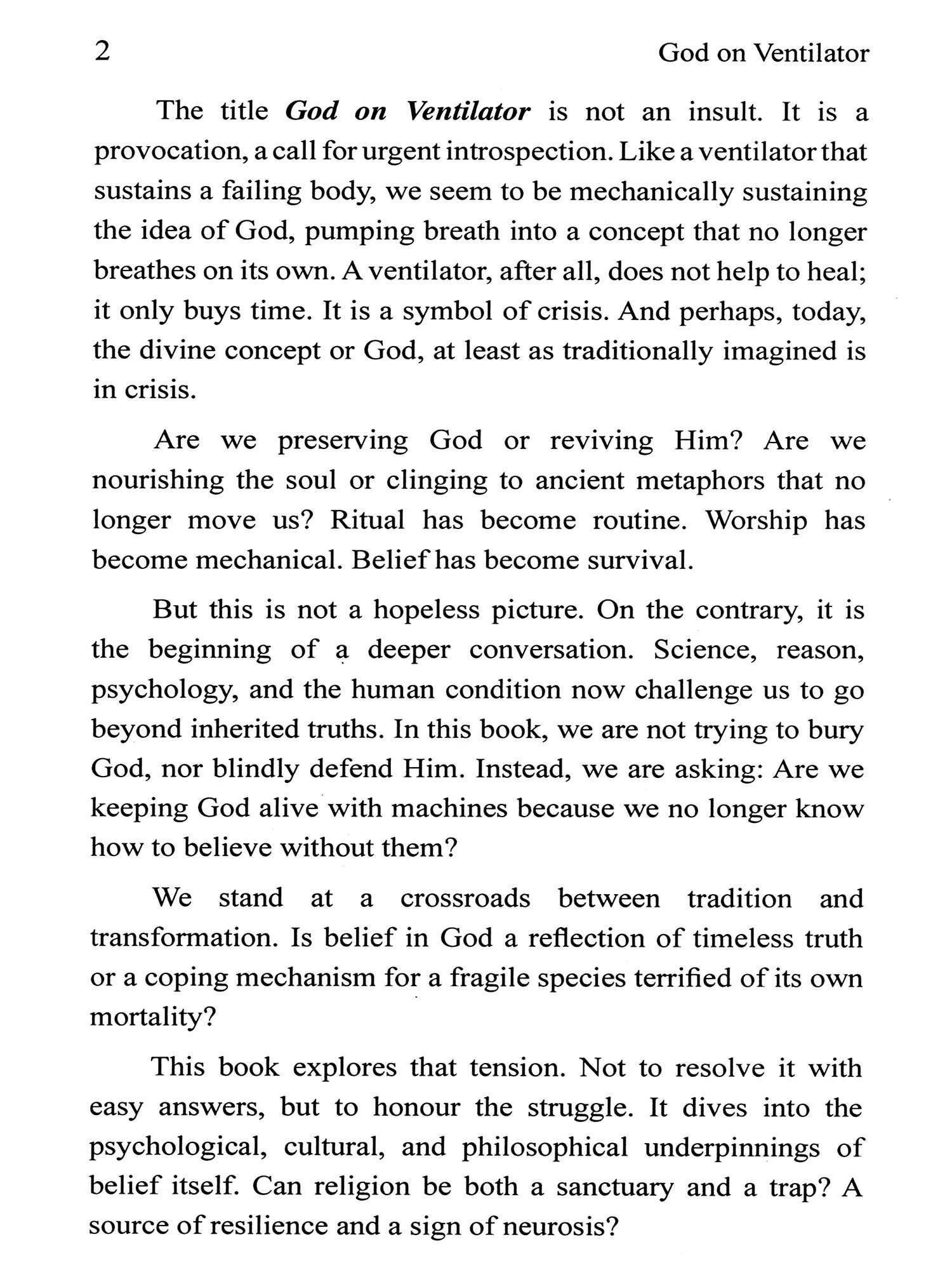 The title of this book, God on Ventilator, immediately sparks curiosity. It plants a question in the reader's mind and builds a strong desire to uncover what lies within its pages. Dr. K.P. Wasnik has taken on a bold and abstract subject and skillfully explored it through deep research and philosophical analysis. He gently initiates the reader into the idea of God's existence, only to later challenge and ultimately deconstruct that very idea using the principles of Buddhist philosophy.