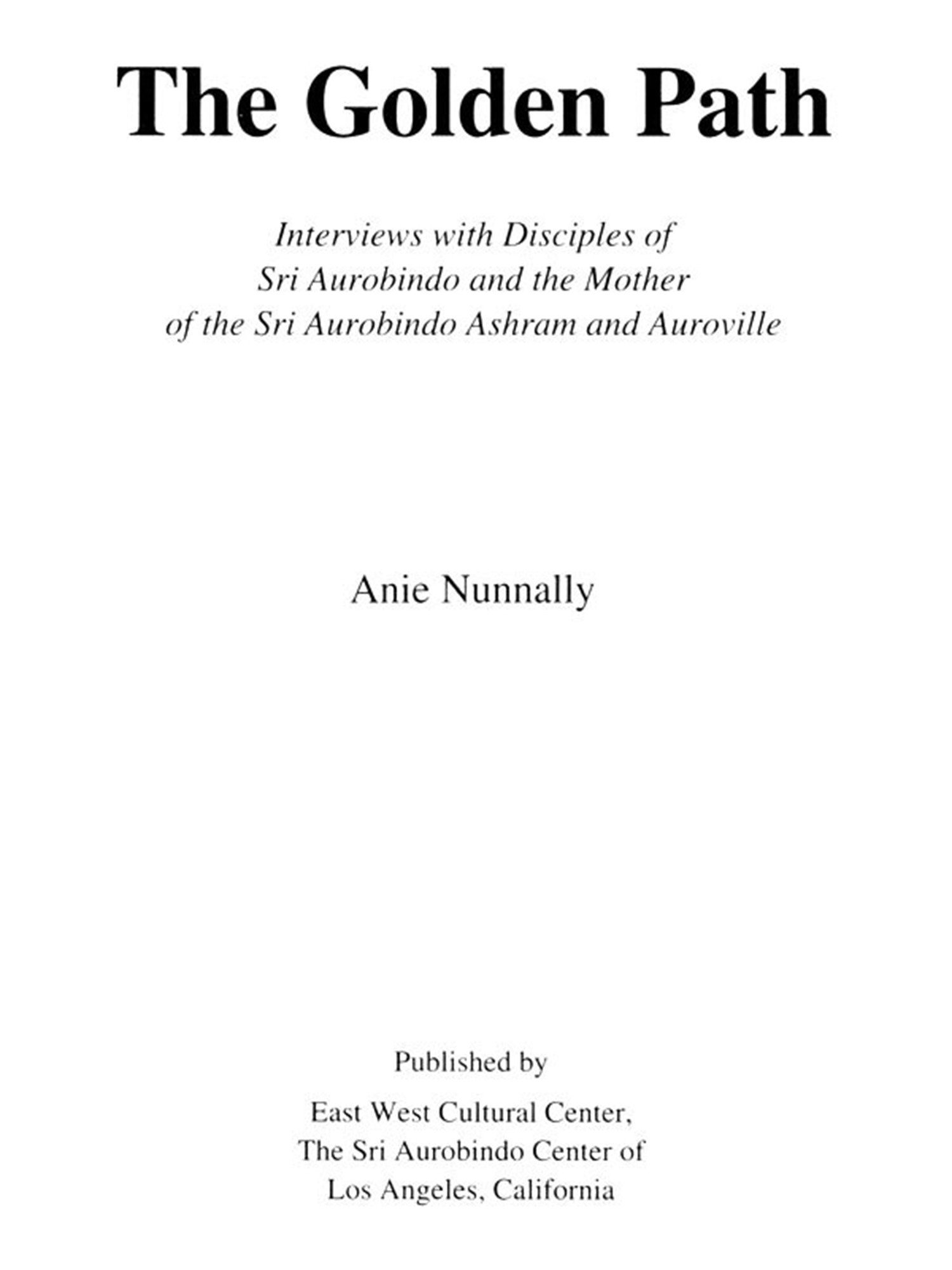 While she was in the body, the Mother at the Sri Aurobindo Ashram in Pondicherry, India, was both externally and internally the heart and raison d'être of everyone's existence there and each one's daily life gravitated around her and her radiant presence. The sense of a collective yoga was in-tensely experienced and the "howto's" were close at hand, because the Mother was available to answer to every specific circumstance. Anie Nunnally, whose name Anie was given to her by the Mother, spent four precious years at the Sri Aurobindo Ashram and Auroville from 1968 to 1972. She had gone there with the Mother's permission and with the sole purpose of being under her spiritual aegis. During her years there she was associated with the Mother through letters and both public and private darshans. This was the time during which the Mother was at the height of her in-tense inner work with the descent of the supramental consciousness. Anie became deeply aware of the Mother's yoga shakti in her own life and in the lives of sadhaks of the Ashram with whom she has formed many deep and abiding friendships.
