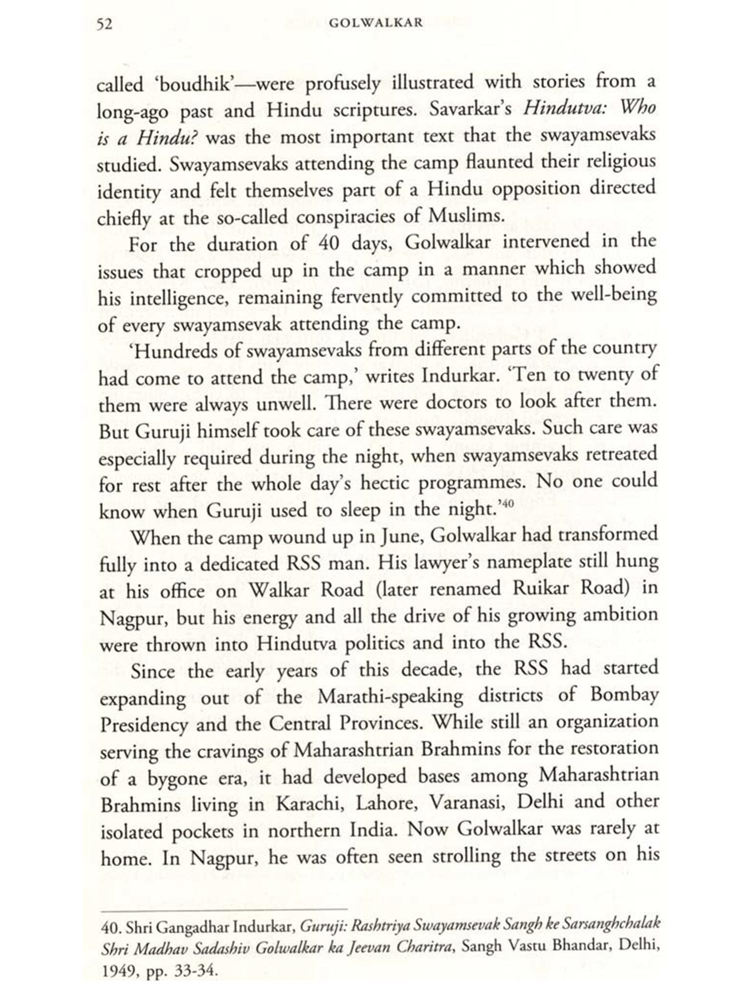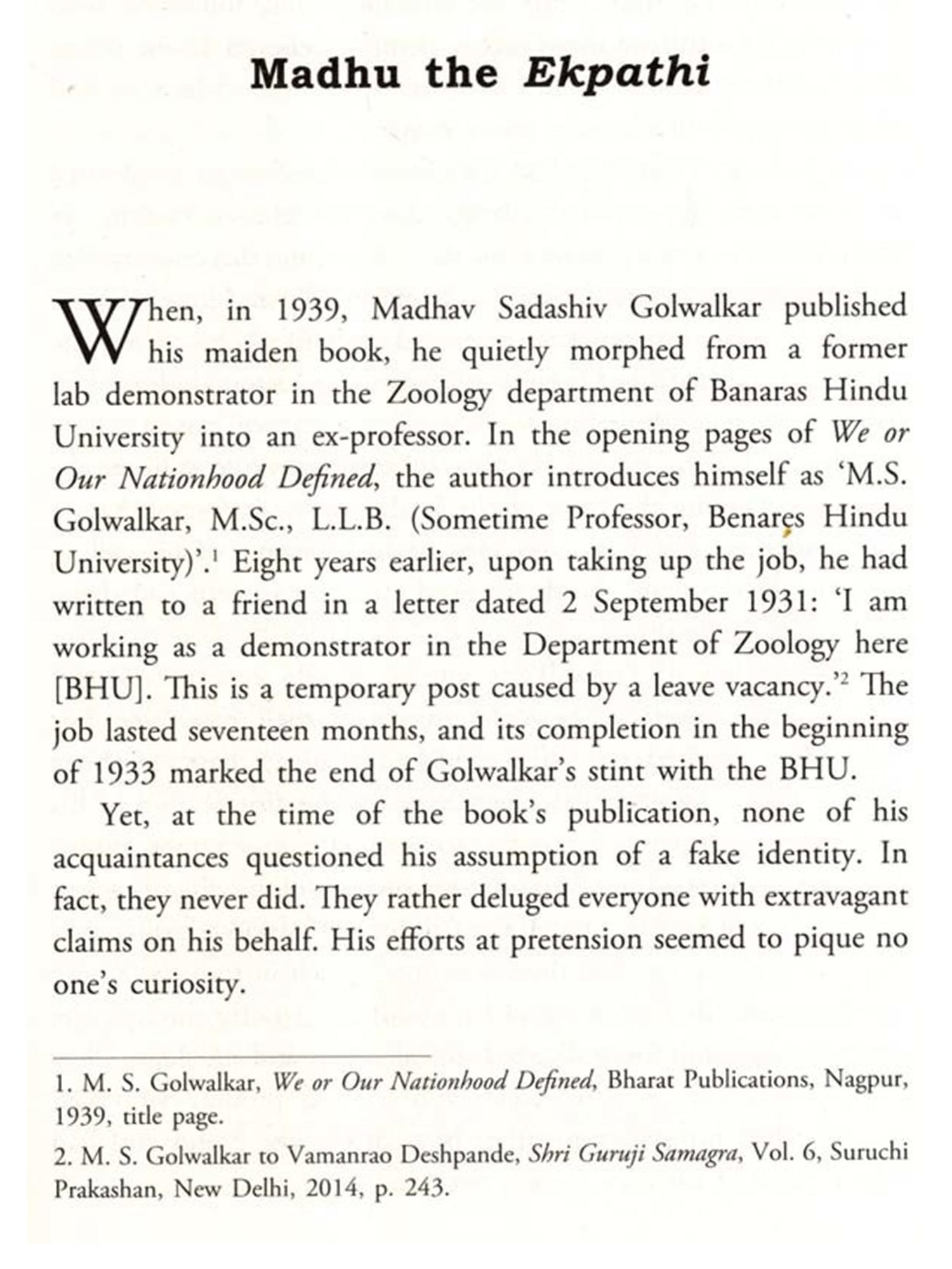 In 1939, months before Hitler forced the world into a catastrophic global war, a book that proposed a Hindu nationalist approach to India's minority communities, especially Muslims, along the lines of the Nazi treatment of Jews in Germany, was published quietly in India. The book's author, Madhav Sadashiv Golwalkar, was thirty-three years old. He was slim and spirited and smoked cigarettes continually. His dark eyes were bright and communicative, and his long black hair merged with the overgrown bushy beard that gathered below his chin, elongating his thin face. He had grown up in mofussil towns of central India and studied Zoology at Banaras Hindu University in the quintessential holy city of Varanasi on the Ganga. At the time, Golwalkar was yet to be thoroughly assimilated into the Rashtriya Swayamsevak Sangh, a Hindu militia set up in 1925, although he had been hovering around its leader, Dr. K. B. Hedgewar, for more than a year. The publication of the book, We or Our Nationhood Defined, may have been a subdued affair, but it served Golwalkar well. His status grew rapidly, and a little over a year later, upon the death of Hedgewar in 1940, he shot to the top of the RSS, becoming its second leader.