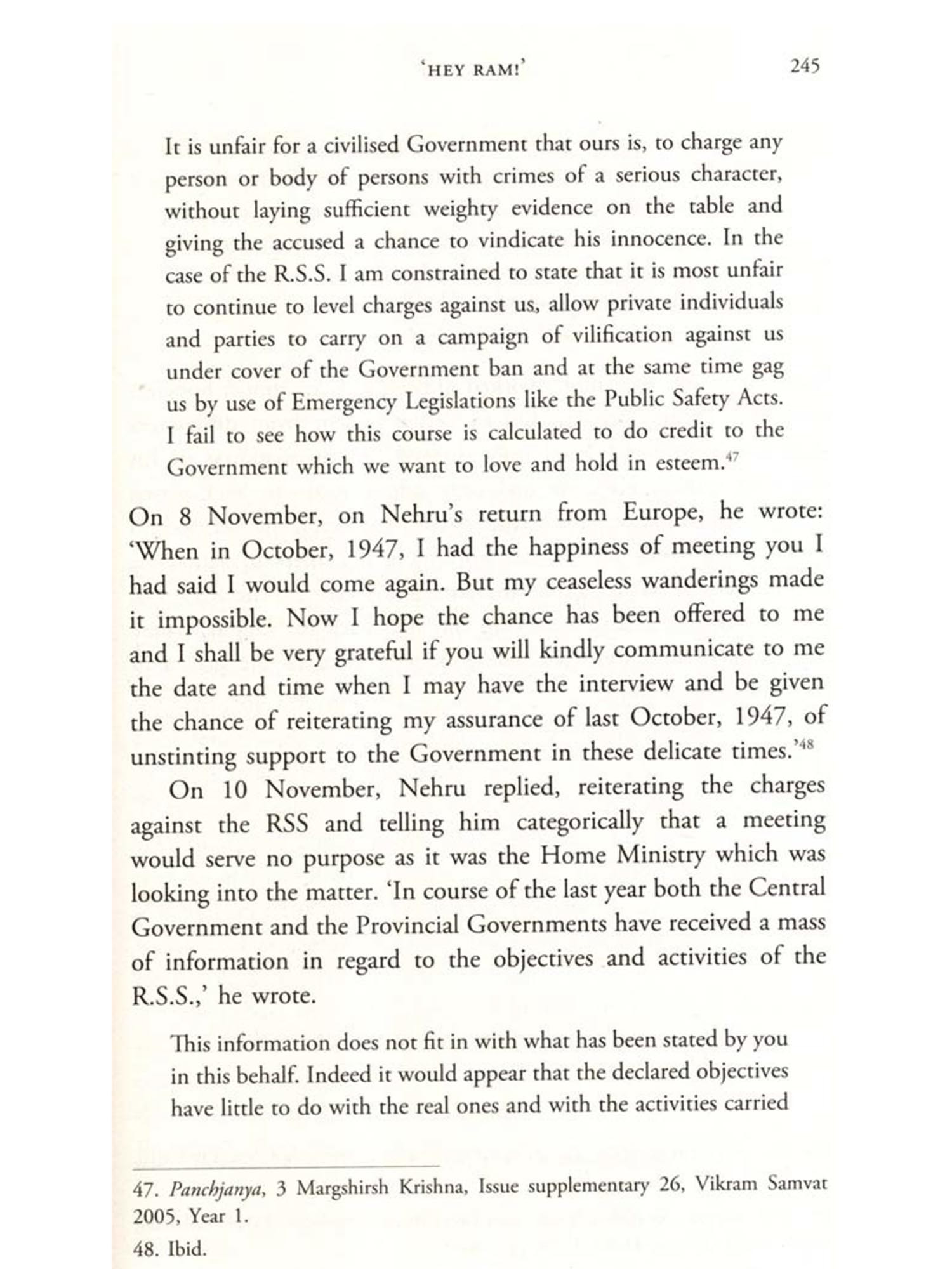 Golwalkar now stopped talking about We or Our Nationhood Defined. But the book's thesis continued to remain at the core of the RSS ideology, a fact that was noted by J. A. Curran Jr., an American researcher who produced the first well-investigated book on the RSS two years after the ban was revoked. Following his extensive interactions with Golwalkar and a large number of RSS leaders and cadres, Curran concluded in his 1951 book that despite the ban and massive public outrage against the RSS in the wake of Mahatma Gandhi's assassination, the organization's real ideology continued to be based on We or Our Nationhood Defined. 'We can be described as the R.S.S. "Bible"," Curran wrote. 'It is the basic primer in the indoctrination of the Sangh volunteers. Although this book was written twelve years ago, in a national context different from the contemporary one, the principles contained in it are still considered entirely applicable by the Sangh membership.'