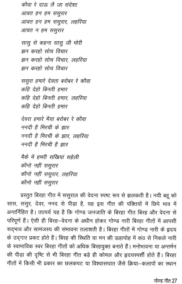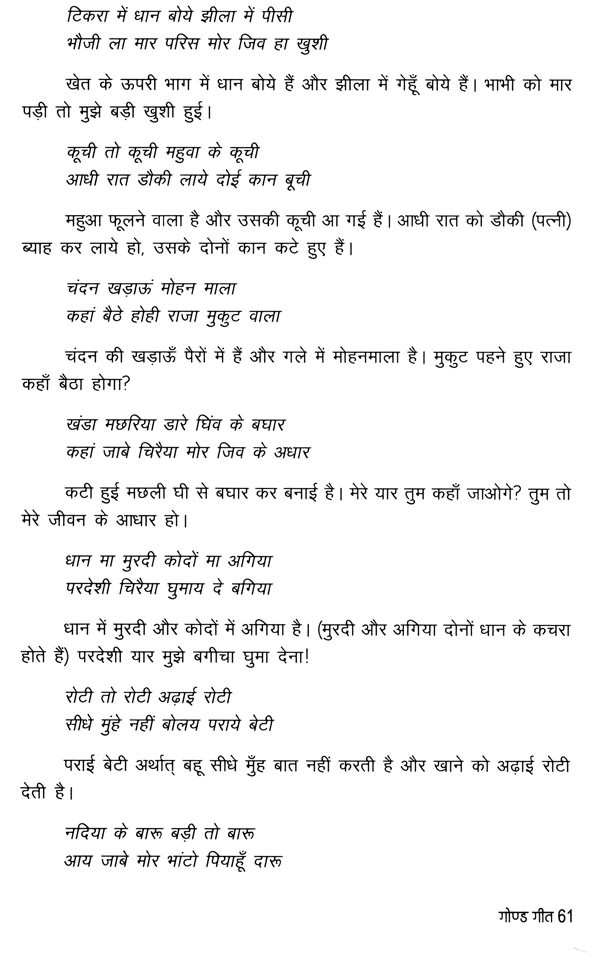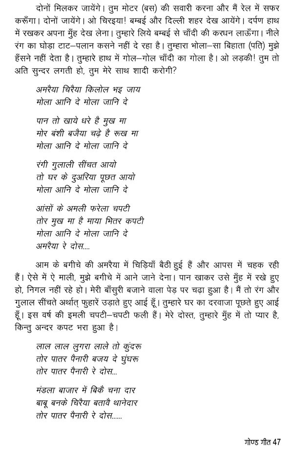 जनजातीय एवं लोक संगीत में मेरी अभिरूचि बचपन से ही रही है। गाँव की गम्मतों में लोग अपने मनोरंजन के लिये भजन, कीर्तन, करमा, ददरिया, बम्बुलिया, राई, गारी आदि अनेक लोकगीतों का गायन करते थे। मैं भी गम्मत में जाकर बैठता और जो मन का स्वर मिलता, उनके स्वर में स्वर मिलाता था। पद्मश्री शेख गुलाब के सान्निध्य में जनजातीय और लोक संगीत सीखने का खुला अवसर प्राप्त हुआ। कालान्तर में मेरी अभिरूचि विकसित हुई और गोण्ड जनजाति के गीतों के संकलन का विचार मन में आया। मैंने कतिपय जनजातीय ग्रामों का भ्रमण कर गाँव के बुजुर्ग और अनुभवी व्यक्तियों से भेंट की। गाँवों में रात्रि विश्राम किया। उनके घरों में भोजन किया, उनके साथ नाचा-गाया और जंगल, पहाड़ों की सैर भी की। जनजातियों के जन्म, विवाह और मरण-संस्कारों में शामिल होकर उन्हें नजदीक से देखा। गोण्ड जनजाति के गीतों की बारीकियों, परम्पराओं, रीति-रिवाजों, प्रथाओं आदि को अच्छी तरह से समझ कर आत्मसात किया। गोण्ड जनजाति के जो भी गीत पुस्तक में दिये गये हैं, वे विशुद्ध रूप से मौलिक एवं पारम्परिक हैं। प्रत्येक गीत के साथ कोई न कोई प्रथा, रस्म या परम्परा जुड़ी रहती है। गोण्ड जनजाति में अनेक प्रथाएँ और परम्पराएँ होती हैं। लोकगीत जब अंतरा के साथ गाया जाता है, तो अंतरा-दर-अंतरा में गायकों के मध्य होड़ सी लग जाती है। कतिपय ऐसे लोक गीत होते हैं, जिनमें एक अंतरा सवाल का होता है, तो दूसरे अंतरा में जवाब दिया जाता है। लोकगीतों की एक प्रकृति यह भी होती है कि अंतरा की पहली पंक्ति के भाव दूसरी पंक्ति के भाव से मेल नहीं खाते हैं। केवल तुकबन्दी से ही गायकों और श्रोताओं को आनन्द आता है। क्योंकि गीतों में कुछ शब्द ऐसे होते है, जिनका कोई अर्थ नहीं होता है, किन्तु उनके बिना लोकगीत पूरा भी नहीं होता। लोकगीतों में तुकबन्दी का विशेष महत्त्व होता है और वही सर्वोपरि होता है। अनुवाद की दृष्टि से देखेंगे तो अन्तरा की प्रथम पंक्ति का अर्थ अगली पंक्ति से मेल नहीं खाता है। गायक और श्रोता को गीतों की पंक्तियों से निकलने वाले भावानंद से ही सरोकार होता है। लोक गीतों के अनुवाद में भावार्थ का सहारा भी लेना पड़ता है। कतिपय लोकगीतों के शब्द गूढ़ होते हैं, किन्तु इनका भावार्थ विस्तृत होता है। कतिपय लोकगीतों के अनुवाद में केवल मुखड़ा और अंतरा का अनुवाद किया गया है। अंतरों के साथ बार-बार मुखड़ा आया है, उसका अनुवाद नहीं किया गया है। लोकगीत की एक पंक्ति से दूसरी पंक्ति के भावार्थ में कोई तारतम्य जरूरी नहीं है। जन मानस भी इसकी परवाह नहीं करता है।