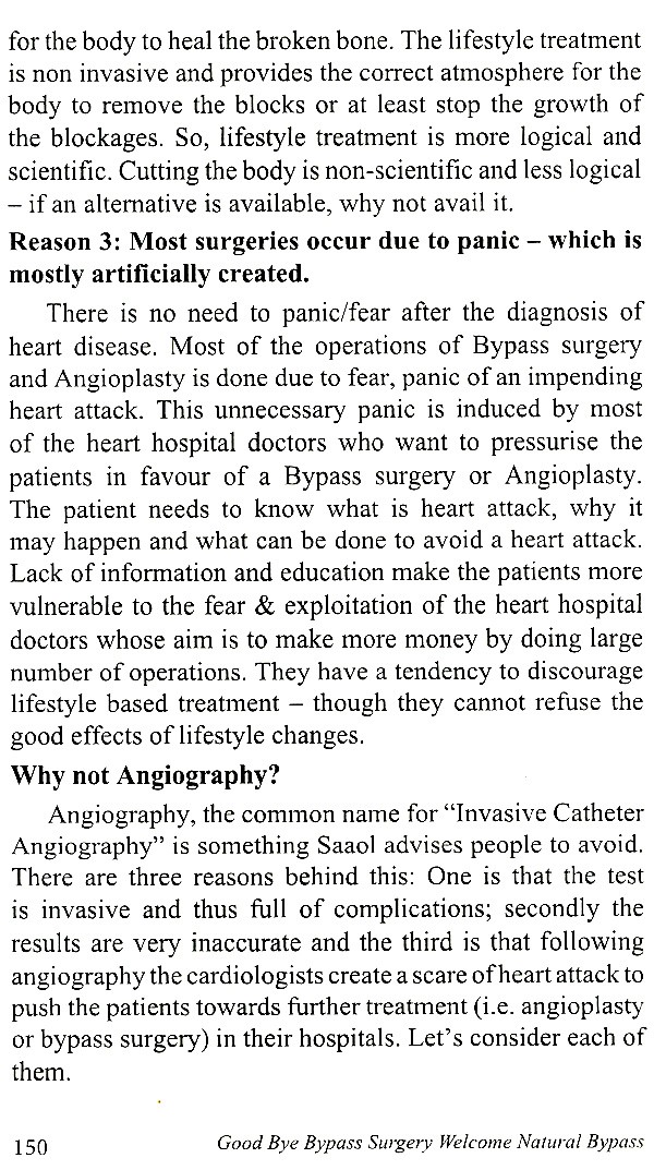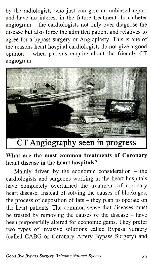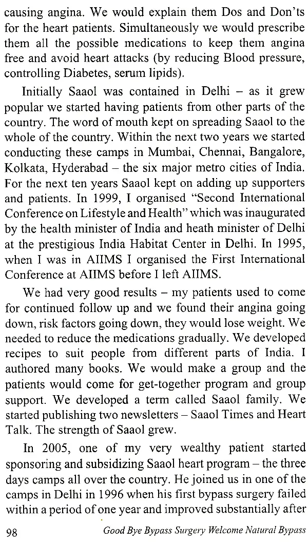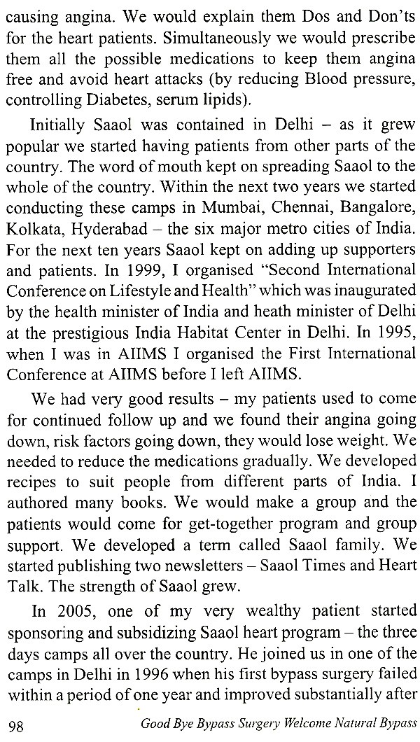But then at the age of 25 years (after a particular incident which changed my life) my faith in the prevailing system of modern medicine took a big beating - when I realised that the whole department of cardiology is working in the wrong direction - the system was going against the well-being of the patients. Instead of removing the cause of the disease every cardiologist was trying to solve the disease temporarily by medicines, angioplasty or Bypass surgery. The patients were not aware of what has caused the heart problem (their bad food habits, smoking, lack of exercise, stress and so on) and they would keep on growing the disease suffer from more angina or ultimately heart attacks. The prevailing cardiologists, I found, were over enthusiastic to treat them as an emergency patient threatening them of death unless they undergo operative procedures like Bypass surgery or Angioplasty. Those heart patients who have less angina were prescribed only medicine - without any education on heart care by lifestyle modification.