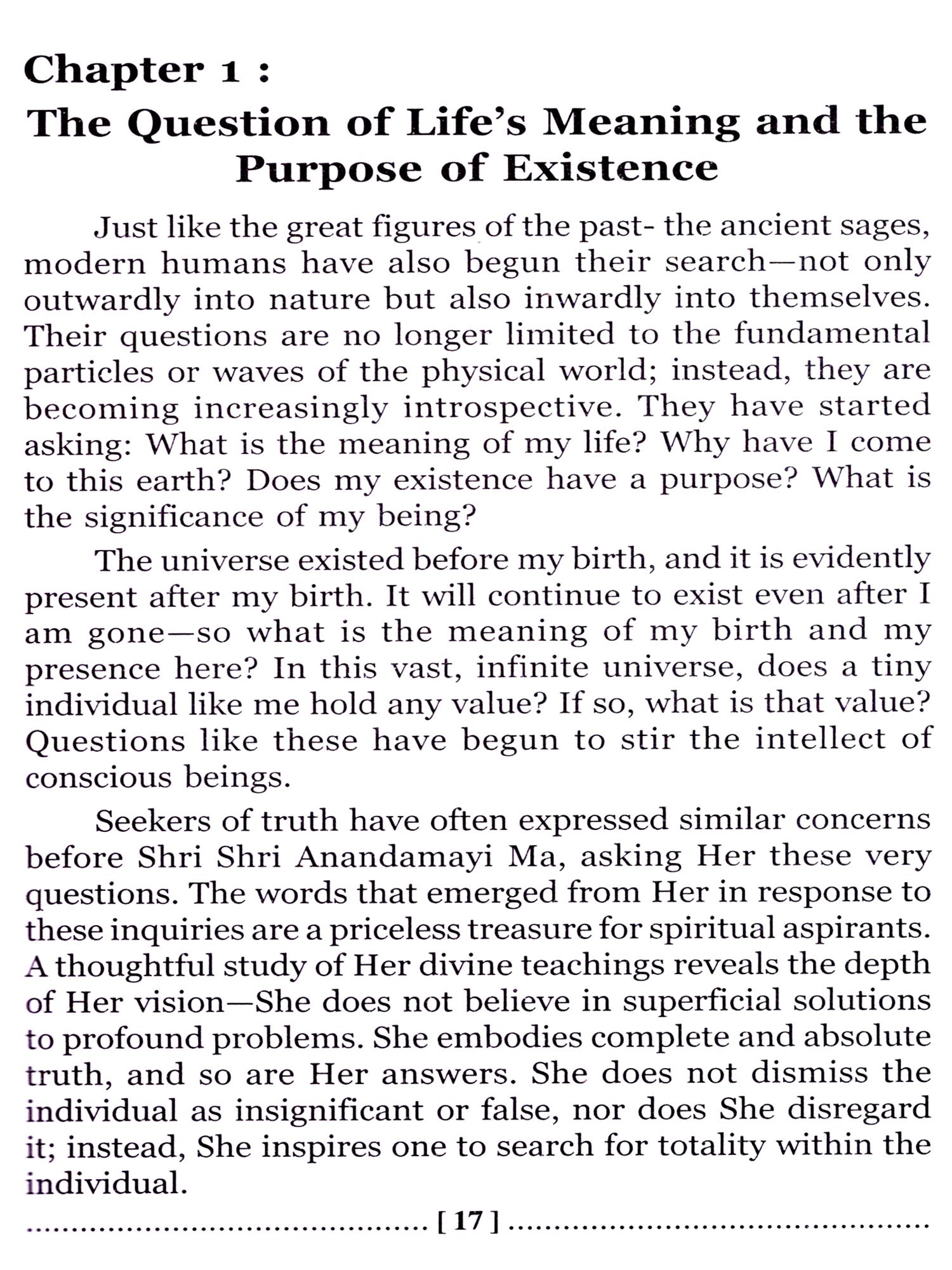 This book has its own uniqueness, compiling Shri Shri Ma's words scattered across different contexts on a single topic and presenting them under one title with a brief introduction. This task has been highly laborious, as the ocean of Shri Shri Ma's divine words is so vast that it appears to have no boundaries, no shore. However, as Shri Shri Ma has said, "Why consider toil and hardship in one's own work? The sense of hardship only arises when one does not see the work as their own." This is true. As the writing progressed, an indescribable joy kept growing, a deep sense of gratitude towards Shri Shri Ma awakened, and an inexpressible bliss and fulfilment flowed from within.