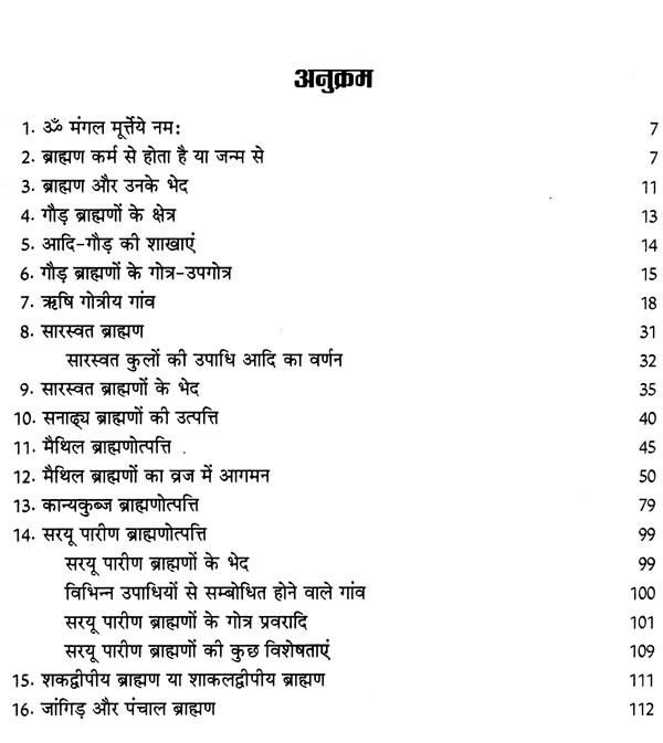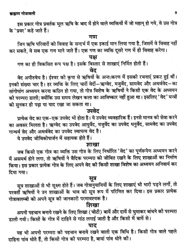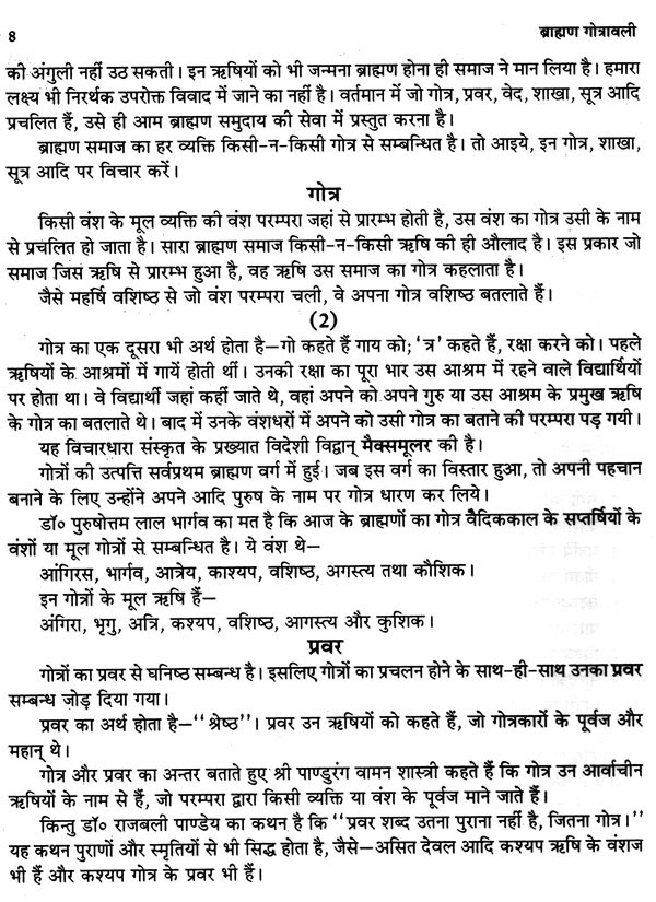 इस लघु पुस्तिका में केवल विध्योत्तर वासी ब्राह्मणों, जैसे-गौड, सारस्वत, मैथिल, कान्यकुब्ज, सरयूपारीण तथा उत्कल ब्राह्मणों के गोत्र, प्रवर, शाखा, सूत्र, शिखा, छन्द, उपवेद, आस्पद (उपाधियां) तथा मूल गावों का संक्षेप में वर्णन किया गया है। आशा है, जिज्ञासु ब्राह्मण युवकों की जिज्ञासा कुछ हद तक शान्त होगी, किन्तु ब्राह्मणों का ऋषि गोत्र एक सागर के समान है। उसमें से कुछ मोती ही चुनकर इस पुस्तक में रखने का प्रयास किया गया हैं। कृपालु पाठकों से निवेदन है कि यदि किसी कुल के गोत्र प्रवर आदि के निर्णय में विसगतियां दिखायी दें, जो उनकी परम्पराओं के विरुद्ध हों, तो कृपया हमें सूचित करें, जिससे अगले सस्करण में सुधार किया जा सकें।