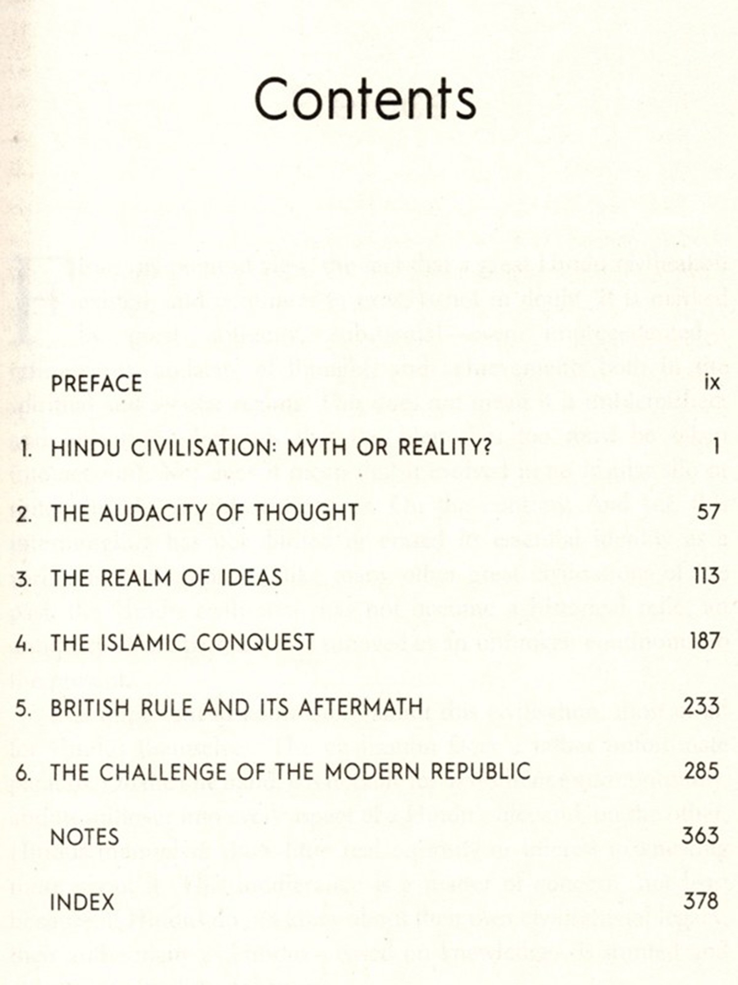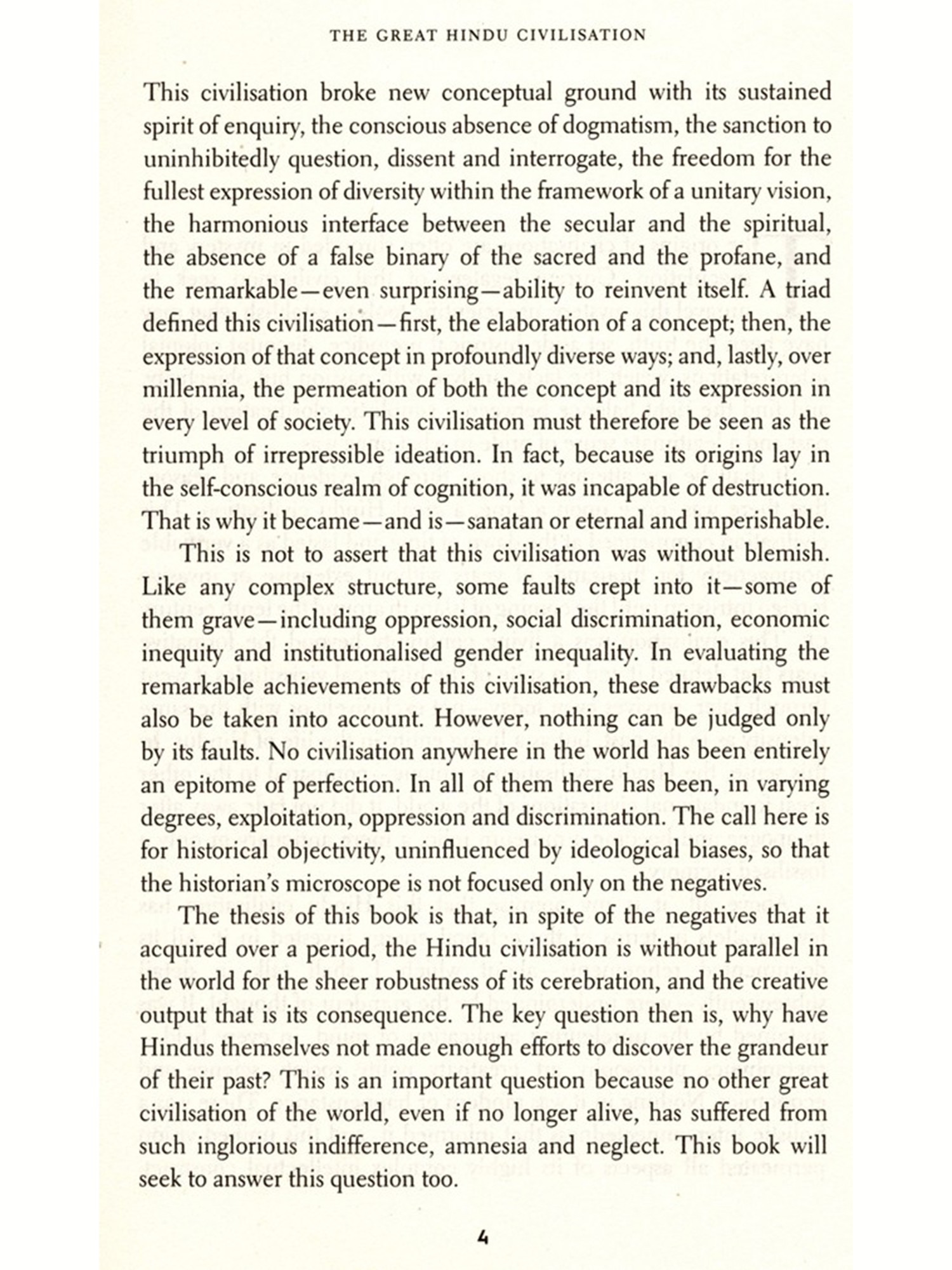 From my point of view, the fact that a great Hindu civilization existed, and continues to exist, is not in doubt. It is marked by great antiquity, substantial- even unprecedented- refinements, audacity of thought, and achievements both in the spiritual and secular realms. This does not mean it is unblemished, and objectivity demands that the blemishes too must be taken into account. Nor does it mean that it evolved in an insular silo or untouched by outside influences. On the contrary. And yet, this intermingling has not diluted or erased its essential identity as a verifiable civilization. Unlike many other great civilizations of the past, the Hindu civilization has not become a historical relic, an antiquary of the past, but has survived as an unbroken continuum to the present. It is important to know more about this civilization, most of all for Hindus themselves. The civilization faces a rather unfortunate paradox. On the one hand, it is notable for its resilience and continuity, and its spillover into every aspect of a Hindu's life; and, on the other, Hindus themselves show little real curiosity or interest in knowing more about it. This indifference is a matter of concern, not least because, if Hindus do not know about their own civilisational legacy, their authenticity as Hindus - based on knowledge - is stunted and reduced to ritualistic tokenism.