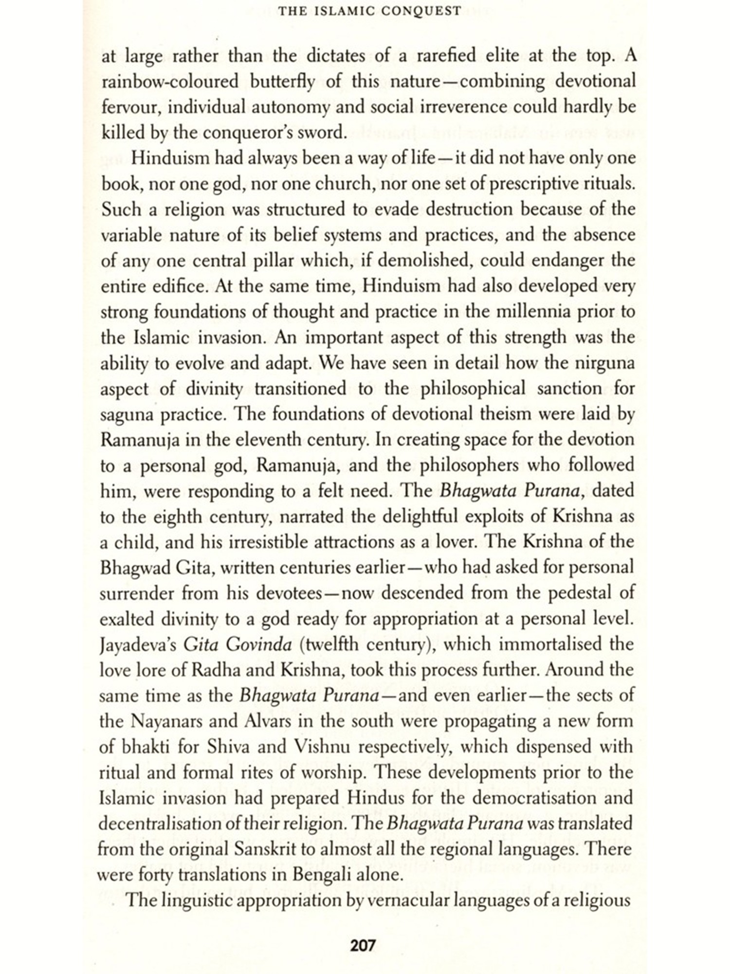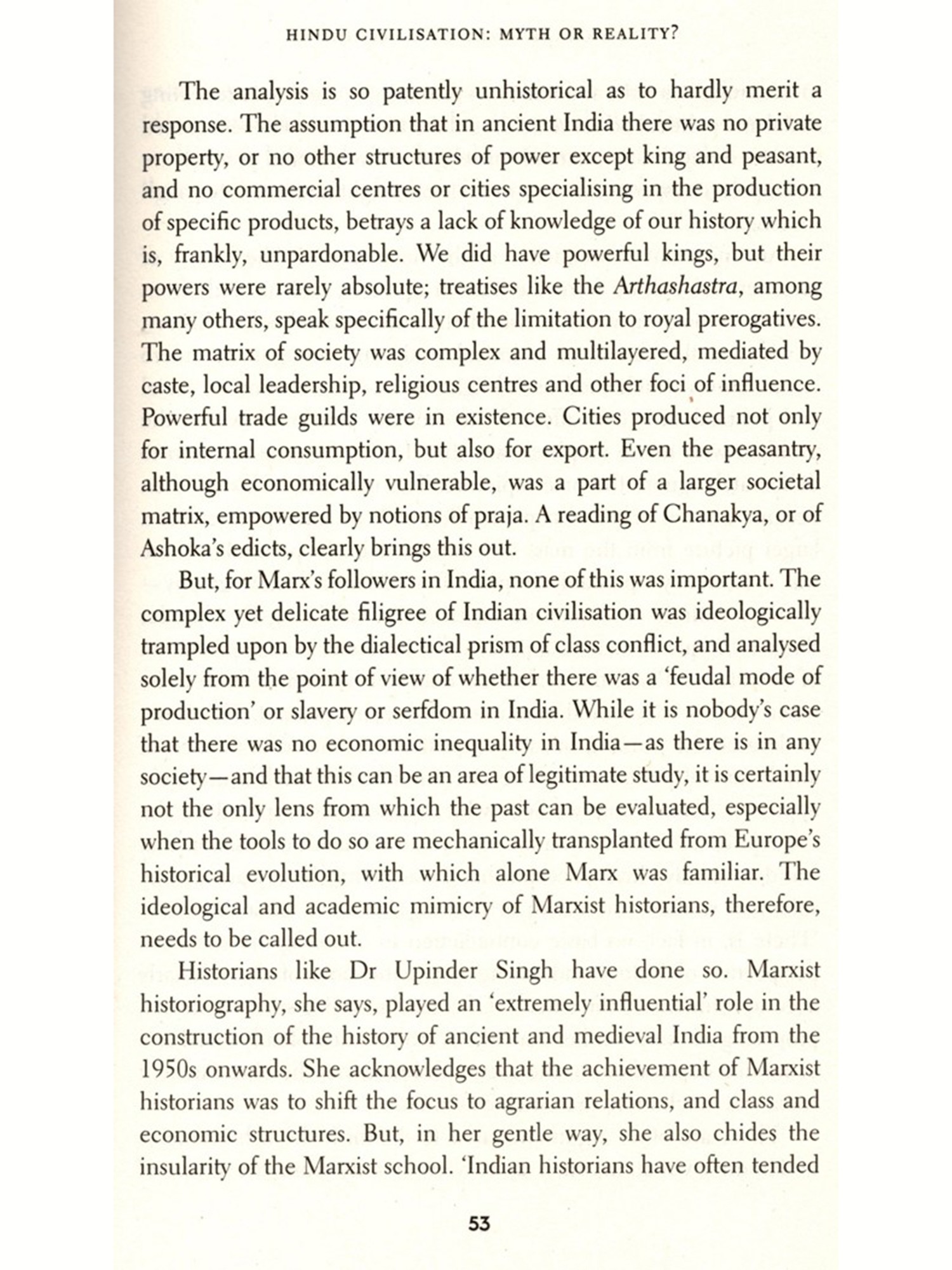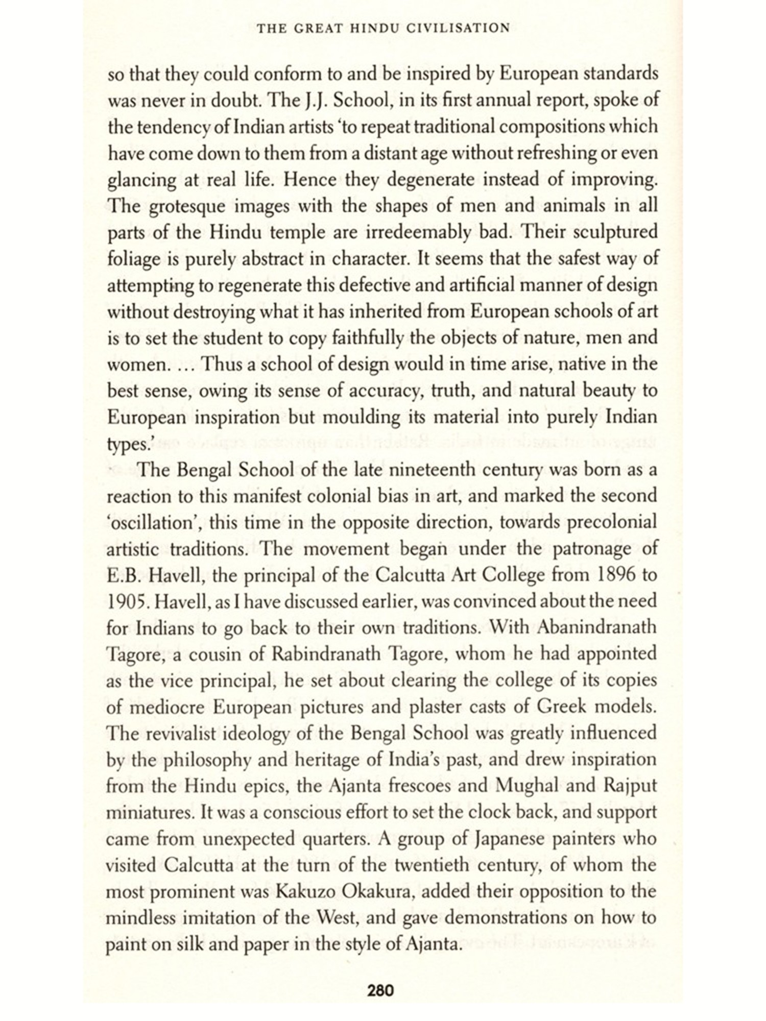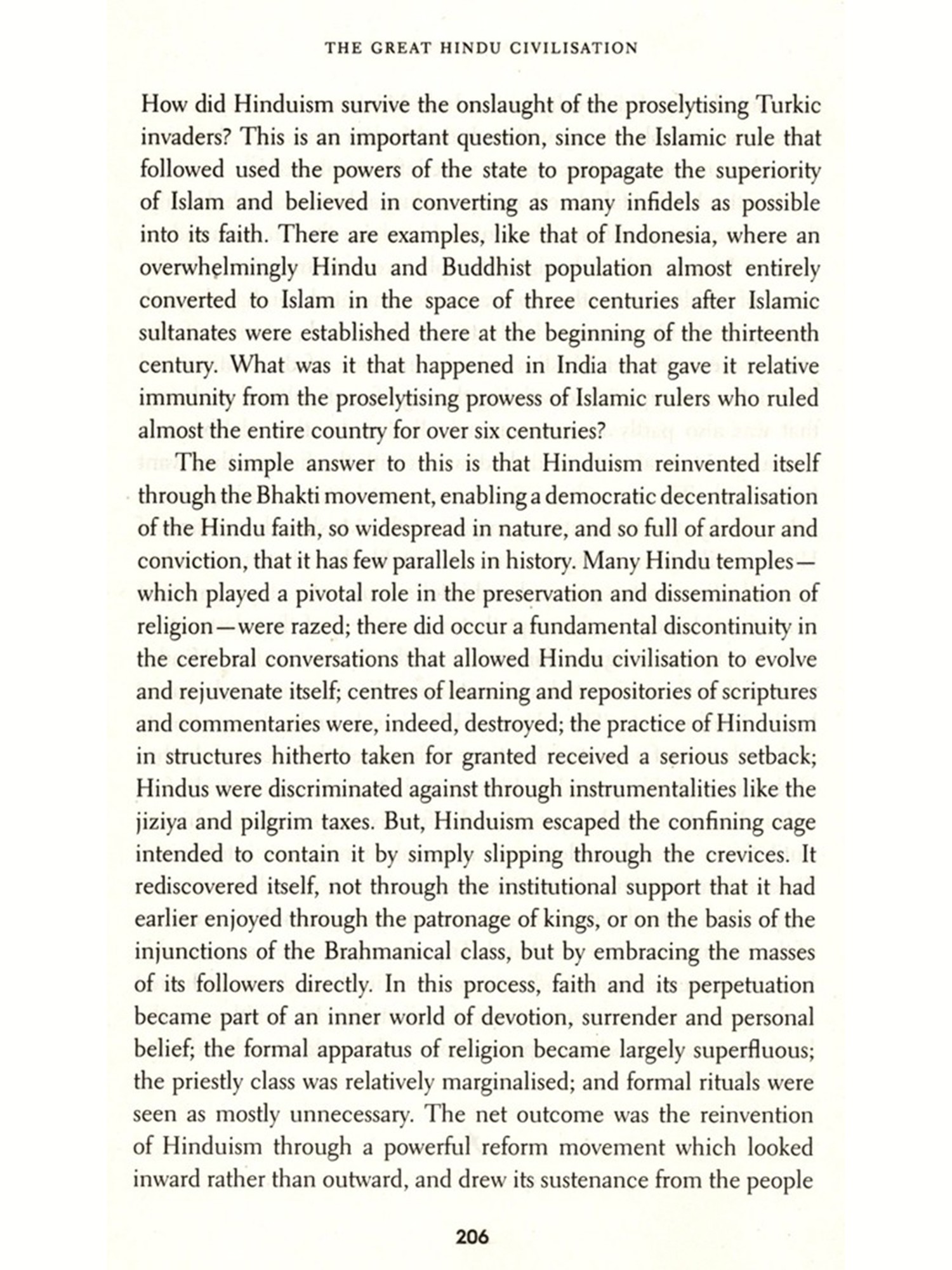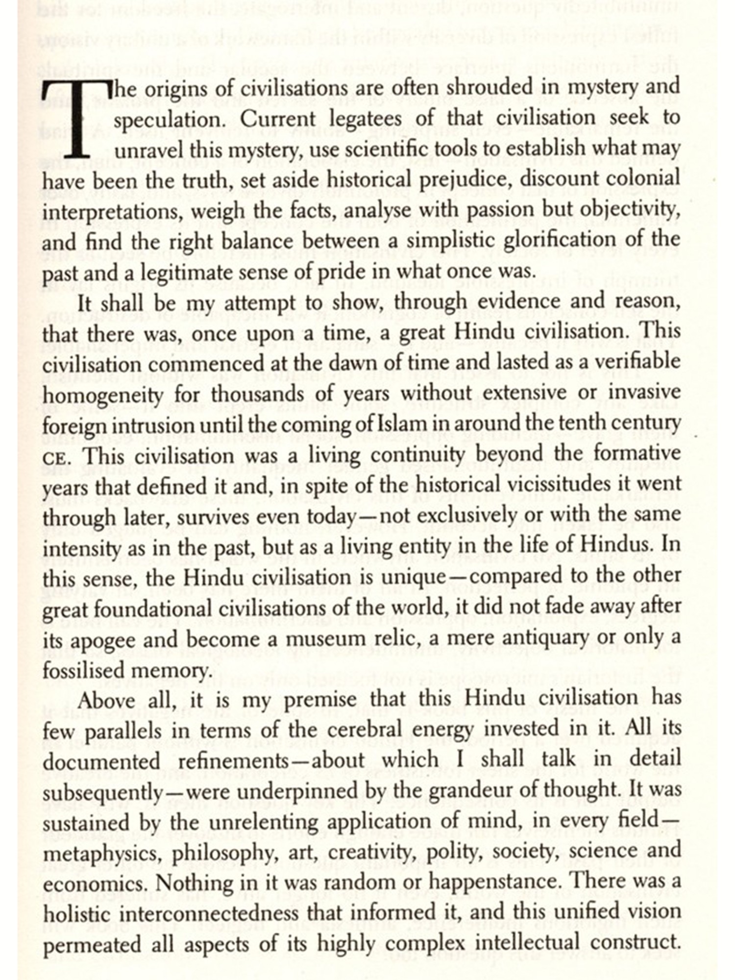 'The fact that a great Hindu civilization existed, and continues to exist, is not in doubt. It is marked by great antiquity, substantial-even unprecedented-refinements, audacity of thought, and achievements both in the spiritual and secular realms. This does not mean it is unblemished, and objectivity demands that the blemishes too must be taken into account. Nor does it mean that it evolved in an insular silo or untouched by outside influences. On the contrary. And yet, this intermingling has not diluted or erased its essential identity as a verifiable civilization. Unlike many other great civilizations of the past, the Hindu civilization has not become a historical relic, an antiquary of the past, but has survived as an unbroken continuum to the present.