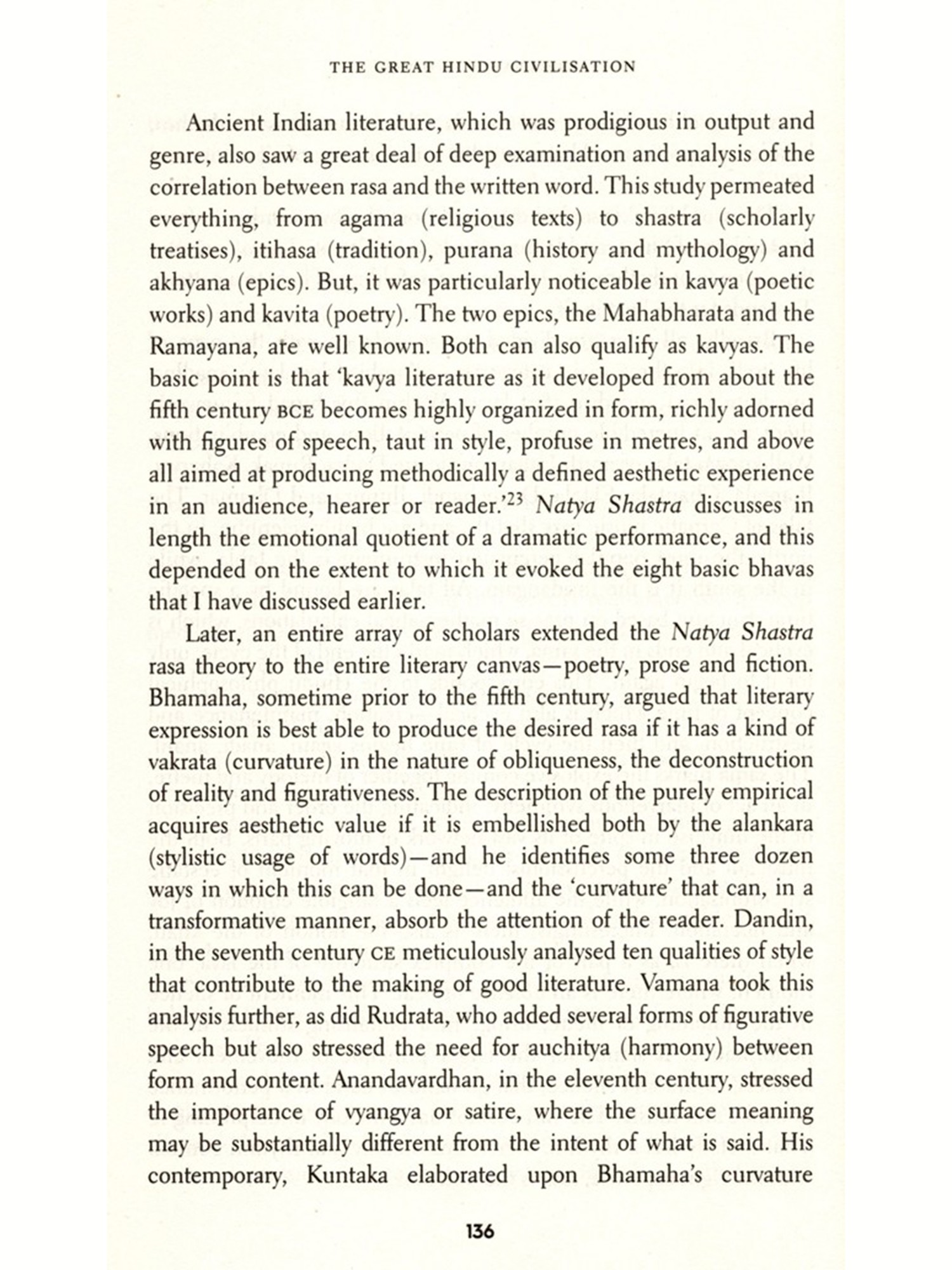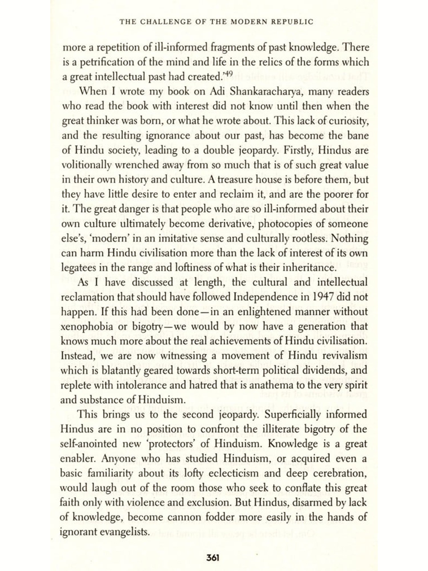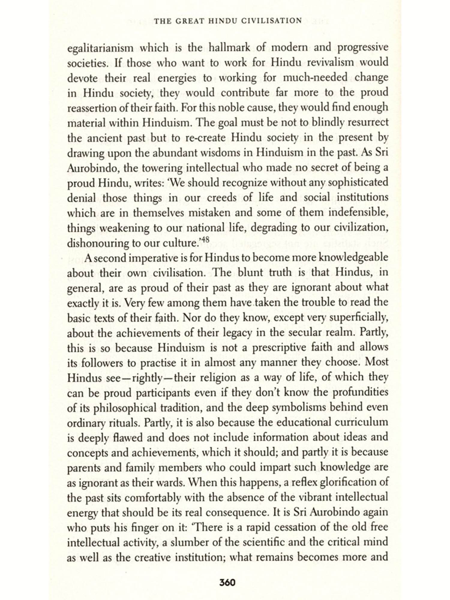 'It is important to know more about this civilization, most of all for Hindus themselves. The civilization faces a rather unfortunate paradox. On the one hand, it is notable for its resilience and continuity, and its spillover into every aspect of a Hindu's life; and, on the other, Hindus themselves show little real curiosity or interest in knowing more about it. This indifference is a matter of concern, not least because, if Hindus do not know about their own civilisational legacy, their authenticity as Hindus-based on knowledge-is stunted and reduced to ritualistic tokenism.'