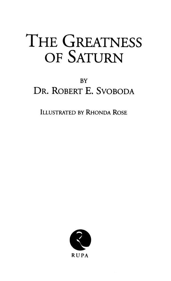 Many thanks to many people, in particular to Miss Roshni Panday for her help with the translations, to Ms. Rhonda Rose for her illustrations and design work, to Dr. Fred Smith for his trenchant comments, and to Mr. Hart de Fouw for his many invaluable contributions. Profound thanks to my mentor, Vimalananda, and to my Jyotish guru, the redoubtable Mantriji. Reverential thanks to Lord Saturn for consenting to make all this possible.