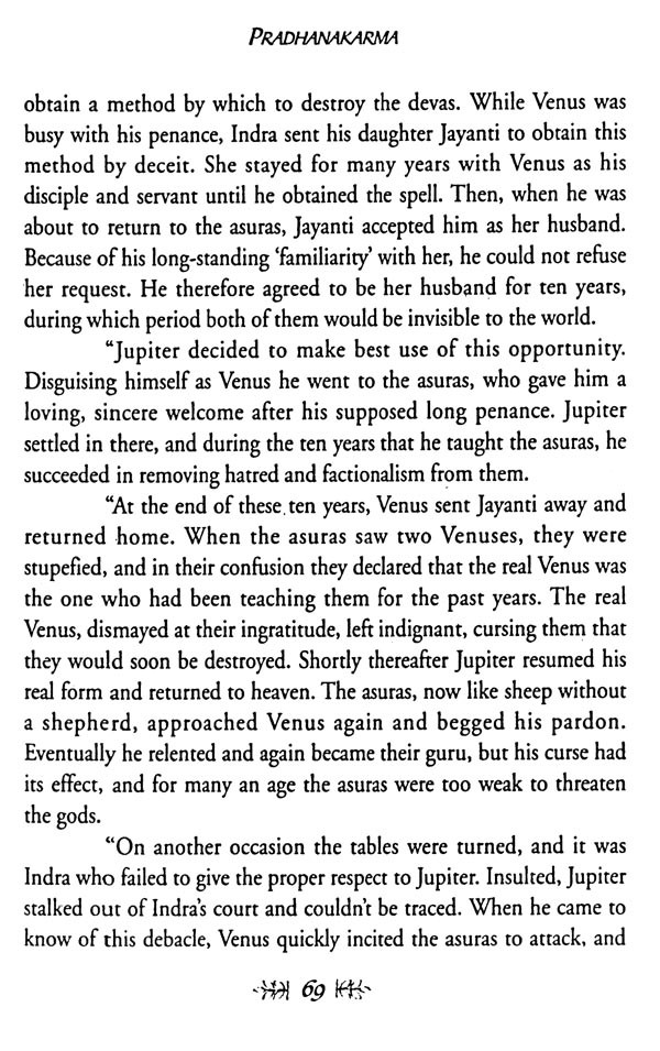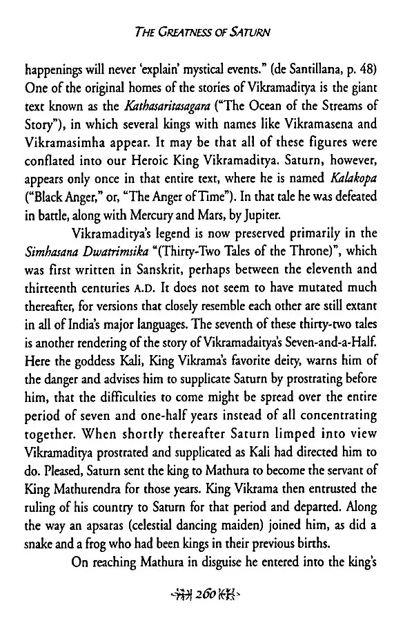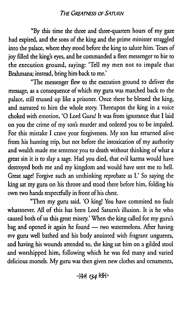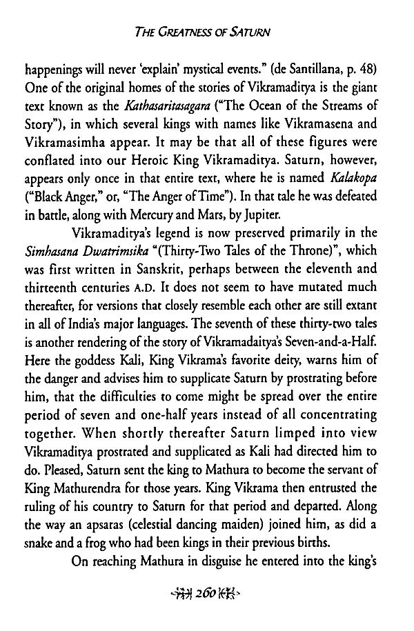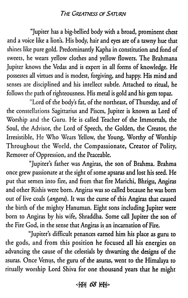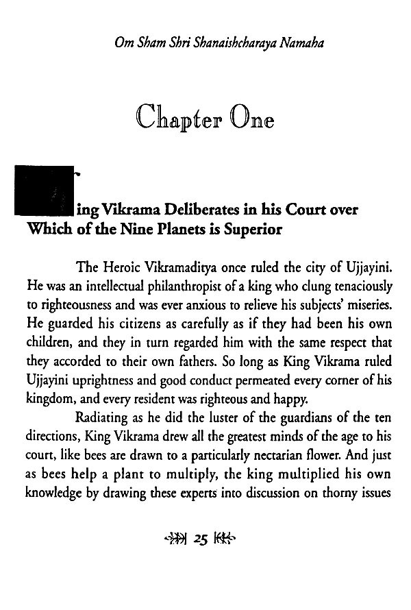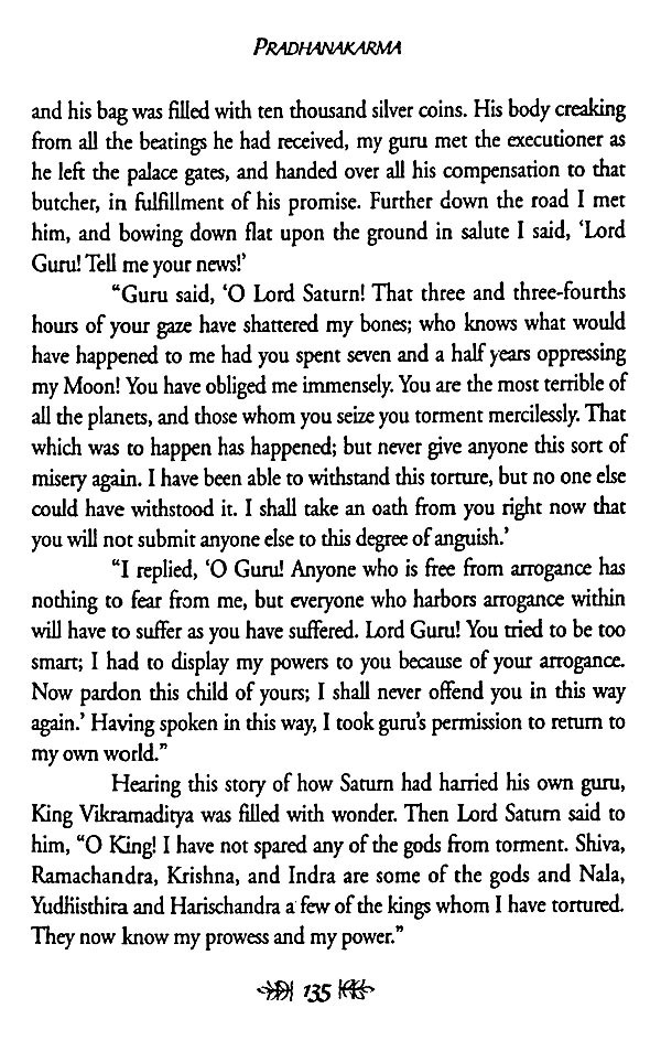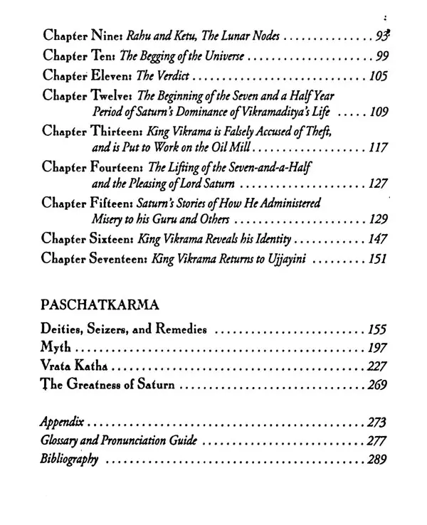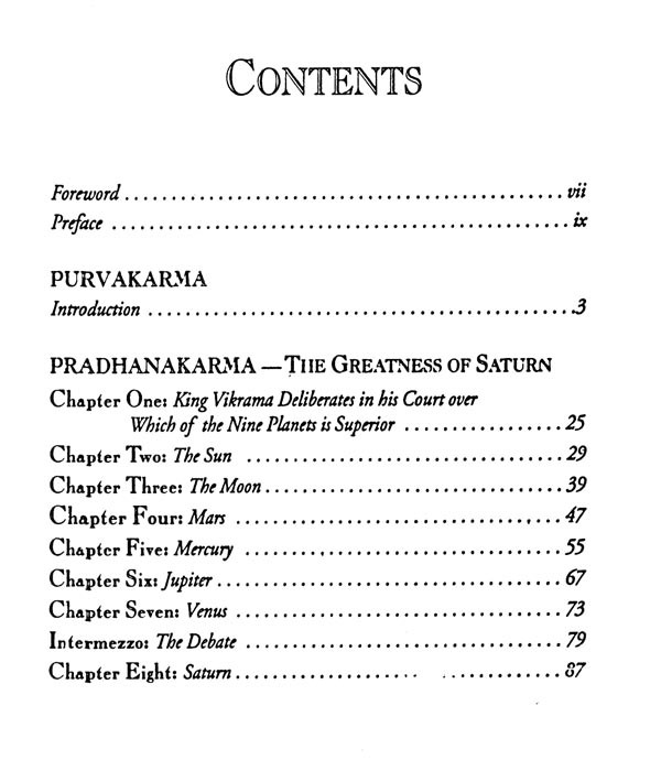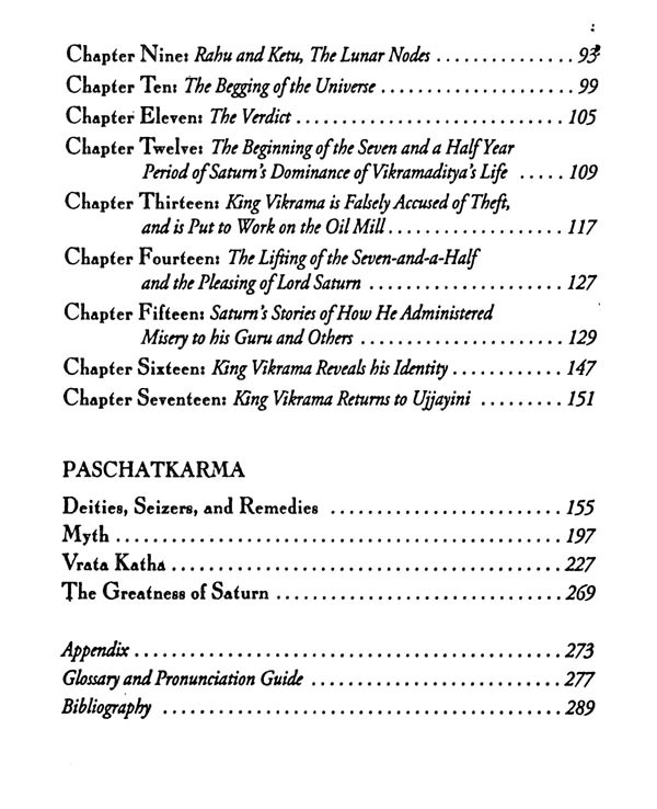 The most significant alteration that I made was to augment and garnish the remarkably perfunctory stories provided in the Gujarati text for the eight planets other than Saturn with stories from other sacred literature, that the text might be a salute fit for all Nine Planets. The enhanced story and its accompanying commentary were blended together with respect and devotion, and the resultant batter was then baked into what I hope will serve as a faithful representation of astrological reality. May the result fill its readers with such a pure and positive bhava ("state of being") that the truth of this subject will appear evident to their hearts as well as to their minds, and may the Nine Planets, and Lord Saturn in particular, be pleased with the result!