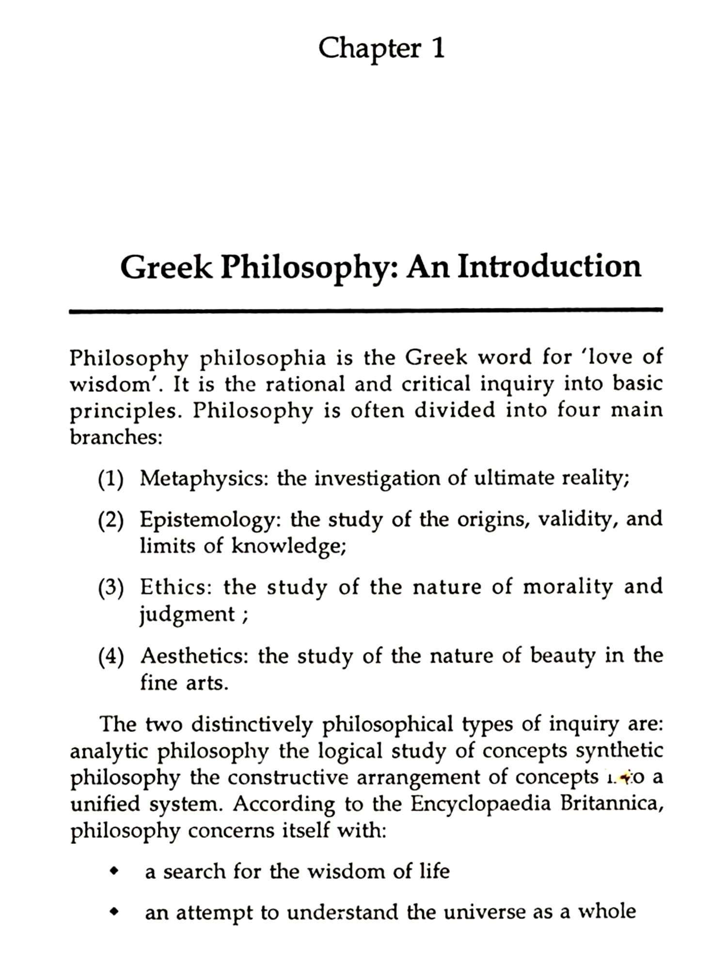 Does an analysis of the etymology of the term "philosophy" help in understanding its meaning of the term for ancient Greeks? When one knows that it means "love of wisdom" does this explain what the ancient Greeks intended by the term "philosophy"? Unfortunately, this is not the case. The fist part of the term philosophy (love) is easy to understand, denoting a "fondness for" or "attraction to." It denotes a value placed on something, so that the one who loves wisdom considers it worthy of pursuit. The problem that arises, however, is defining the term "wisdom," as ancient Greeks would have understood it. The term is not so easily explained. Nevertheless, this much seems clear: since it was something to be loved and valued, it seems that the ancient Greeks believed that wisdom did not come naturally to the human beings. Normally, the things that are commonplace and ubiquitous are taken for granted. Indeed, as will become evident, ancient Greeks assumed that wisdom was inaccessible to all but the determined and intellectually-capable.