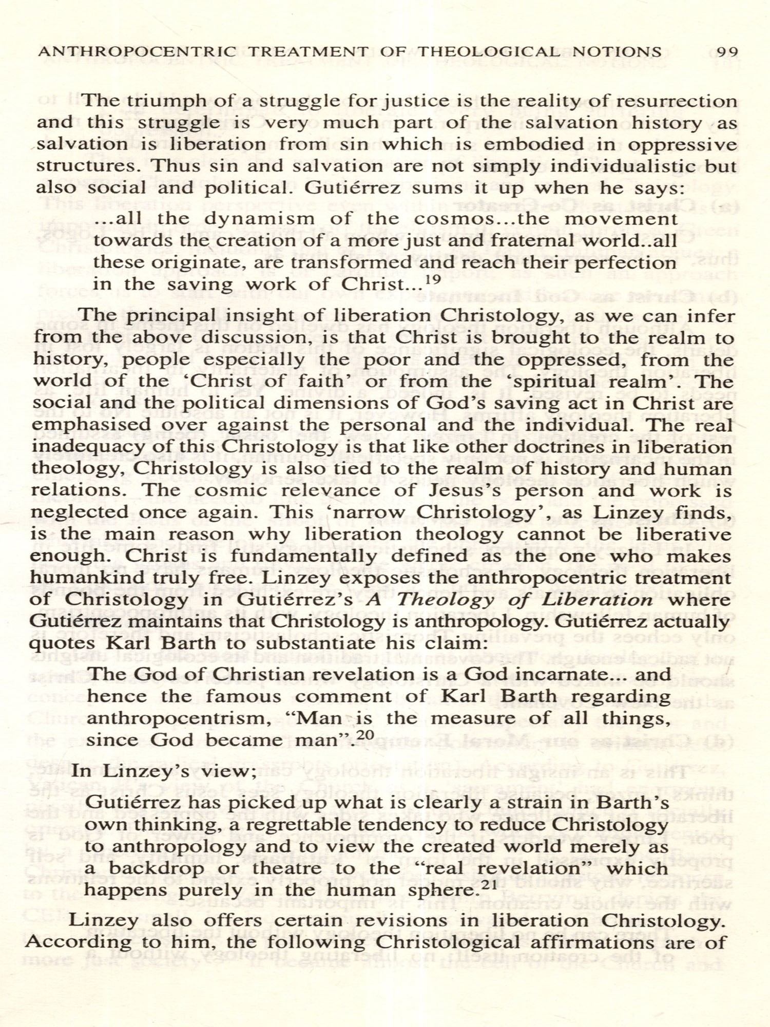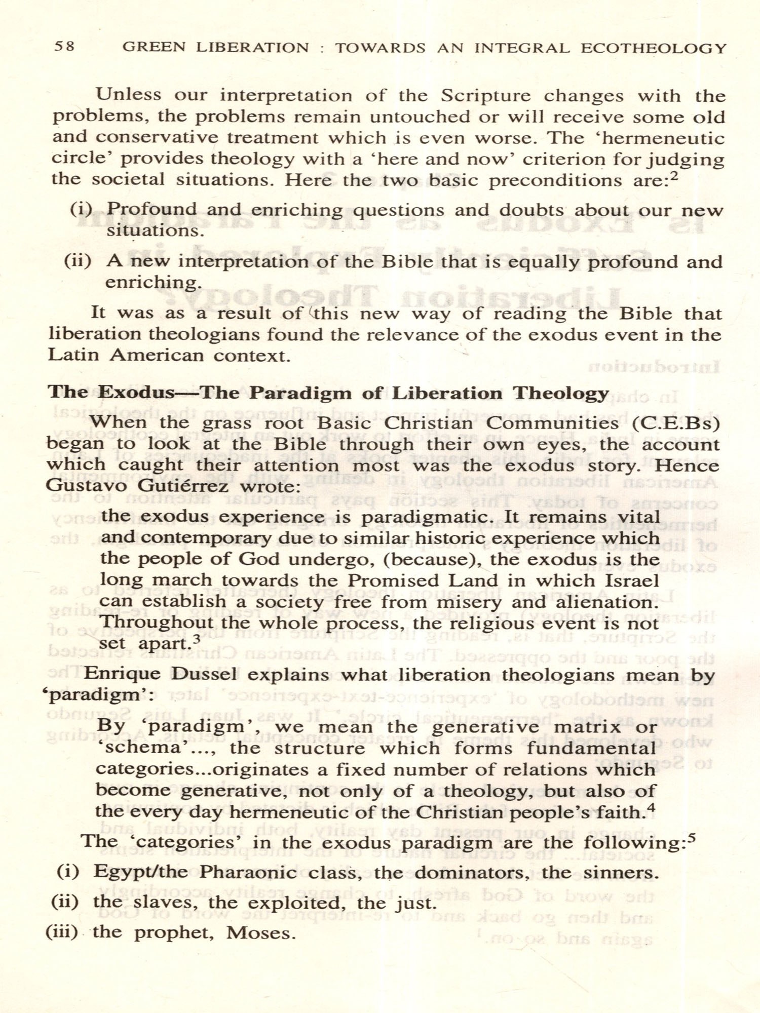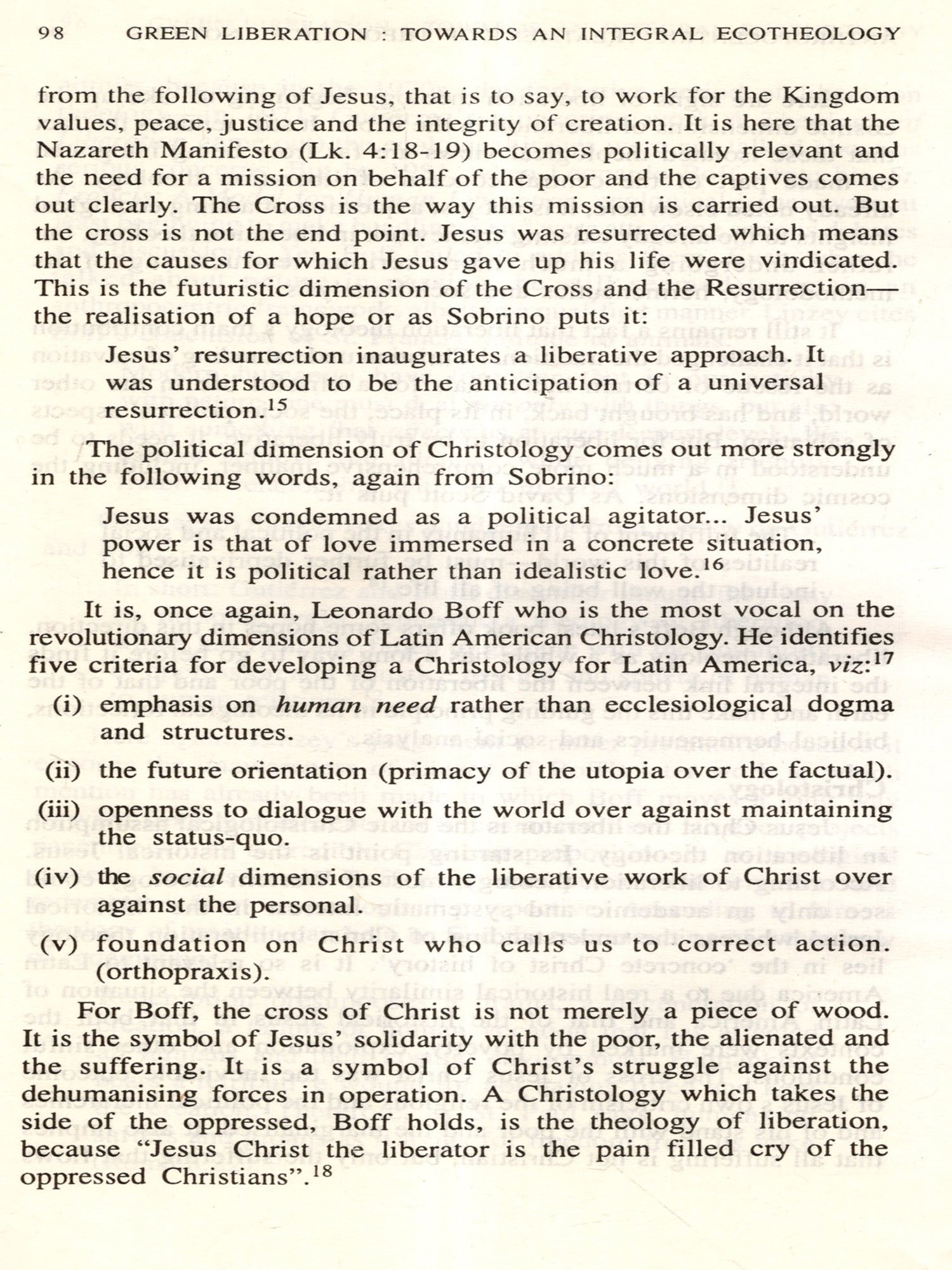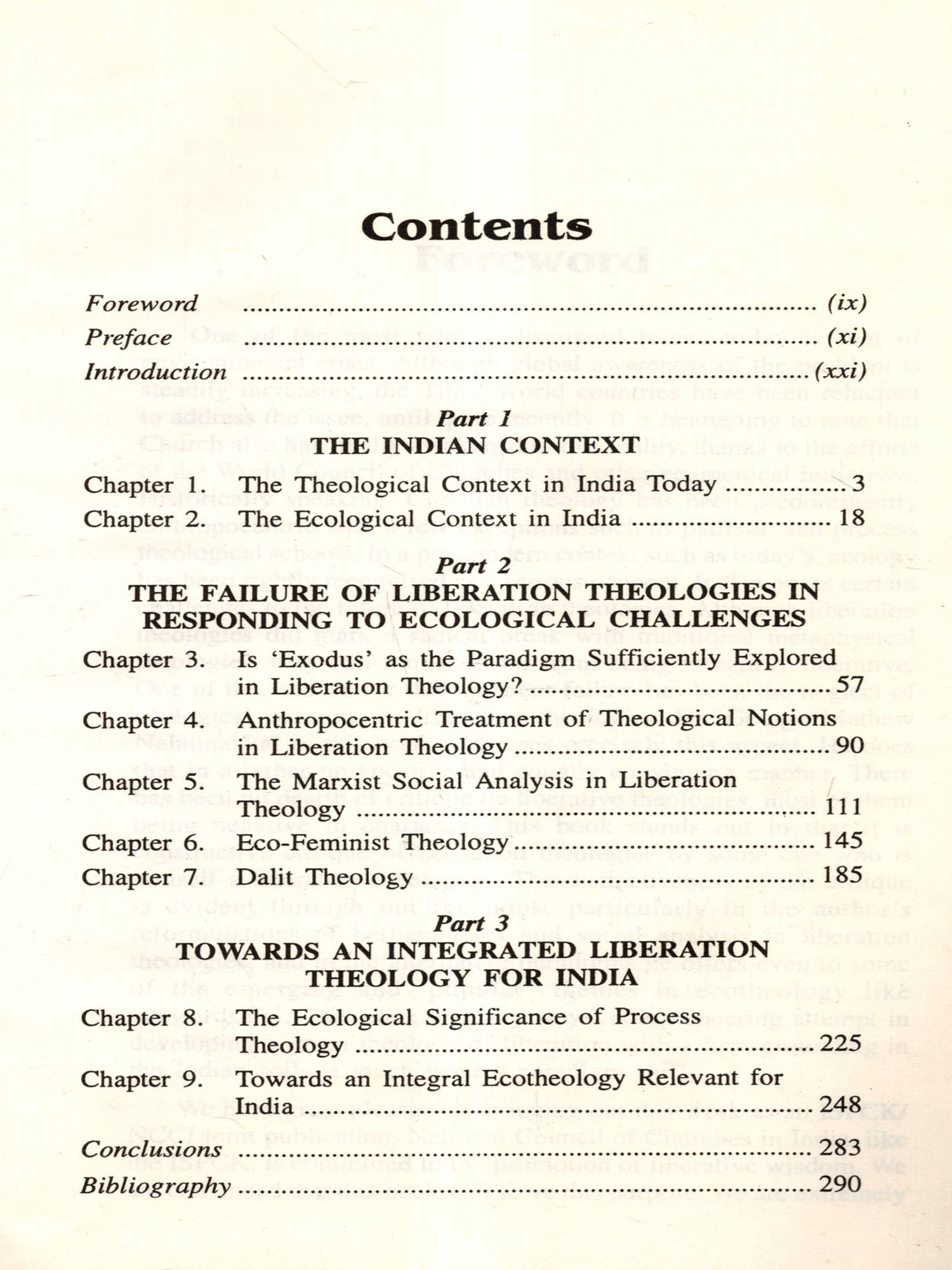 The early years of my theological education had been characterised by a passion for articulating liberation theology, albeit the Latin American version of it. Fr. Sebastian Kappan, himself a renowned liberation theologian, was one of my greatest intellectual influences. Some ten years ago, during an informal chat with him, on 'the future of liberation theology', Fr. Kappan said: "Liberation theology has become stale". Those words did come to be as a real shock. Not because I did not agree with him. On the contrary, contra I could not agree more with him on that point. It shocked me because he was probably the first theologian to admit that liberation theology had certain serious problems to sort out. I was myself beginning to think along those lines and look at some areas within liberation theology in a critical manner. One of the concerns I always had was the total neglect of the cosmic (ecological) dimension and the exclusive anthropocentric thrust in liberation theology. My own involvement, then, in the anti-Nuclear plants in Karnataka convinced me that it was, indeed, a serious overlook in liberation theology, as environmental concerns in the Third World countries have always been, in a real sense, social justice concerns. I drew the attention of Fr. Kappan to this aspect of the absence of ecological concerns in liberation theology. Agreeing with my observation, and once again, to my pleasant surprise, he told me that he was already working on an 'Indian ecotheology' from a liberationist perspective which, in his own words, would "transcend Marxist analysis of society and anthropocentric treatment of theological doctrines". Encouraged by those words, I invited him to share his views on ecotheology at a meeting in the United Theological College, Bangalore. Fr. Kappan brought out the limitations of liberation theology when he dwelt on anthropocentrism and the uncritical use of and overreliance on Marxist class analysis in liberation theology. I followed every bit of his presentation with much excitement because his views struck a harmonious chord with my own thinking. Perhaps, the only thing which I missed in his talk was some discussion on hermeneutics in liberation theology. The biblical interpretation, particularly the exodus hermeneutics in liberation theology, although it was a ground breaking experiment, betrayed shallowness in exegesis. Unfortuna-tely, Fr. Kappan was called back to Mother Earth a few years ago, rather prematurely, leaving the task of developing an integral ecotheology still undone. I thought I could pay my humble tribute to Fr. Kappan by venturing to undertake the task of developing an integral ecotheology, which would in essence be a green version of liberation theology. I was fully aware that I was entering a path which angels would fear to tread. This was the motivation for me to do by Ph.D on "Towards an integral ecotheology relevant for Indía". As the dissertation comes out in a book form, it is my sincere hope that the book will at least be regarded as a step forward as far as the future of liberation theologies is concerned, particularly in the Indian context.