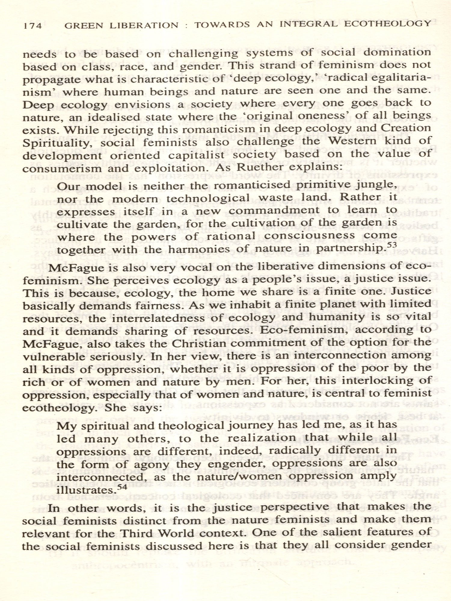 While the WCC continues to keep this focus on 'eco-development', there has been development in the form of an emerging ecotheology or green theology in the West. In the United States, for example, ecological expressions of faith and theological convictions took a post-modern twist and culminated in the foundation of the Creation Spirituality Movement, mostly associated with Matthew Fox (his Original Blessing had a sweeping impact in the West) and others. Although it continues to be a powerful influential movement in the West, Creation Spirituality, nonetheless, represents an eclectic and rather too romantic a vision of the 'New Age' where social justice issues of the South are not taken seriously. Finding Creation Spirituality wanting in social justice, feminist theologians like Sallie McFague and Rosemary Radford Ruether in the States and Anne Primavesi in Britain developed eco-feminist theologies where the interrelation between social justice and ecological concerns are well focused. Sean McDonagh and Ian Bradley have given specific attention to the neo-colonial dimensions of ecological problems in the Third World in their writings. On the Continent, Jürgen Moltmann's God in Creation: An Ecological Doctrine of Creation has also been an influential work in this regard.
