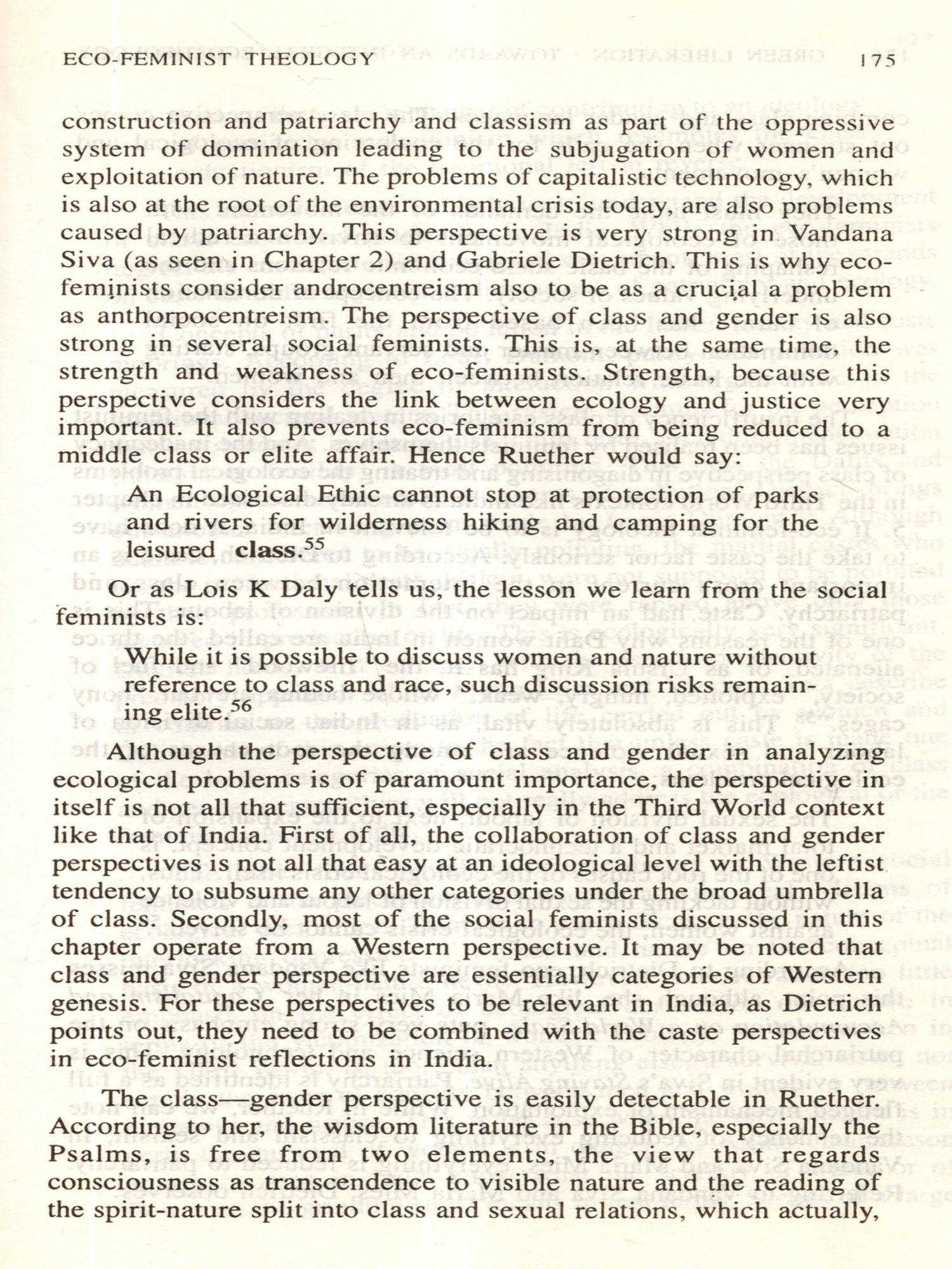 Ecotheology is of relatively recent origin. Traditional Christian theologies have often been pre-occupied with questions about God from a purely metaphysical perspective. The emergence of process theology in the 1950s was a breakthrough in that. It contained liberative, ecologically sensitive insights. Due to its largely philosophical orientation, process theology could not exert much influence in the Third World context. Christian theology continued to be predominantly anthropocentric, even in its modern progressive forms of liberation theologies. Although liberation theologies succeeded in shifting the focus of theology from a metaphysical God to the concerns of the oppressed, the rest of the creation, nature, was by and large, neglected. The problems which the earth faces today and its impact on the poor, women, and indigenous people who are more vulnerable to ecological crises than any other sections of a society, have seldom been addressed in a concrete manner in theological thinking, until quite recently.