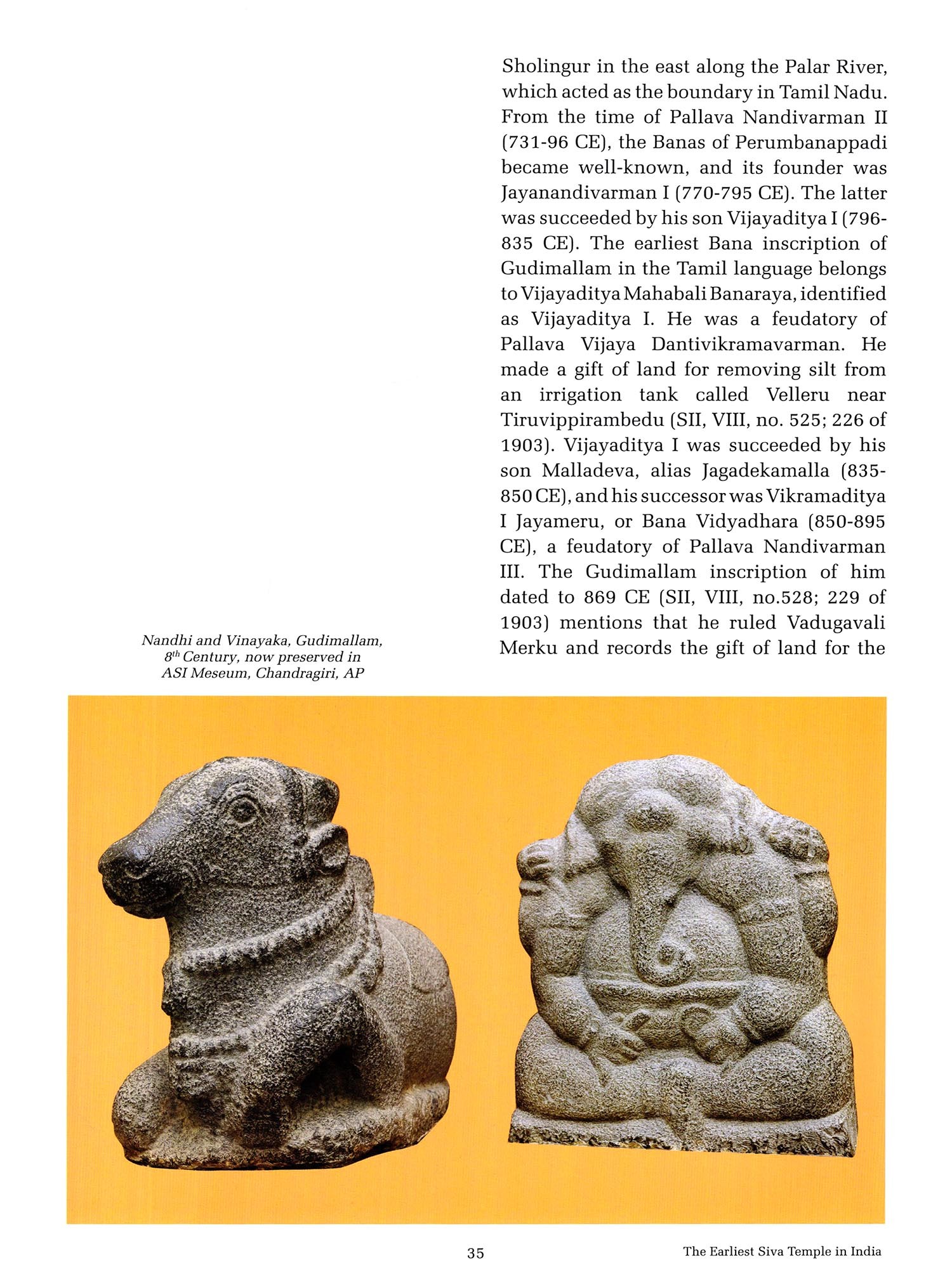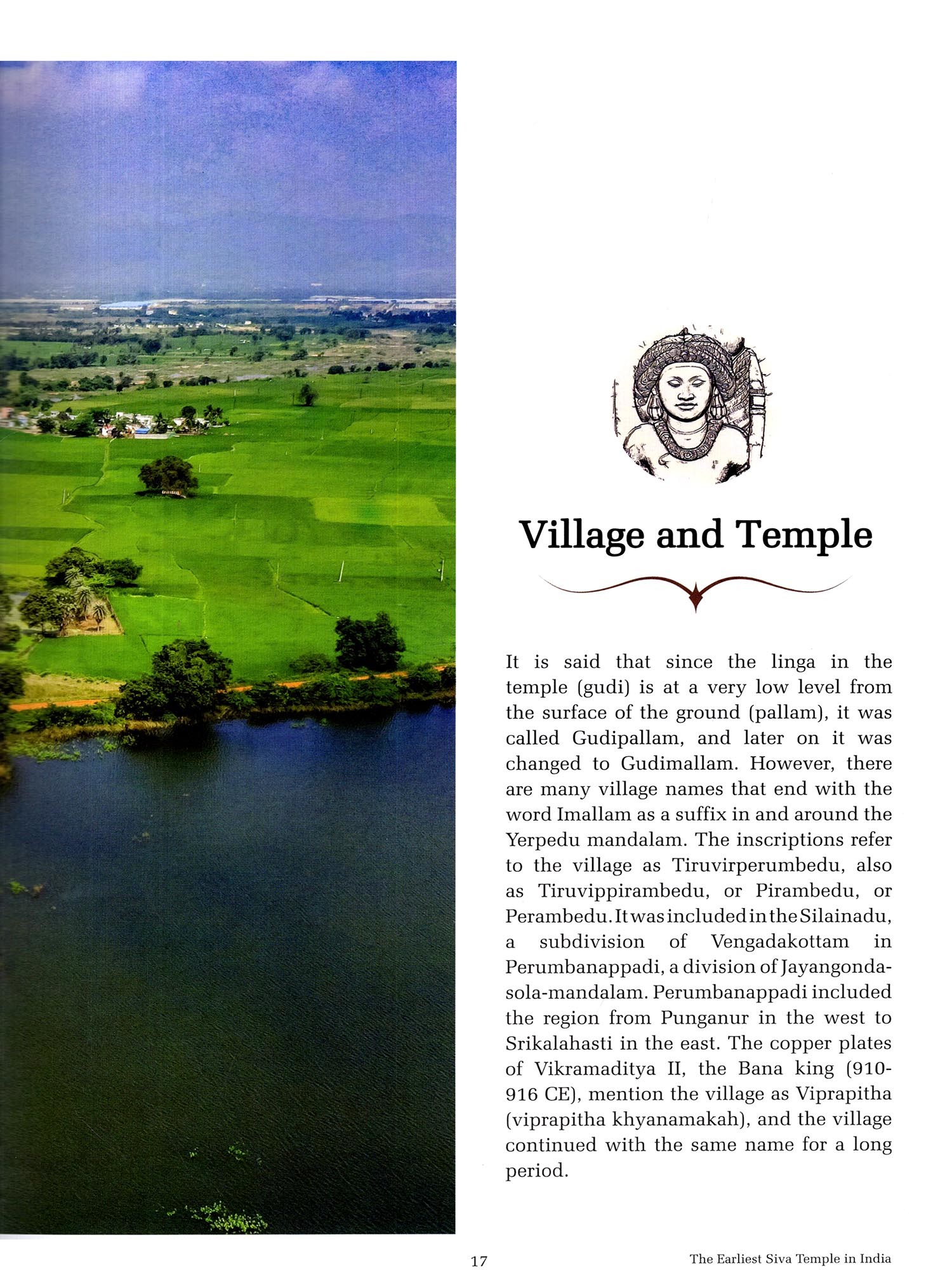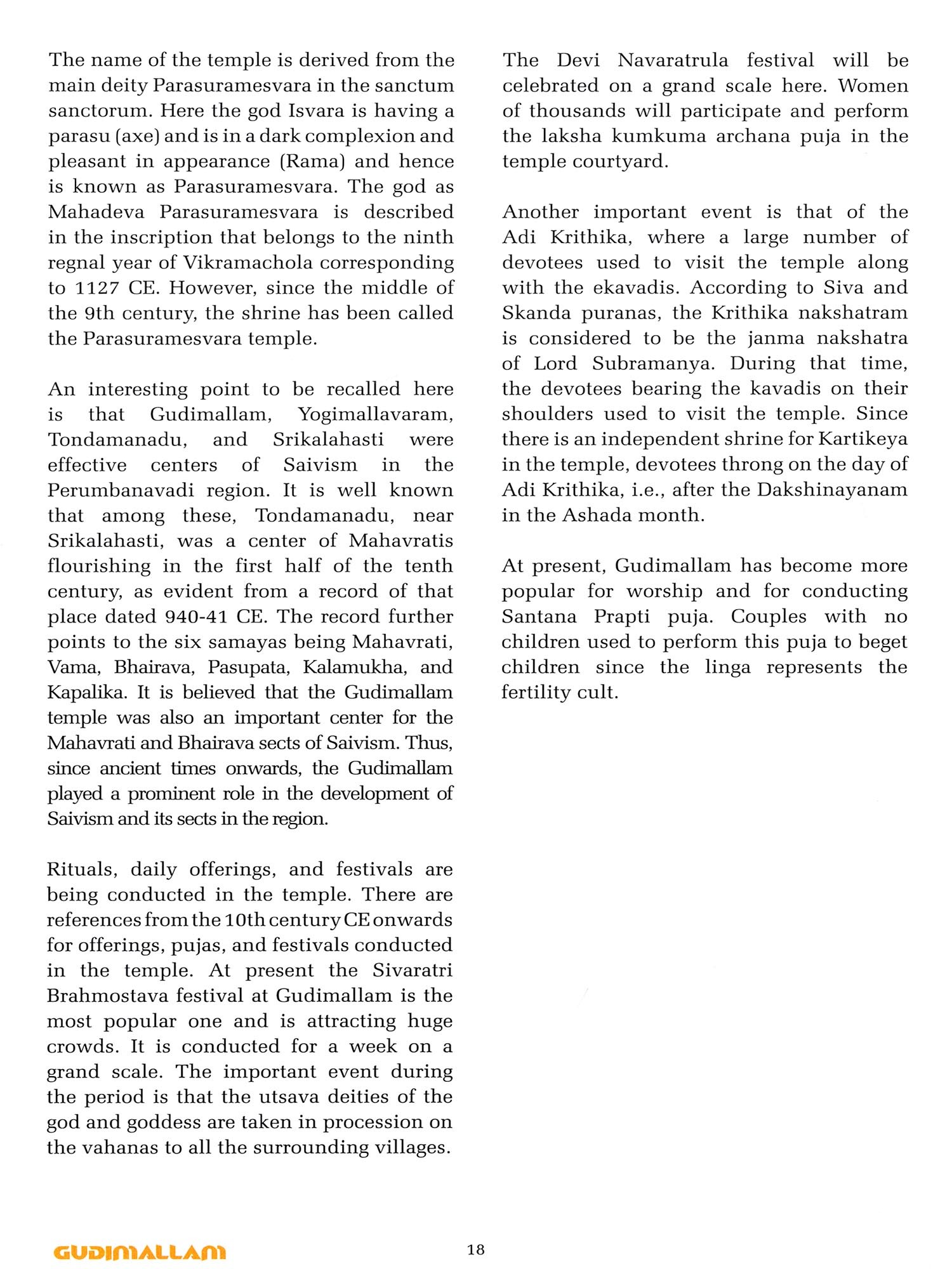 Since ancient times, the linga has been in continuous worship. It received royal patronage from the times of the later Pallava and Bana rulers (845 CE), Chola and Yadavaraya, and up to the time of the local chief, Raja Dameravenkatappa Nayanimgaru (1801 CE). The rivulet. Sitakalava, flows along the south and west sides of the village and joins the River Svarnamukhi. To the southeast of the village, at a distance of 4 km, there is a hill range called Sadasivakona, part of the Nagari hill ranges, which contain trapezoid rock with quartzitic veins. It is famous for its twin waterfalls, Ayyavarikona and Ammavarikona. Near the waterfalls are the temples for Sadasiva and Kamatchi. The village Gudimallam is surrounded by lush green fields with paddy, groundnuts, mango gardens, varieties of trees, etc.