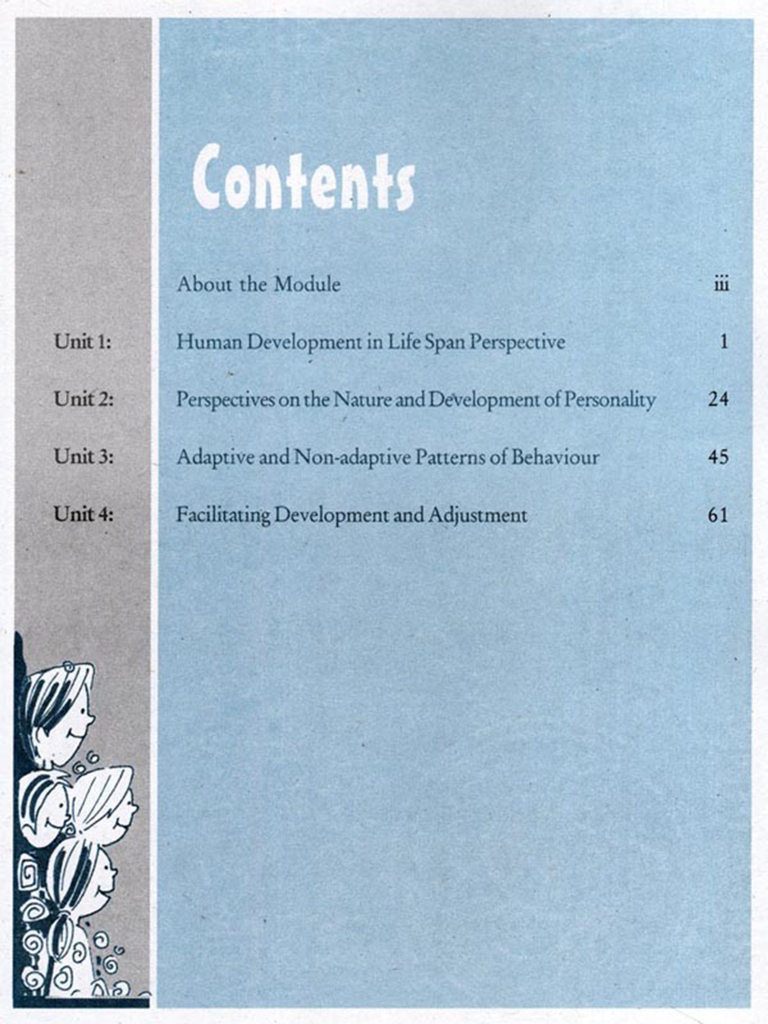 The first unit provides a background on the characteristics of different stages of development and the individual differences, and their effect on adjustment of students. The second unit deals with various approaches to understand personality and facilitating development. The third unit focuses on identification of the various patterns of behaviour that characterise well-adjusted and maladjusted students. The fourth unit examines the influence of various factors such as hereditary and environmental factors on development and adjustment. This module aims at helping you understand the characteristic patterns of development, different stages of life and the influences which lead to different personality formations. Insight into the background of pupils and its implications for quality of life, mental health and well-being will enable you to deal with students more effectively.