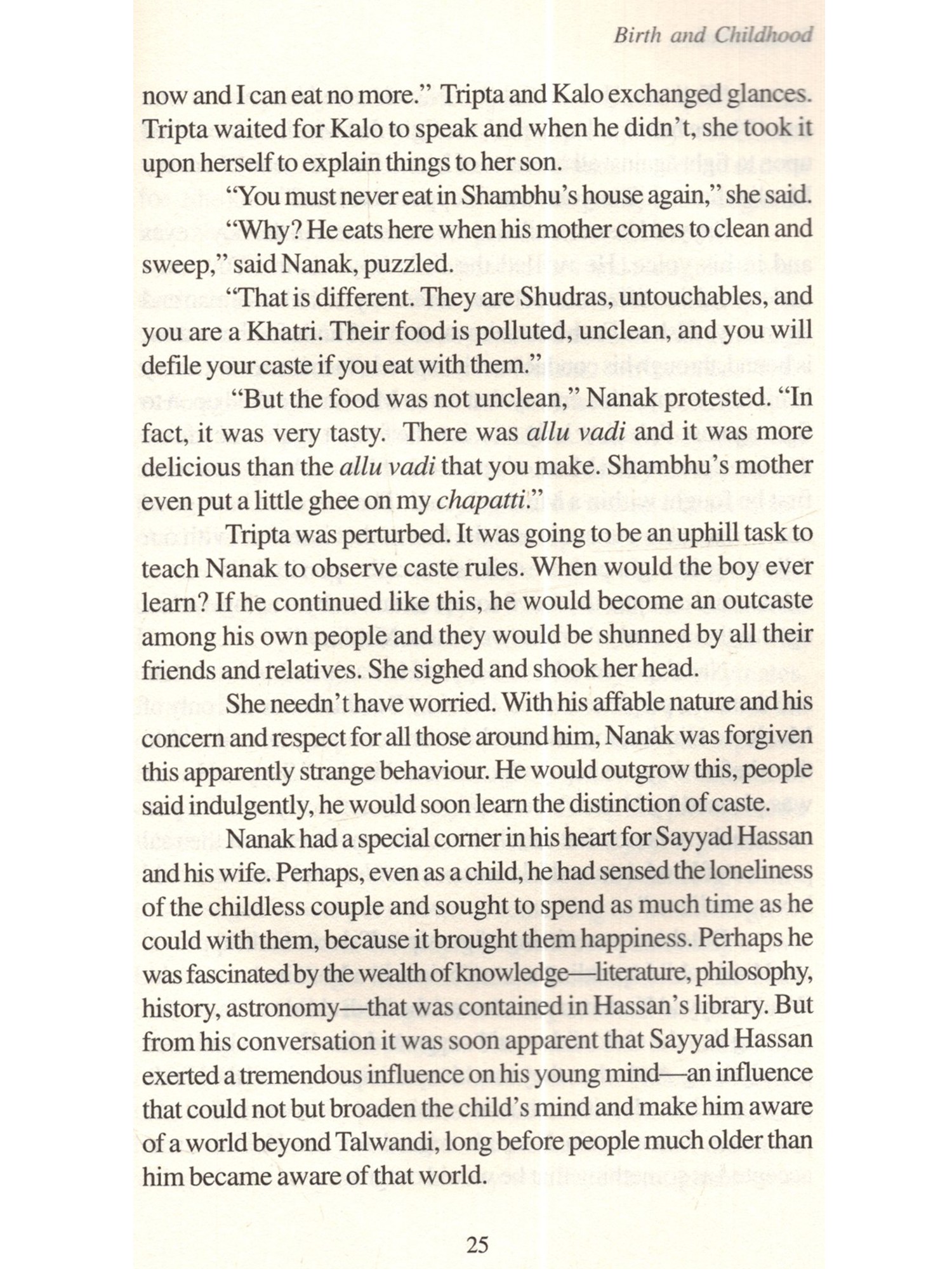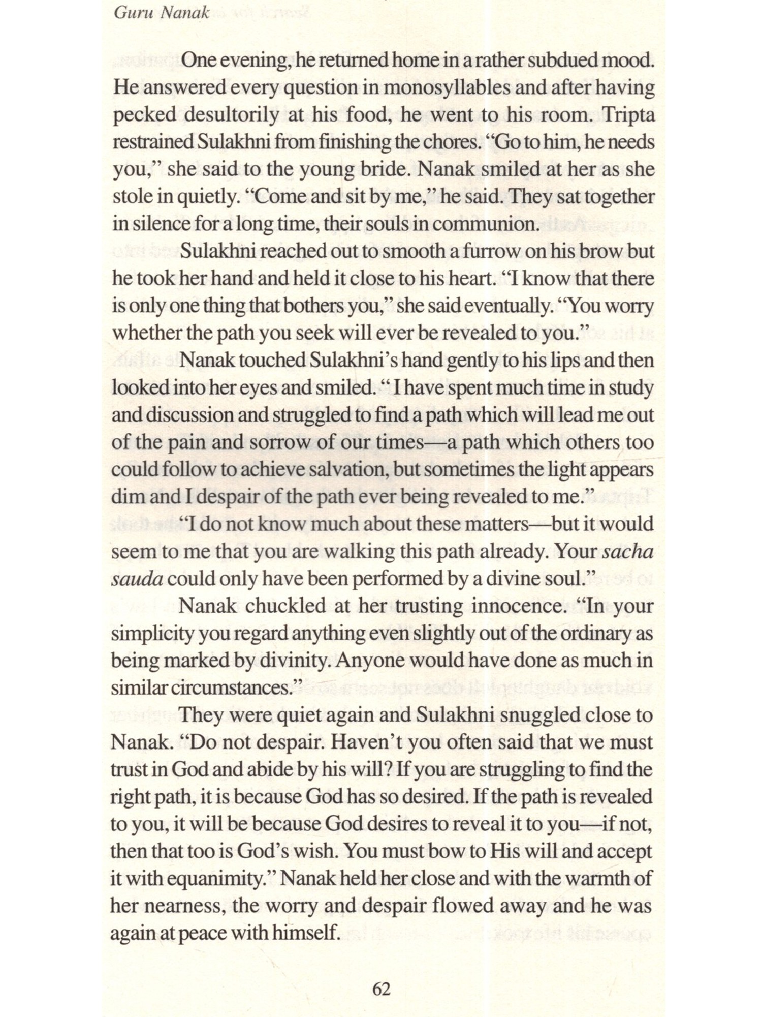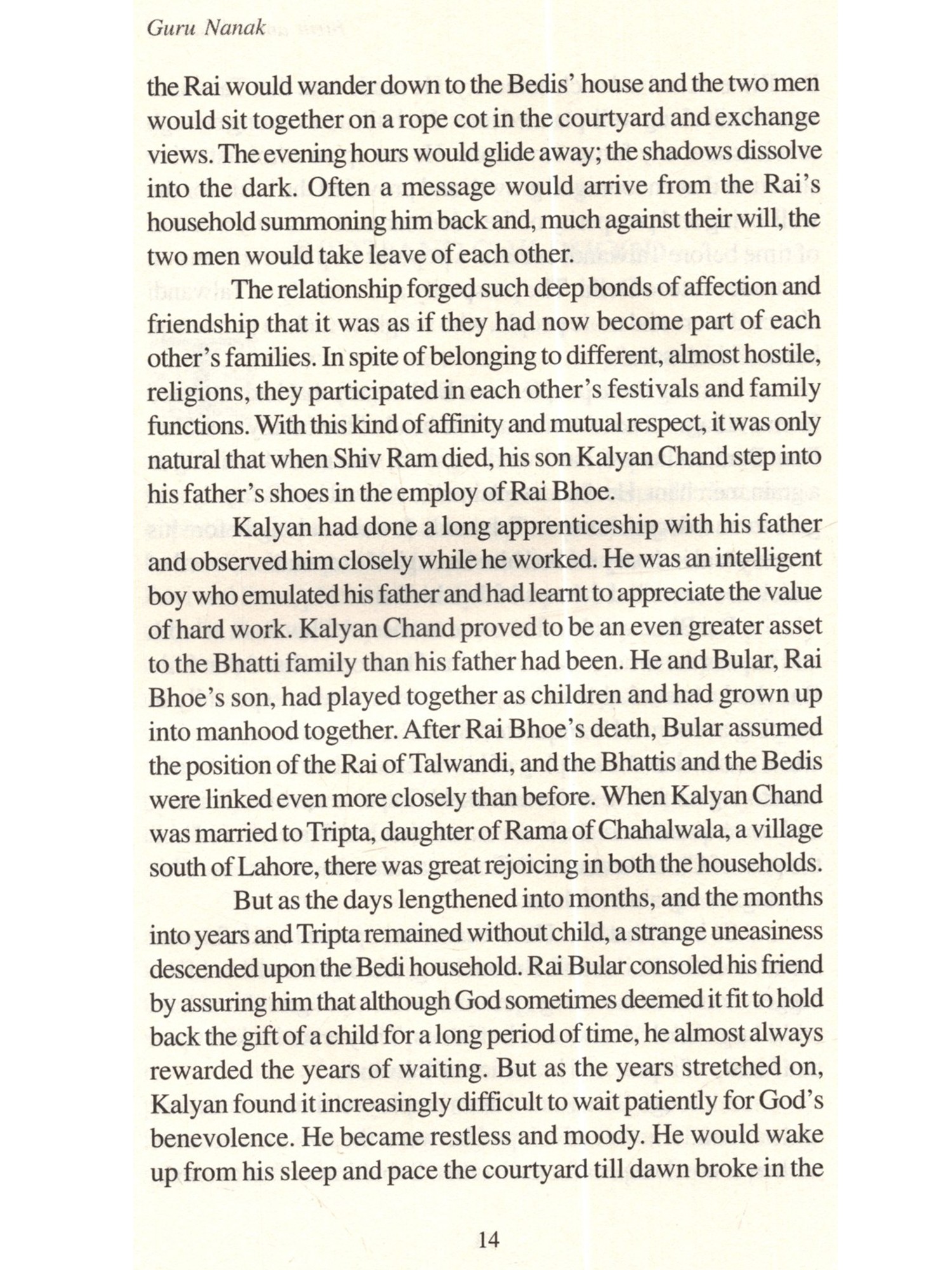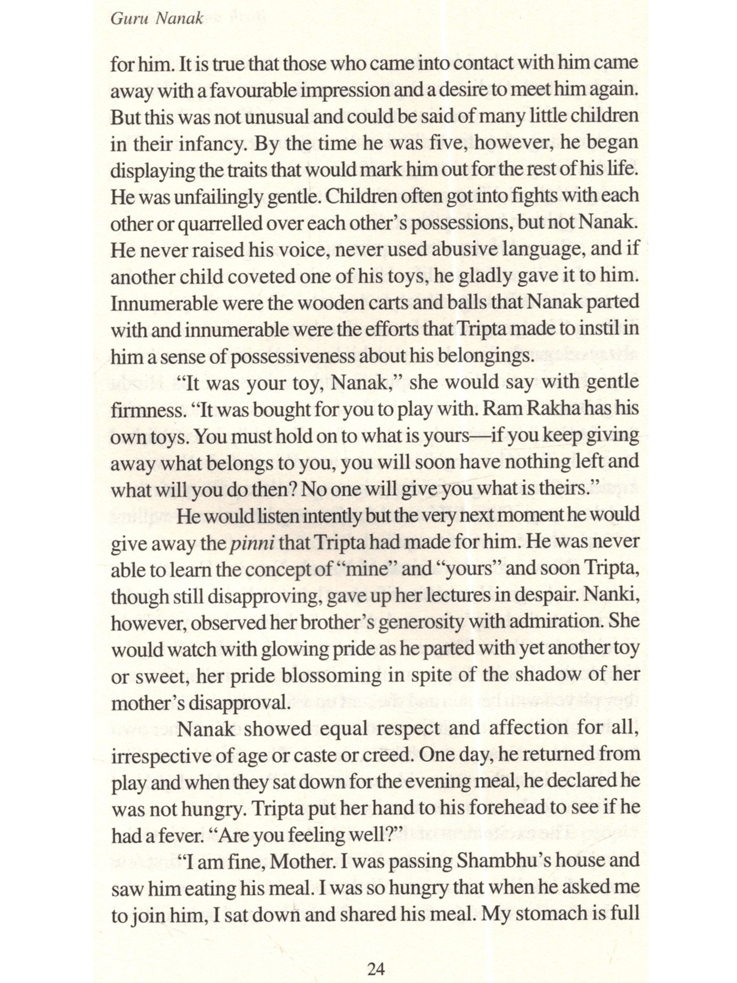 The life of Nanak, the founder of Sikhism, which is the youngest religion of the world, has always fascinated would-be biographers. This fascination arises from the desire to probe the mystery of a remarkable life a man who revelled in his ordinariness, who denied that he was in any way a saint, a saviour, or a redeemer, and who never claimed any divine inspiration. Yet, through his teachings, his personal example, and his influence on mankind, he attained great divinity. Nanak was admired, loved and respected even in his lifetime. His name was inscribed as "Hazrat Rab-i-Majib, Baba Nanak Faqir Aulia" (Anand Acharya, Snow Birds, [London 1919], p.182), on a memorial in Baghdad. In the Punjab, his Hindu disciples called him Satguru Nanak Dev while his Muslim followers referred to him as Hazrat Nanak Shah. To the yogis he was Nanak Nath, while to the Buddhists he was Nanak Lama, Bhai Gurdas said of him: "God the Bountiful heard the wail of suffering humanity and sent Guru Nanak to the world" (Var 1.23). Mehrban writes: "He does not look like a man of the world to our good luck, we are meeting in him God Himself" (Sodhi Mehrban, Janamsakhi: Shri Guru Nanak Dev, 1620, [Amritsar 1962], p.296). The chronicles also tell us that whosoever met Nanak said "never in their lives had they met a man so near God" (Sham Singh, The Seekers' Path, p.xiv). Perhaps the most comprehensive summing up of Nanak's personality, his role in the social and religious reform of his period, Nanak There have been numerous efforts to correct the balance, all resulting in biographies of Nanak. Historians like Karam Singh looked for hitherto undiscovered documents containing references to Nanak. They visited old families and antique dealers, examining private collections and looking for new source material on Nanak's life. They sifted through traditional and legendary accounts and looked for corroboratory evidence in Bhai Gurdas' account and in Nanak's bani. From this, they built up a fairly comprehensive account of Nanak's life which served as a basis for the numerous biographies that have been attempted since, both as individual works and as part of more comprehensive histories of the Sikh religion and people. "Nevertheless, when we put together all the material, check one with the other, discard the miraculous, delete the accretion of the credulous, we are still left with enough to recreate a life story with a fair degree of authenticity" (Singh, Khushwant, A History of the Sikhs, vol. I p.303). Roopinder Singh, at the beginning of his remarkable book Guru Nanak: His Life and Teachings, asks: "Why another book on Nanak?" My only justification for retelling a story that has already been told so often is the firm belief that a story as beautiful and inspiring as Nanak's needs to be retold as often as possible. I have tried to write in simple language and in an easy, readable style, culling from the work of other writers before me. If a fraction of the great charm of this story can communicate itself to the reader, the effort will have been worthwhile.