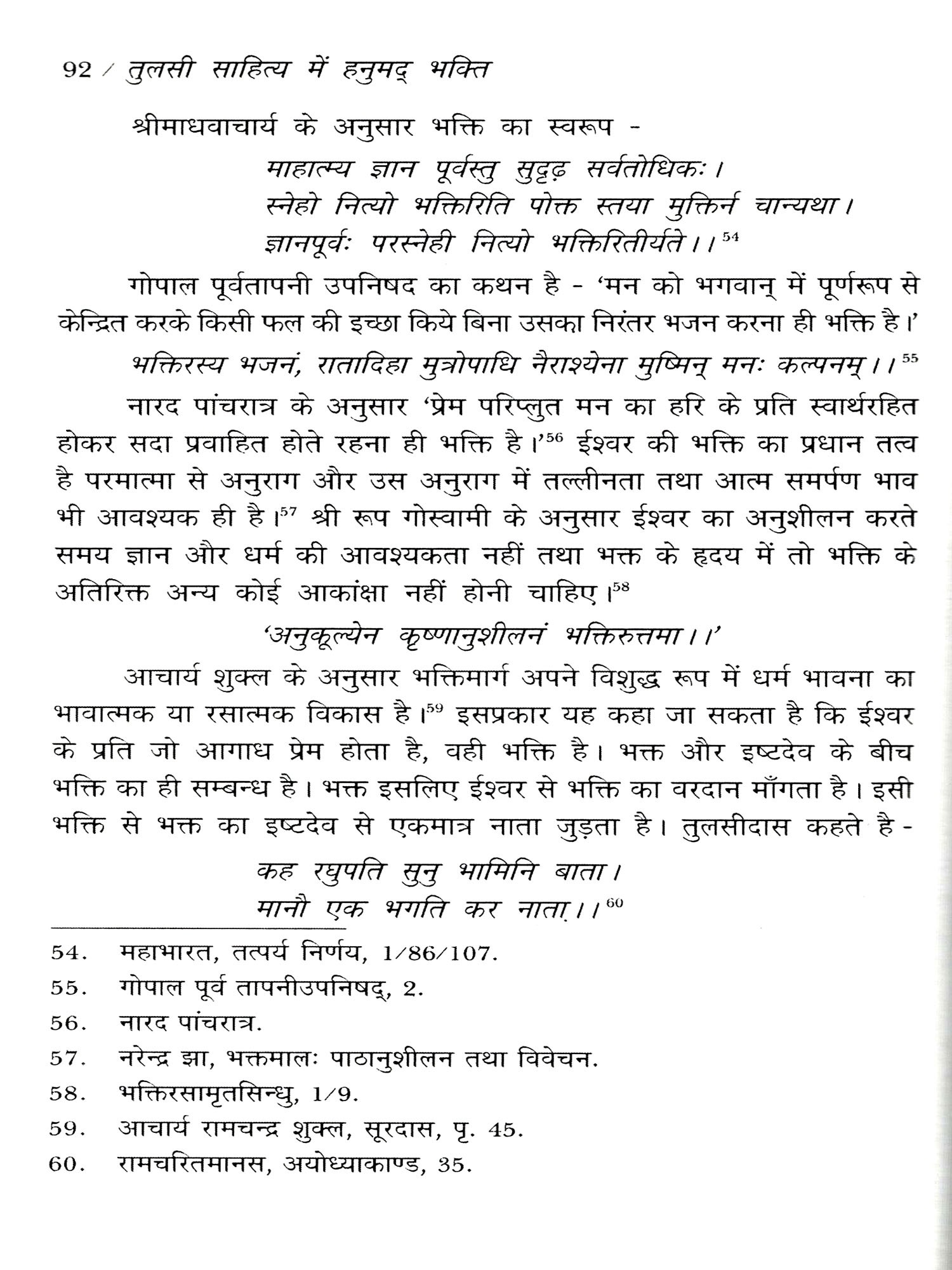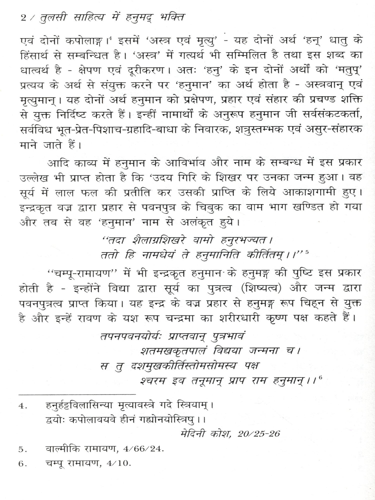 गोस्वामी जी के काव्यों विशेषकर रामचरितमानस, कवितावली, गीतावली और हनुमानबाहुक में हनुमान के चरित्र के साथ जुड़ी परम्परागत विशेषताओं में दास्यपरक भक्ति का मेल होने से रामसहायक हनुमान, रामसेवक तथा रामदास बन गये। केवल इसी तत्व के सन्निवेश से हनुमान का बहुगुण समन्वित व्यक्तित्व तथा चरित्र नूतन गरिमा से अभिमंडित हो उठा है। यहाँ भक्त के रूप में हनुमान के व्यक्तित्व एवं चरित्र में पूर्वपिक्षा अधिक निखार आ गया है। तुलसी जी के इष्ट हनुमान रामभक्ति के परमादर्श, लोकमंगल, वैष्णवी निष्ठा, सेवकबुद्धि, आत्मविस्मृति, त्याग, बलिदान, समर्पण, प्रहंशून्यता जैसी उदात्त वृत्तियों और भावनाओं से अलंकृत हो उठे हैं। इस भूधरा पर हनुमान के तुलसी समर्थित एवं निर्मित भक्त-चरित्र का अध्ययन अपने आप में अध्ययन-अध्यापन का एक मौलिक पक्ष है। इस तथ्य को ध्यान में रखकर 'तुलसी साहित्य में हनुमद्-भक्ति' विषय पर लेखन का यह विनम्र प्रयास है।