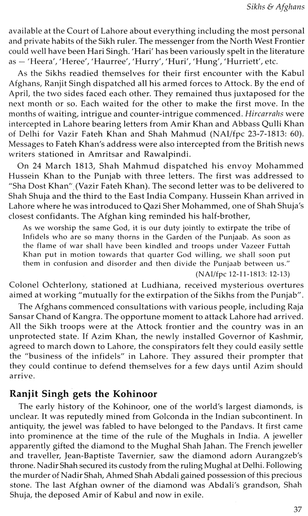 I commenced my search for information on the ancestor who had spent a lifetime subduing the Afghans in the first half of the nineteenth century. I found Hari Singh's contribution in consolidating the Kingdom of the Sikhs chronicled in Persian, Urdu, Gurumukhi, English and even Marathi. The information, however, was fragmentary and scattered. History needed to be a faithful record of facts relating to events as they happened. My training as a scientist led me to those sources of information that best met this criterion. My Endeavour was to rely on information recorded nearest to the time of occurrence of the relevant events. I have presented the information such that its source may be available to the reader.