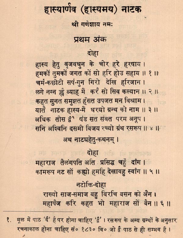 प्रारंभ में जब हास्यार्णव पढ़ा तब कुछ ऐसी ही बात चित्त में आई। सोचा कि आखिरकार उसके पात्रों की भी तो जिंदगी है और उसमें भी रस है। संस्कृतवालों ने जैसे सबका रस लिया वैसे ही इन लोगों का भी; और वह रस केवल अपने ही नहीं पान किया, सबको कराया। उन्होंने उसे हास्य का समुद्र कहा, किंतु रसरूप ने उसे हास्यमय की संज्ञा दी जिसमें ग्रंथ की कथा और हास्य एकाकार होकर रहे। आगे चलकर भारतेंदु बाबू इससे कुरीति-संशोधन का काम लेने लगे - यह बात और है। हिंदी का तो सबसे हास्यमय है। इसमें राजा हरबोंग के पुत्र अनयसिंधु की विशेषण होने पर लंठ, गँवार, मूर्ख का बोधक है, और पुराना प्रहसन यही कथा है। देसी हरबोंग संज्ञा होने पर उत्पात, कुशासन, अव्यवस्था का। संस्कृत का अनसिंधु अनीतिसागर भी यही है। जैसा बाप वैसा पूत । हास्यमय में दोनों के गुण एकाकार हैं।