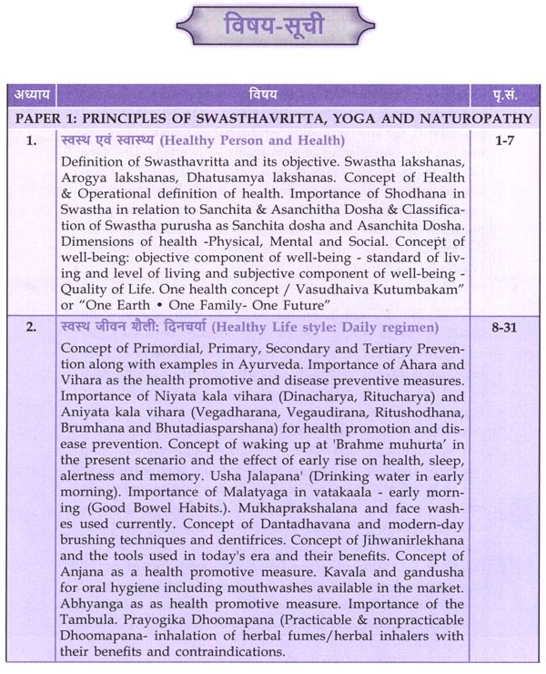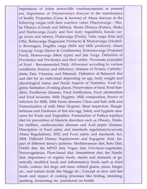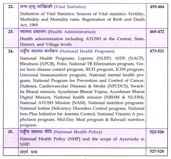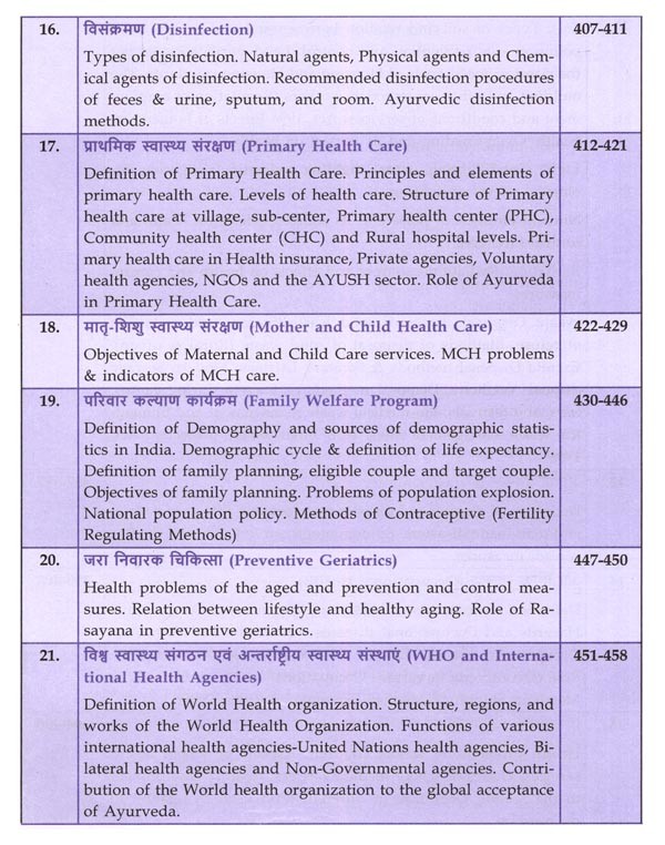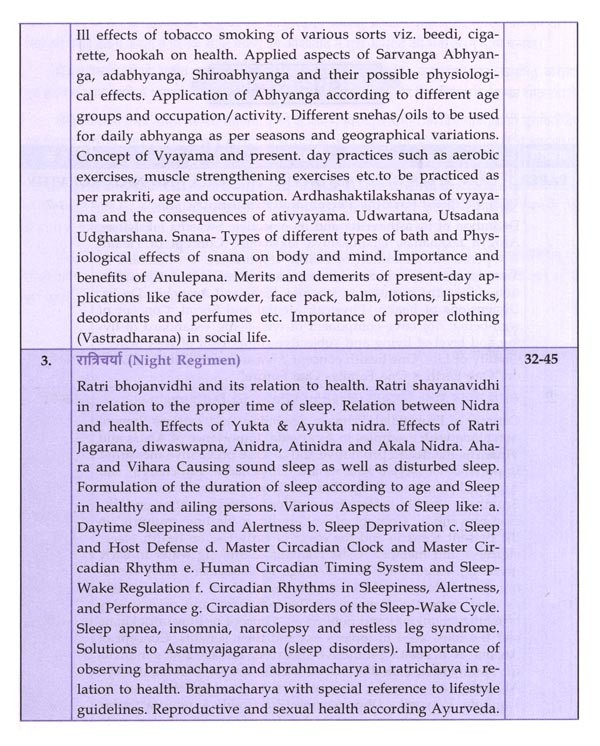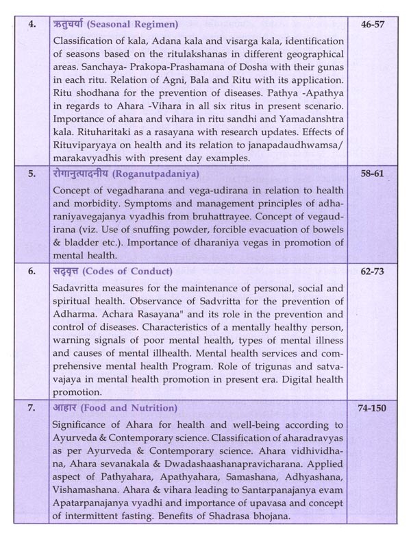 पाठ्यक्रम में जुड़े सभी नए विषयों का समावेश भी उचित स्थान पर किया गया है। जैसे, धातुसाम्यलक्षण, संचित-असंचित दोष, नित्य-अनित्य काल विहार, वसुधैव कुटुम्भकम्, वेगोदीरण, अकाल निद्रा, वयानुसार निद्रा, असात्म्य जागरण, ऋतुशोधन, वयानुसार रसायन, षड्मुखी एवं ज्ञान मुद्रा, Operational Definition of Health, Circadian Rhythm, Sleep Disorders, Digital Health Promotion, Intermittent Fasting, Pro-Biotics & Pre-Biotics, Ayurveda Ahara Regulations, FSSAI Act, Dietary Supplements, Ergogenic Aids, Mediterranean Diet, Keto Diet, DASH Diet, MIND Diet, Vegan Diet, Ovo-Lac-to-Vegetarian, Pescovegetarian, Plant-Based Diet, Intermittent Diet, Nordic Diet, Organic Foods, Genetically Modified Foods, Inflammatory Foods, Instant Foods, Slow & Fast Foods, Cooking Processes, Nutraceuticals, Nutrigenomics, Nutrigenetics, Antioxidant & Immunomodulatory Effects of Rasayana, International Day of Yoga, Role of Ayurveda in Epidemics, Intestinal Infestations, COVID-19, Epidemic Diseases (Amendment) Ordinance Act, The Building and Other Construction Workers Act, Biomedical Waste Management Rules, 2016, Environment Protection Act, 1986, Role of Ayurveda In Occupational Health, The Merchant Shipping / Medical Examination Rules, 2000, Registration of Birth and Death Act, 1969, NPCDCS, Swachha Bharat Mission, Ayushman Bharat Yojana, Ayushman Bharat Digital Mission, National AYUSH Mission (NAM) etc.