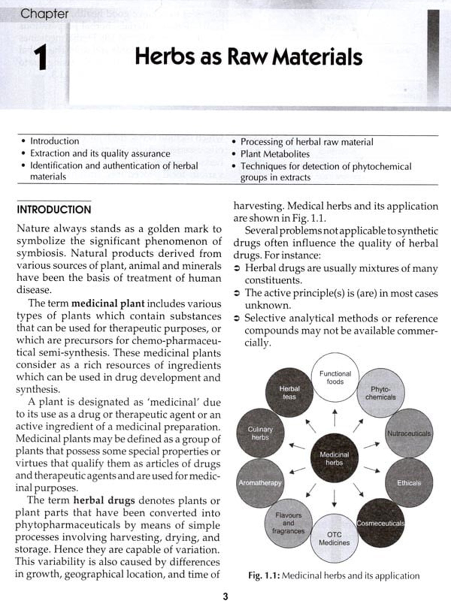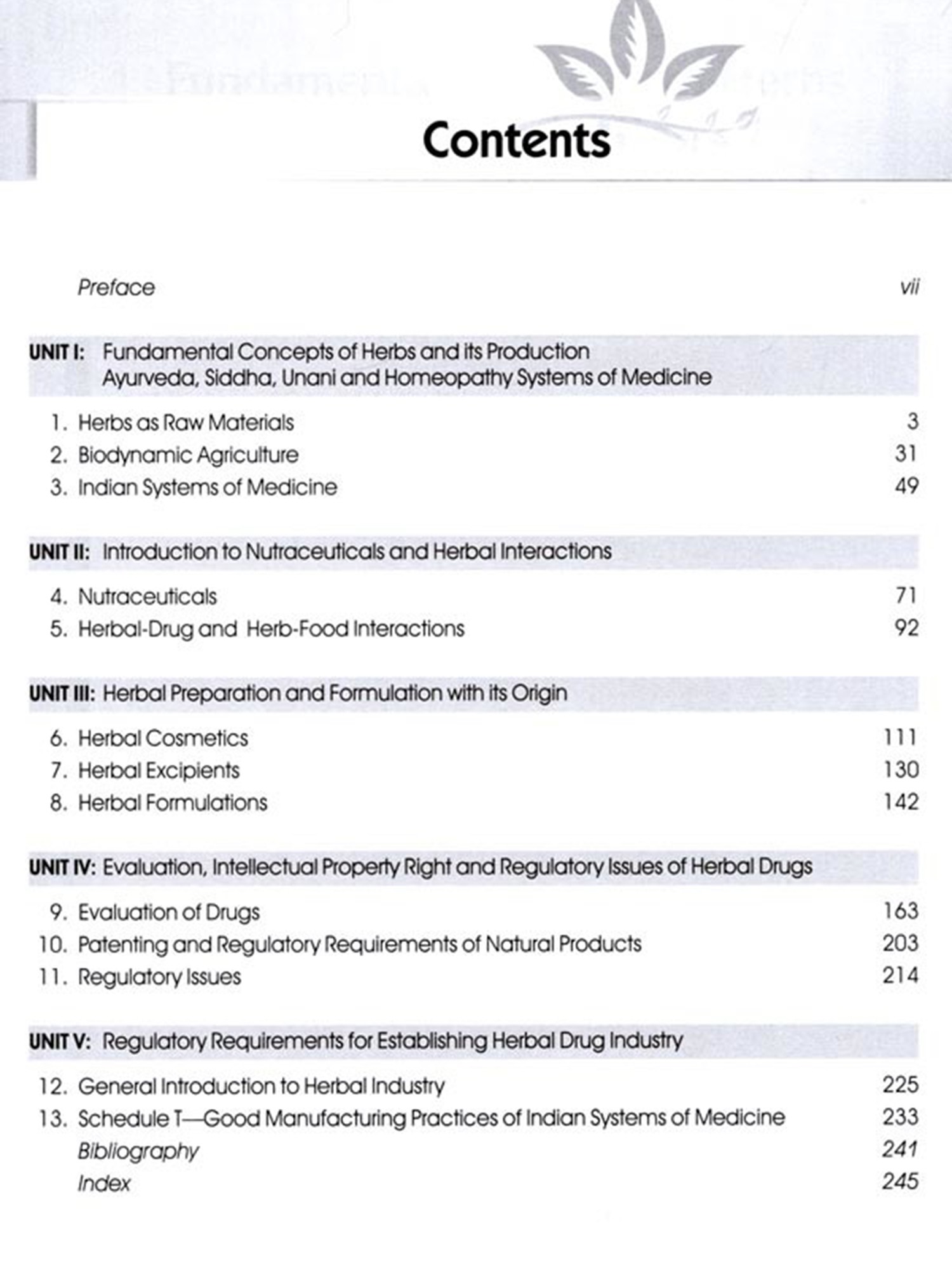 The book comprises five units. Unit I is well laid out and sequentially explores relevant topics like herbs as raw materials, quality assurance in manufacture of herbal medicines and basic principles involved in Ayurveda, Siddha, Unani and homeopathy preparations, and standardization of Ayurvedic formulations, viz, aristas and asawas, ghutika, churna, lehya and bhasma. Unit II provides a number of examples, general aspects, market, growth, scope and types of products available in nutraceuticals and study of herbal drug interactions and their possible side effects of hypercium, kava-kava, ginkobiloba, ginseng, garlic, pepper and ephedra. Unit III focuses on herbal cosmetics, herbal excipients and conventional herbal formulations like syrups, mixtures and tablets and novel dosage forms like phytosomes. Unit IV primarily deals with WHO and ICH guidelines for the assessment of herbal drugs, stability testing of herbal drugs, patenting and regulatory requirements of natural products and regulations in India (ASU DTAB, ASU DCC), regulation of manufacture of ASU drugs under Schedule Z of Drugs and Cosmetics Act. Unit V gives the realistic taste of current art and industrial prespective of the herbal drugs industry, highlighting present scope and future prospects. A brief account of plant-based industries and institutions involved in work on medicinal and aromatic plants in India.